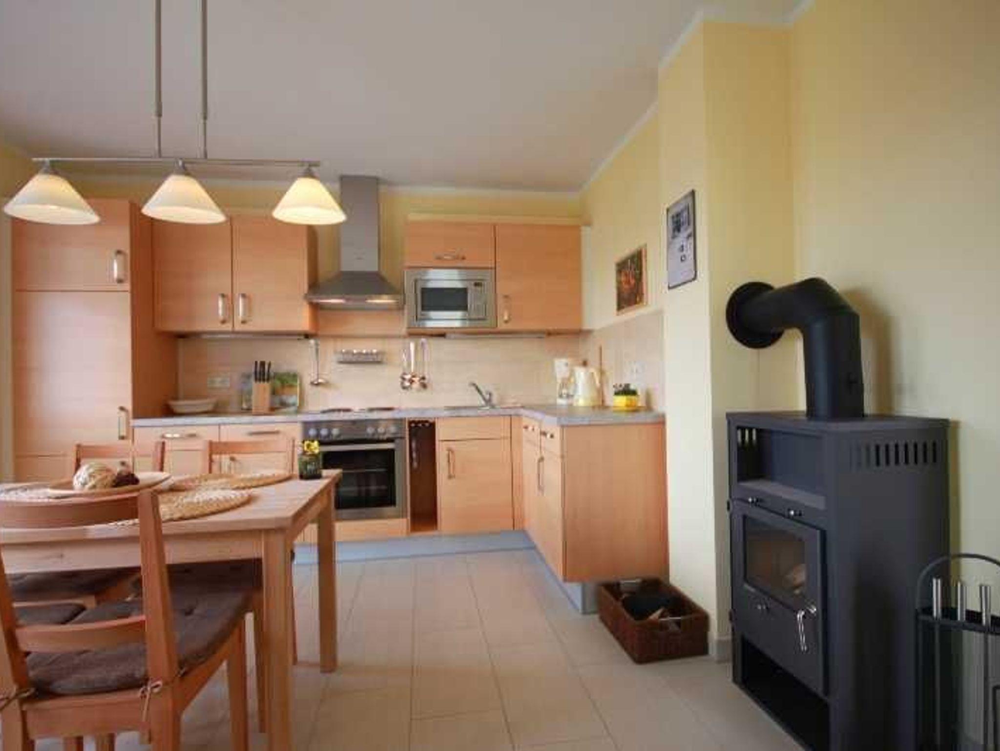 In einem Schlafzimmer befinden sich zwei Einzelbetten und ein TV-Gerät, im zweiten Schlafzimmer steht ein komfortables Doppelbett für Sie bereit. Im lichtdurchfluteten Wohn-Essraum ist eine voll ausgestattete Einbauküche mit einem Vier-Kochplatten-Herd. Für Gemütlichkeit sorgen die Fußbodenheizung und der Kamin (Kaminholz muss selbst organisiert werden). Ein Duschbad gehört selbstverständlich auch zu der Ferienwohnung.