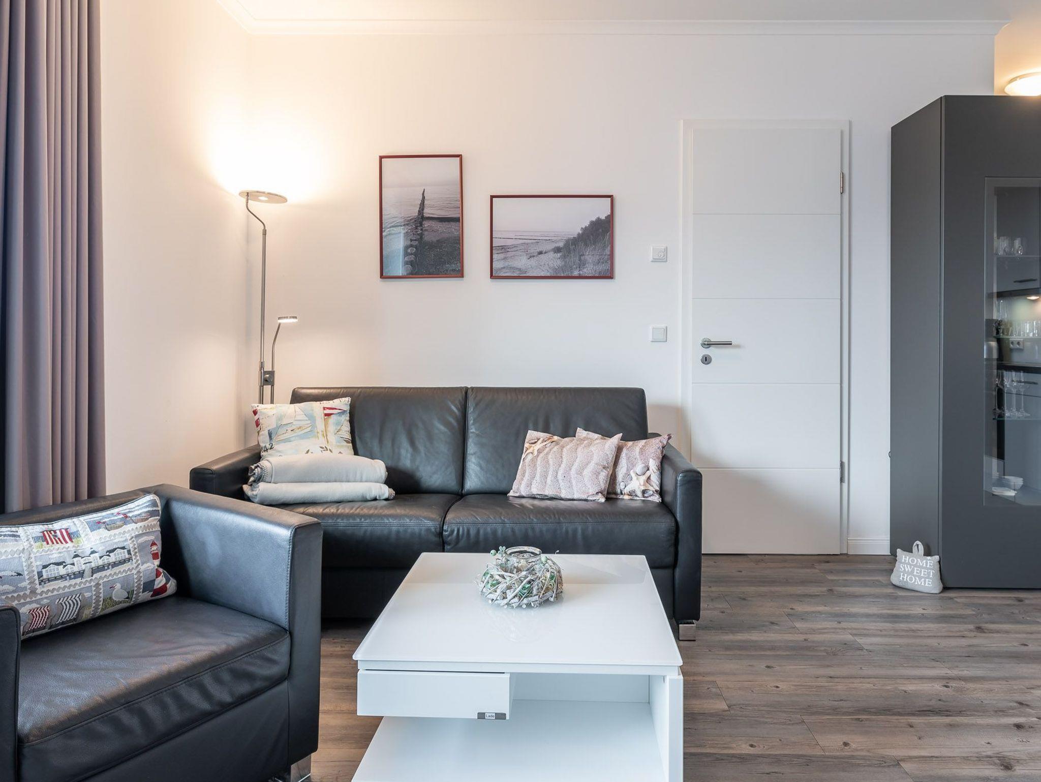 Diese Ferienwohnung ist für max. zwei Erwachsene und zwei Kinder (bis 15 Jahre) eingerichtet und befindet sich im ersten Obergeschoss der Residenz Am Meer. Das Schlafzimmer ist mit einem Doppelbett (durchgehende Matratze / 1,80 m), einer Einbauschrankwand und einem Flatscreen-TV ausgestattet. Vom Wohn- sowie vom Schlafbereich haben Sie Zugang zum Balkon. Verdunkelungsgardinen sind in beiden Zimmern vorhanden. Der schöne Nord-Balkon ist mit einem großen Tisch mit vier Stühlen und einem weiteren kleinen Tisch mit zwei Barhockern ausgestattet. Hier können Sie bei einem kühlen Getränk den Blick zum Meer genießen. Im Wohnraum befinden sich eine bequeme Ledercouch, ein Ledersessel und ein Glastisch. Die Couch kann ausgezogen und als zweites Bett verwendet werden. Zum weiterem Inventar gehören ein Flatscreen-TV mit integriertem Radio, BluRay-Player, ein Sound-System sowie eine kleine DVD- und Büchersammlung. Der offene Koch- und Essbereich verfügt über eine Einbauchküche mit Geschirrspüler, Backofen, Mikrowelle, Cerankochfeld, Kühlschrank mit getrenntem Gefrierfach, Waffeleisen sowie Handrührgerät. Ein ausziehbarer Esstisch mit vier Lederschwingstühlen bietet viel Platz für gemeinsame Mahlzeiten. Das Duschbad ist mit einer bodengleichen Dusche, einem Handtuchwärmer, einem breiten Waschtisch mit Spiegel und einem Fön ausgestattet. Zusätzlich gehört zu der Wohnung noch ein kleiner Abstellraum. Eine Waschmaschine und ein Trockner stehen im separaten Hauswirtschaftsraum im Erdgeschoss des Objekts zur Verfügung (gegen Gebühr / 1,00 Euro Münzen). Auf dem Gelände der Residenz befindet sich zudem ein kostenfreier Stellplatz für Ihren PKW und Fahrradständer.