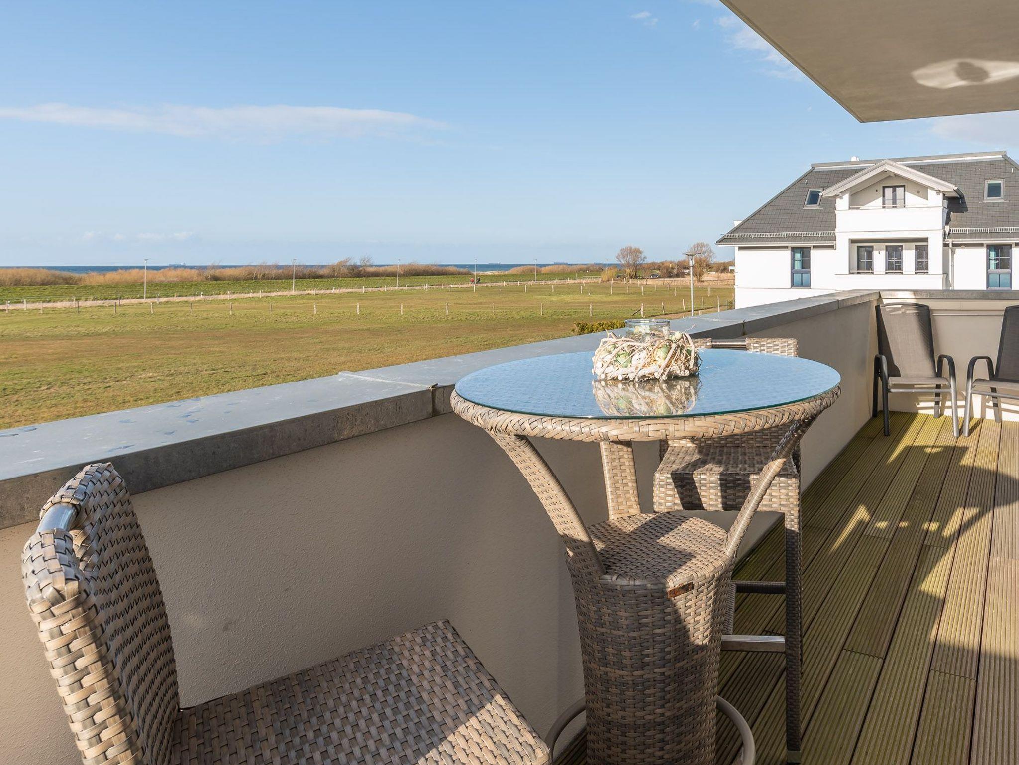 Diese Ferienwohnung ist für max. zwei Erwachsene und zwei Kinder (bis 15 Jahre) eingerichtet und befindet sich im ersten Obergeschoss der Residenz Am Meer. Das Schlafzimmer ist mit einem Doppelbett (durchgehende Matratze / 1,80 m), einer Einbauschrankwand und einem Flatscreen-TV ausgestattet. Vom Wohn- sowie vom Schlafbereich haben Sie Zugang zum Balkon. Verdunkelungsgardinen sind in beiden Zimmern vorhanden. Der schöne Nord-Balkon ist mit einem großen Tisch mit vier Stühlen und einem weiteren kleinen Tisch mit zwei Barhockern ausgestattet. Hier können Sie bei einem kühlen Getränk den Blick zum Meer genießen. Im Wohnraum befinden sich eine bequeme Ledercouch, ein Ledersessel und ein Glastisch. Die Couch kann ausgezogen und als zweites Bett verwendet werden. Zum weiterem Inventar gehören ein Flatscreen-TV mit integriertem Radio, BluRay-Player, ein Sound-System sowie eine kleine DVD- und Büchersammlung. Der offene Koch- und Essbereich verfügt über eine Einbauchküche mit Geschirrspüler, Backofen, Mikrowelle, Cerankochfeld, Kühlschrank mit getrenntem Gefrierfach, Waffeleisen sowie Handrührgerät. Ein ausziehbarer Esstisch mit vier Lederschwingstühlen bietet viel Platz für gemeinsame Mahlzeiten. Das Duschbad ist mit einer bodengleichen Dusche, einem Handtuchwärmer, einem breiten Waschtisch mit Spiegel und einem Fön ausgestattet. Zusätzlich gehört zu der Wohnung noch ein kleiner Abstellraum. Eine Waschmaschine und ein Trockner stehen im separaten Hauswirtschaftsraum im Erdgeschoss des Objekts zur Verfügung (gegen Gebühr / 1,00 € Münzen). Auf dem Gelände der Residenz befindet sich zudem ein kostenfreier Stellplatz für Ihren PKW und Fahrradständer.
