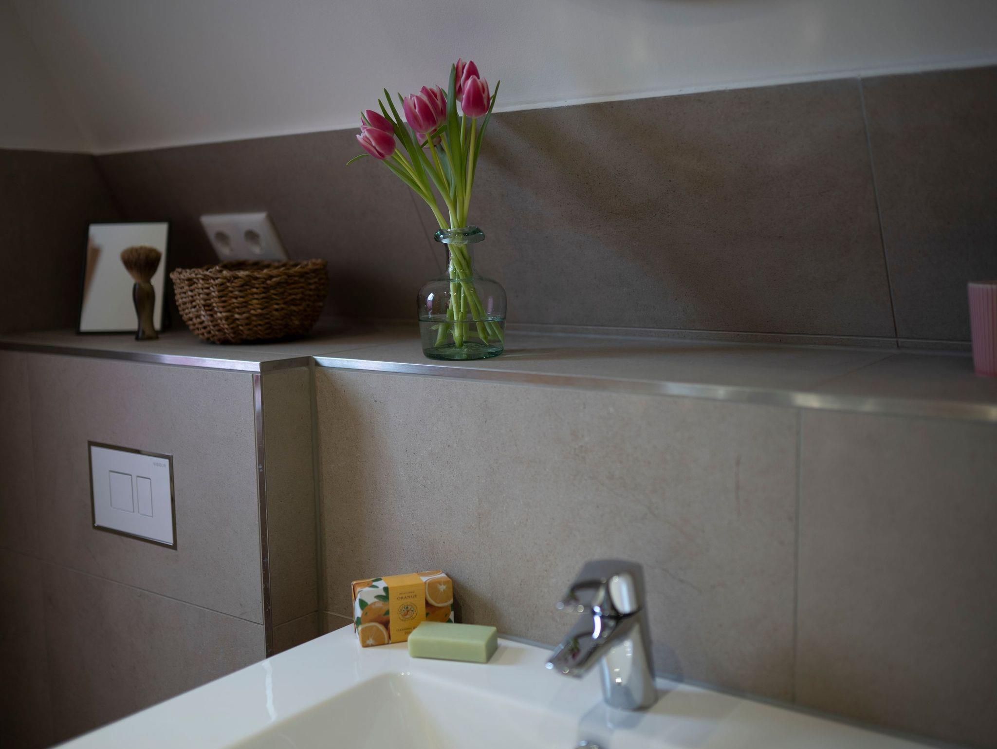 Auch das moderne Duschbad ist eine kleine Wohlfühloase - Steinfliesen in warmen Erdtönen und eine ebenerdige Dusche sorgen für Ihr Wohlbefinden.