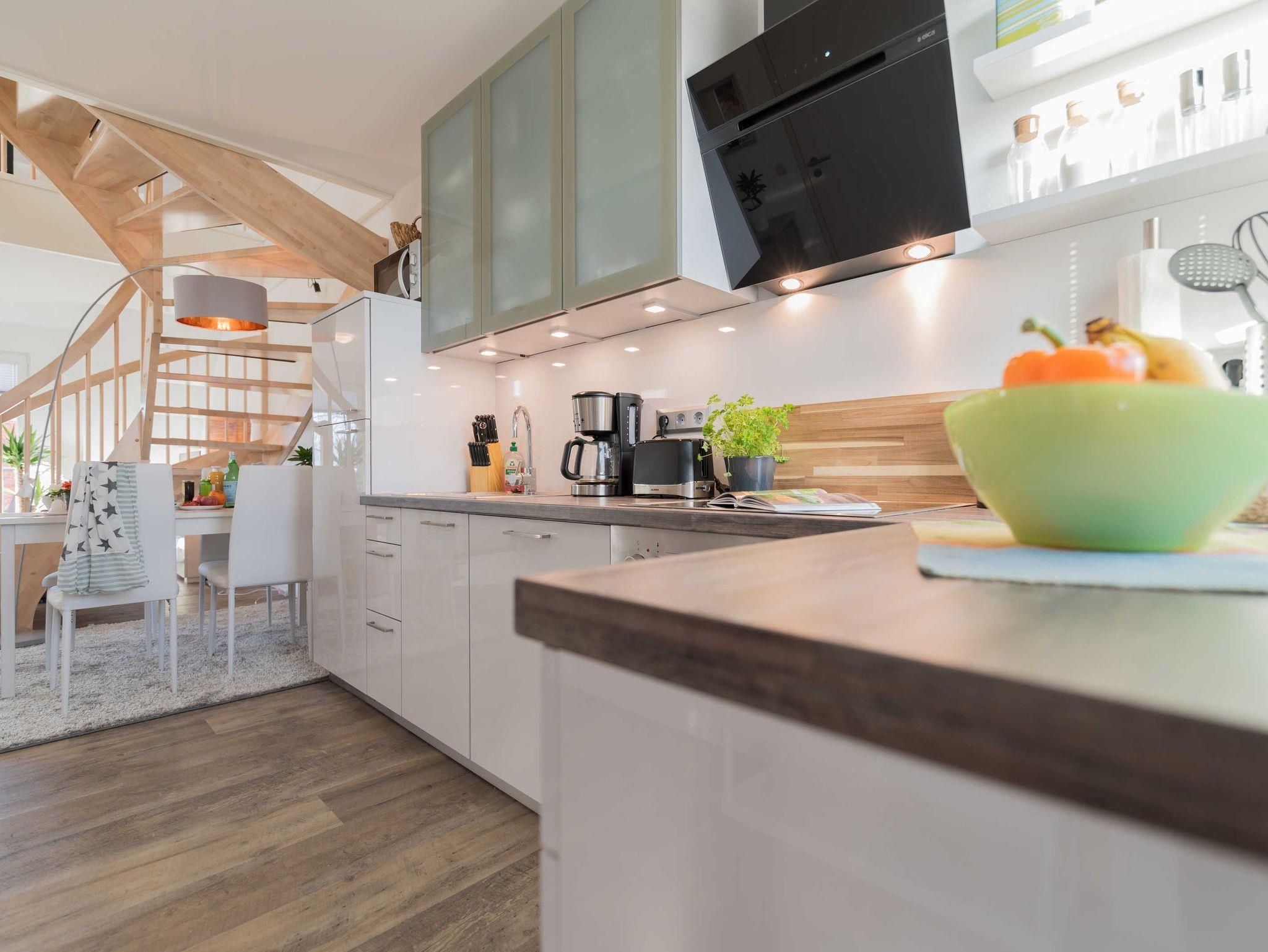 Die hochwertige Einbauküche verfügt über einen großen Kühlschrank mit Tiefkühlfach, Geschirrspüler, 4er-Ceranfeld, Einbau-Herd mit Grillfunktion, Dunstabzugshaube, Kaffeemaschine, Toaster, Wasserkocher sowie Mikrowelle mit Grillfunktion. Der Esstisch mit 4 bequemen Stühlen ist zudem bestens geeignet für gesellige Spieleabende.