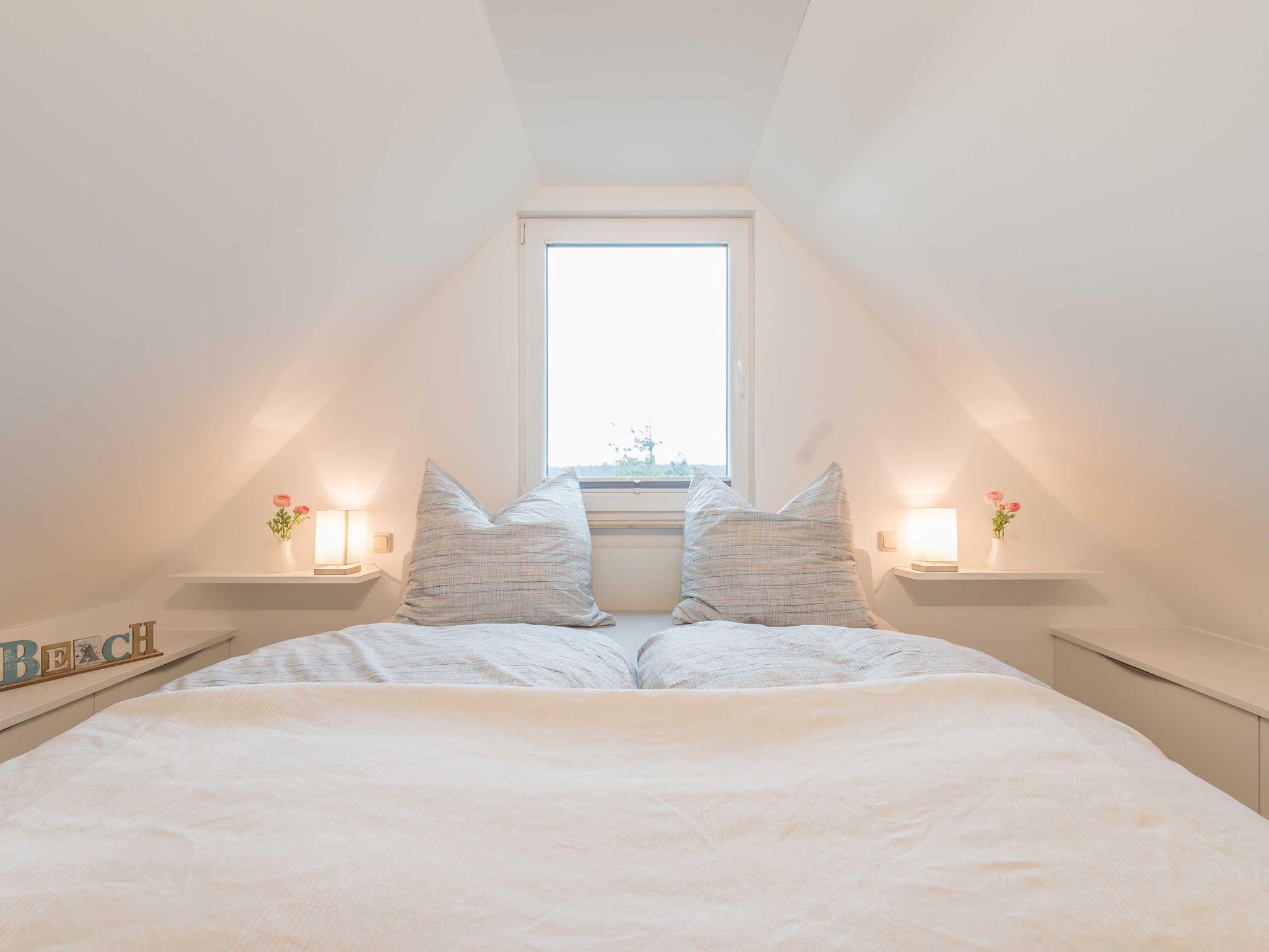 Über eine große Wendeltreppe gelangt man in das Schlafzimmer mit großem Fenster (mit Verdunkelungsplissee).