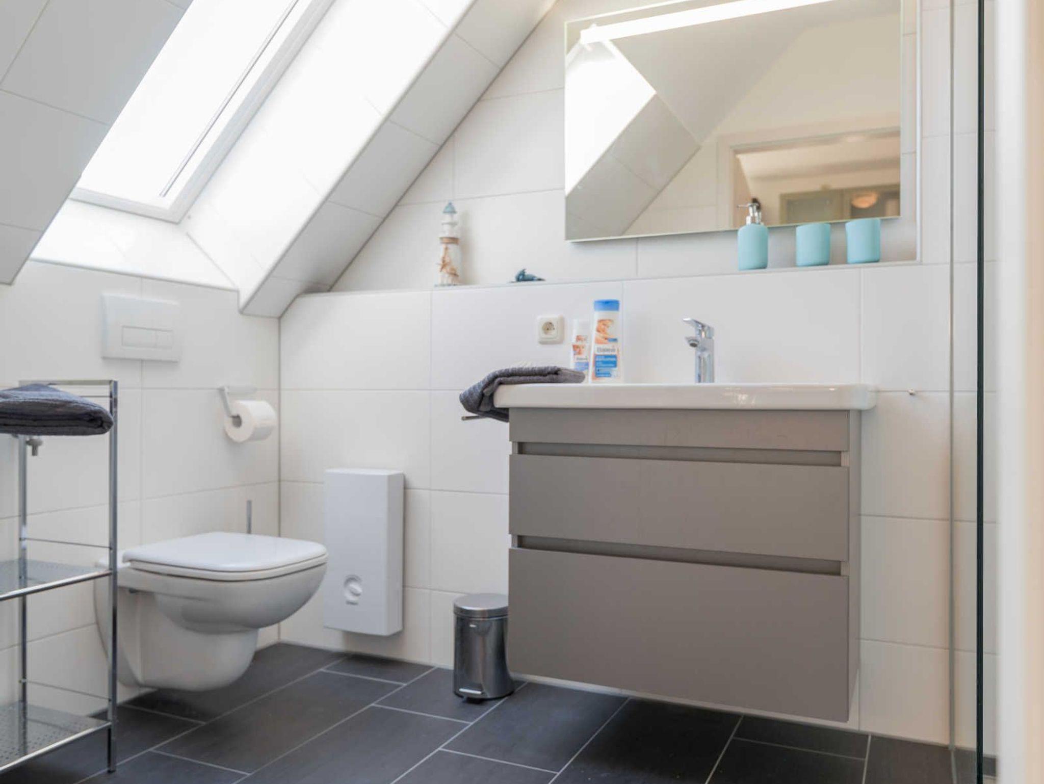 Das helle Badezimmer mit bodengleicher Dusche verfügt über ein großes Fenster mit Plissee, einen großen Waschtisch mit Unterschrank, eine Toilette, Ablage-Regale, einen Handtuchheizkörper, einen Vergrößerungsspiegel und einen Haartrockner.