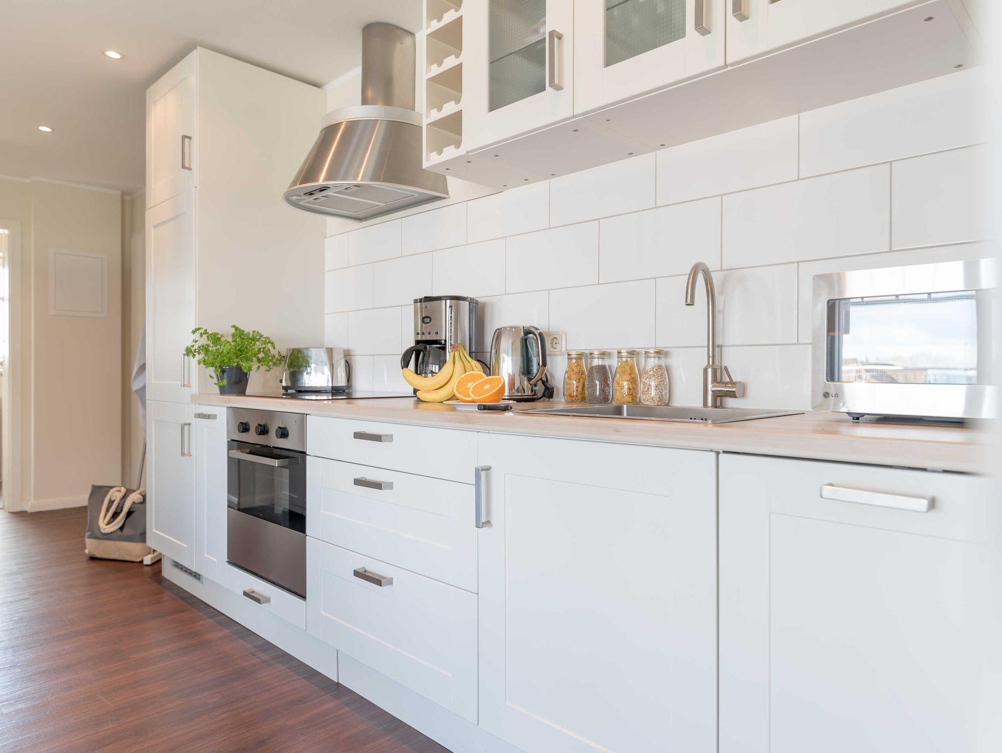 1 Einbauküche mit Geschirrspüler, Kühlschrank ohne Gefrierfach, Kaffeemaschine, Wasserkocher, Toaster, Mikrowelle