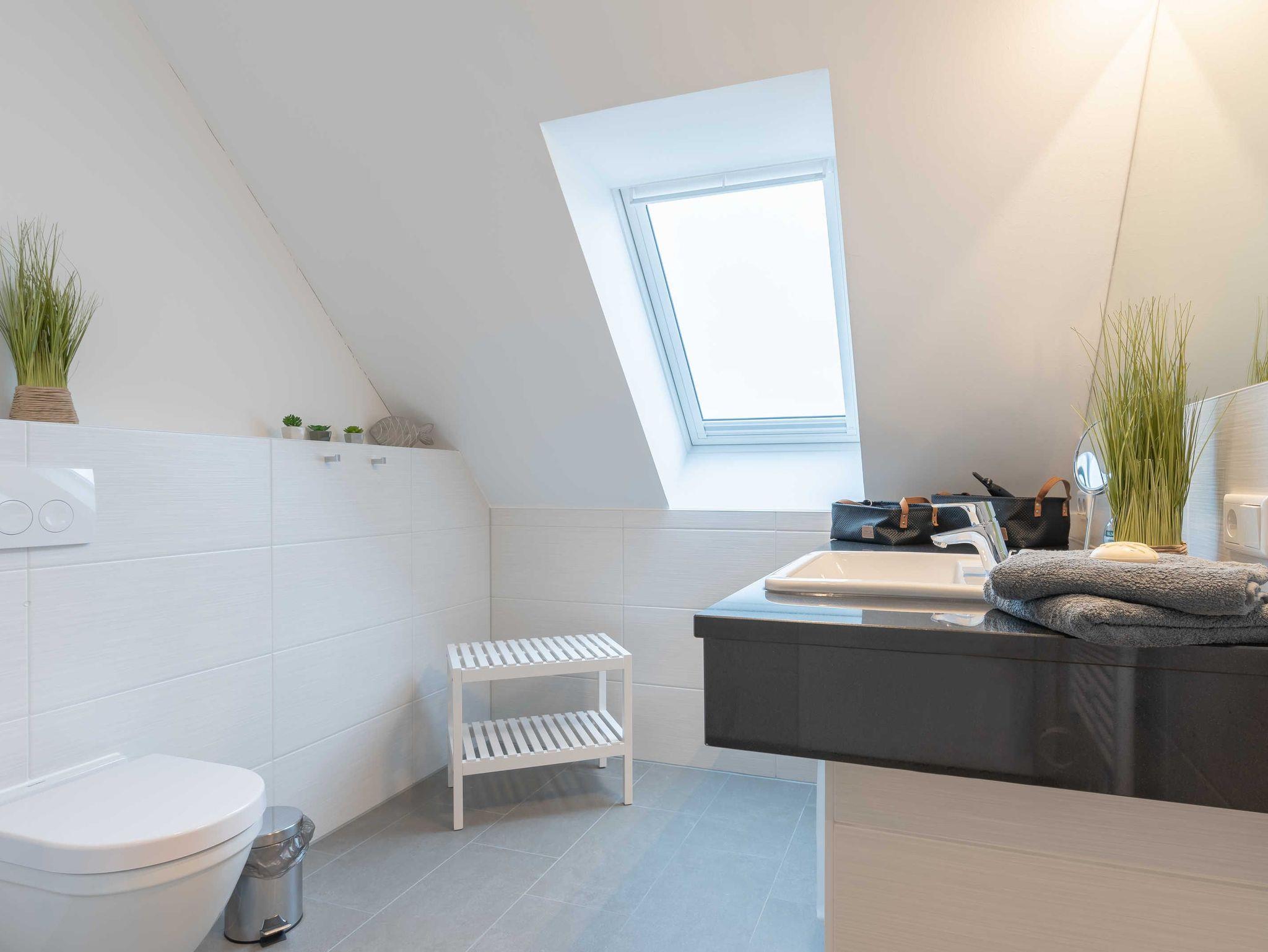 Starten Sie Ihren Urlaubstag im modernen Tageslicht-Badezimmer mit einem Blick in die Morgensonne. Das geräumige Bad verfügt über eine bodengleiche Dusche, einen elektrischen Handtuchheizkörper, einen großzügigen Waschtisch sowie einen Haartrockner und einen Schminkspiegel.