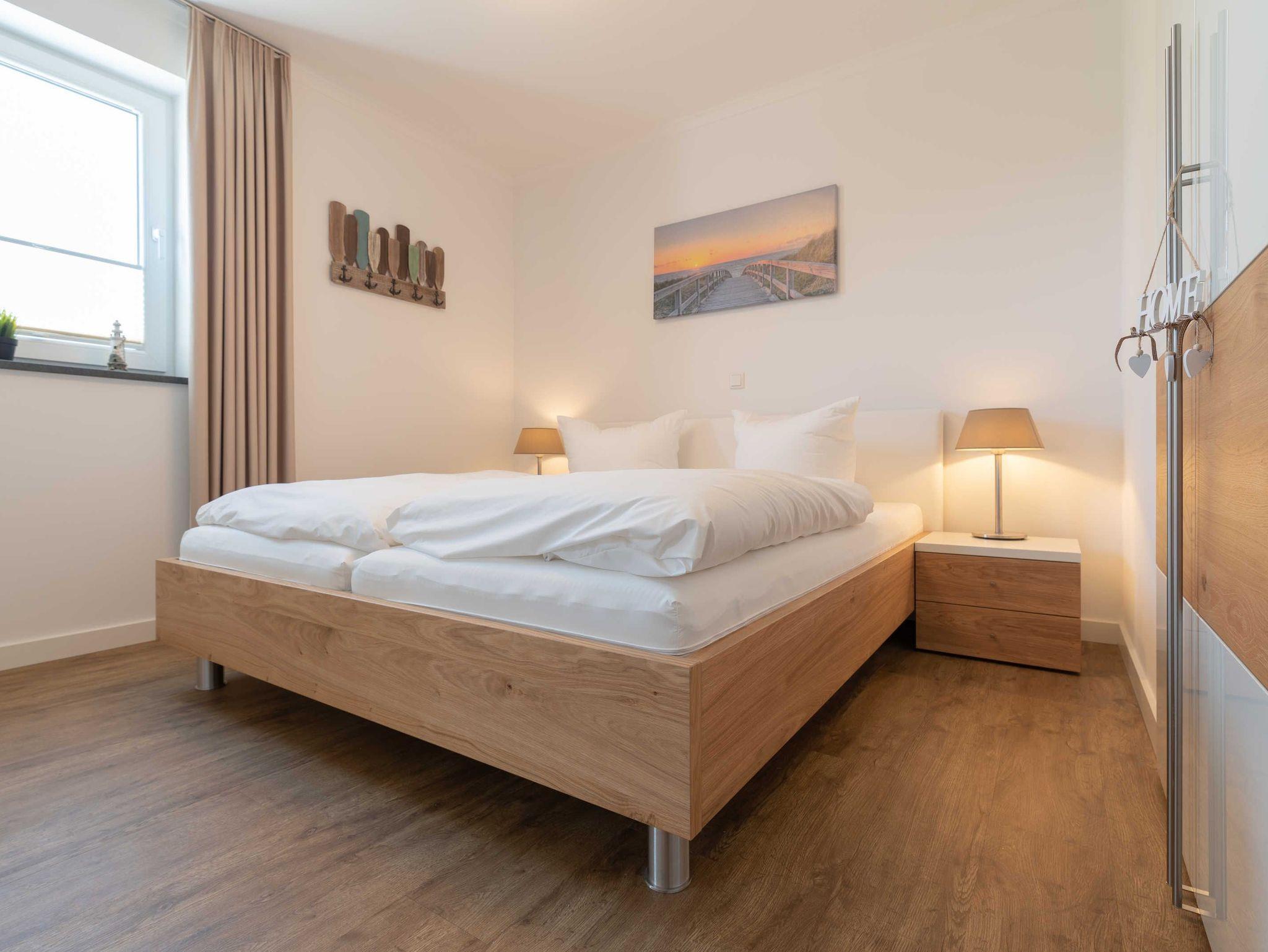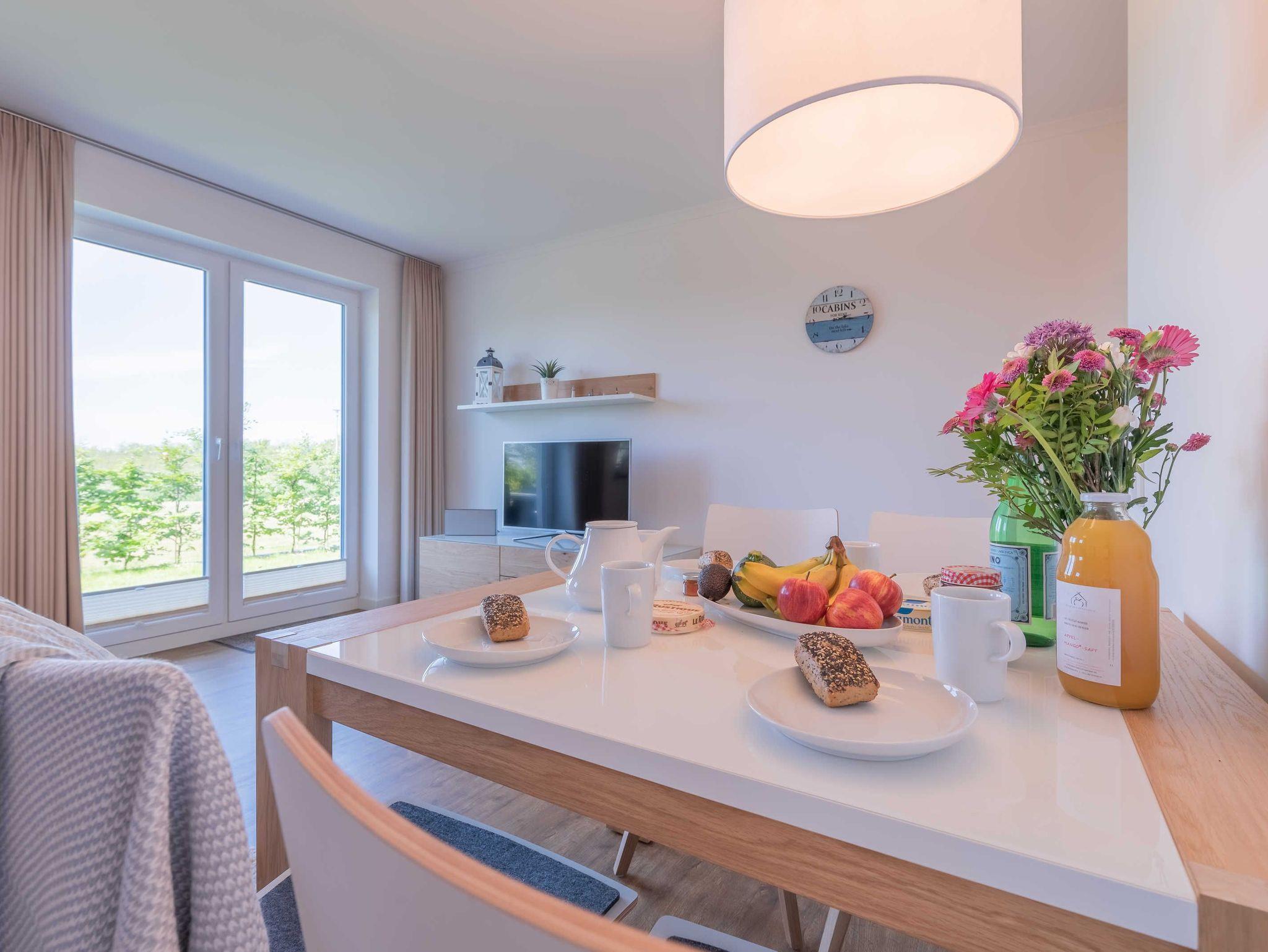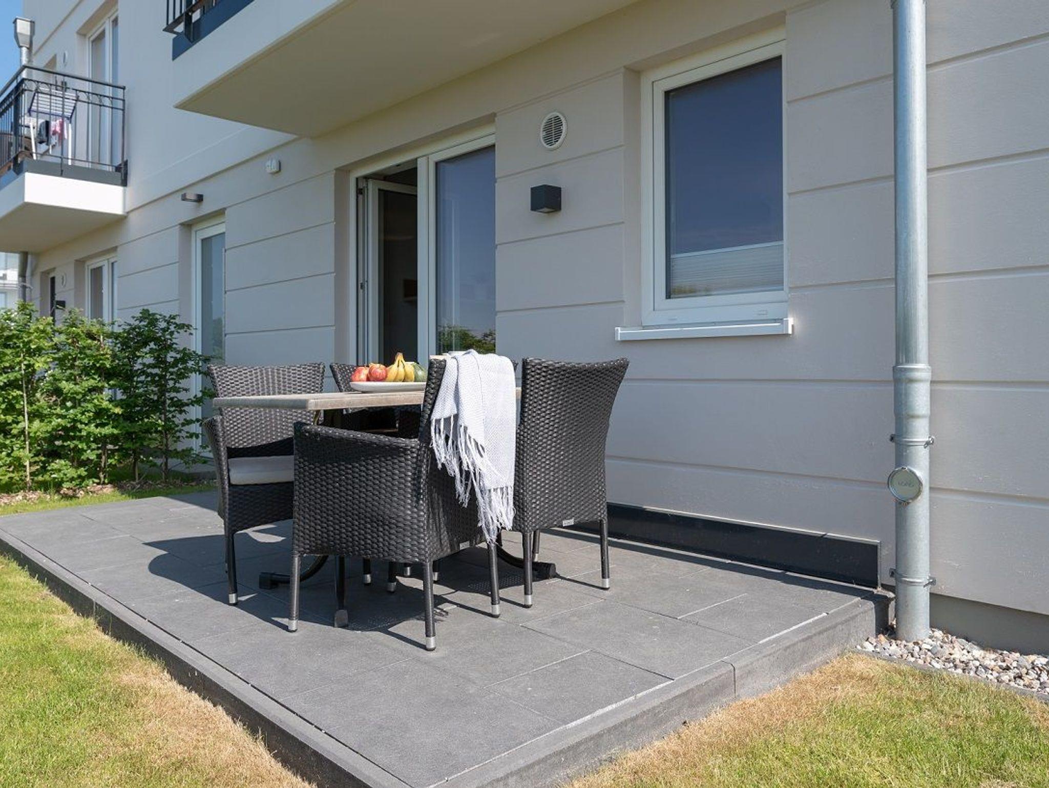 Es erwartet Sie eine Unterkunft mit einem gemütlichen Wohnraum. Hier finden Sie eine bequeme Eckcouch, einen einladenden Essbereich, eine kleine Stereoanlage und einen Flat Screen-TV. Im offenen Kochbereich stehen Ihnen in einer gut ausgestatteten Einbauküche Geschirrspüler, Kühlschrank inklusive Gefrierfach, Mikrowelle mit integriertem Backofen, Kochstelle mit Ceranfeld, Kaffeemaschine, Wasserkocher und Toaster zur Verfügung. Das Schlafzimmer bietet Ihnen ein großes Doppelbett, einen Kleiderschrank mit viel Stauraum und einen Flatscreen-TV. Ein elegantes Duschbad mit einer bodengleichen Dusche, einem großzügigen Waschtisch und Fön findet Sie hier ebenfalls vor. Die Terrasse sorgt mit einem herrlichen Blick auf die Dünen für das entsprechende Urlaubsfeeling unterstützt durch das Meeresrauschen der herrlichen Ostsee. Für erholsame Stunden können Sie hier vier Rattanstühle und einen Tisch zum Lesen und Entspannen nutzen.