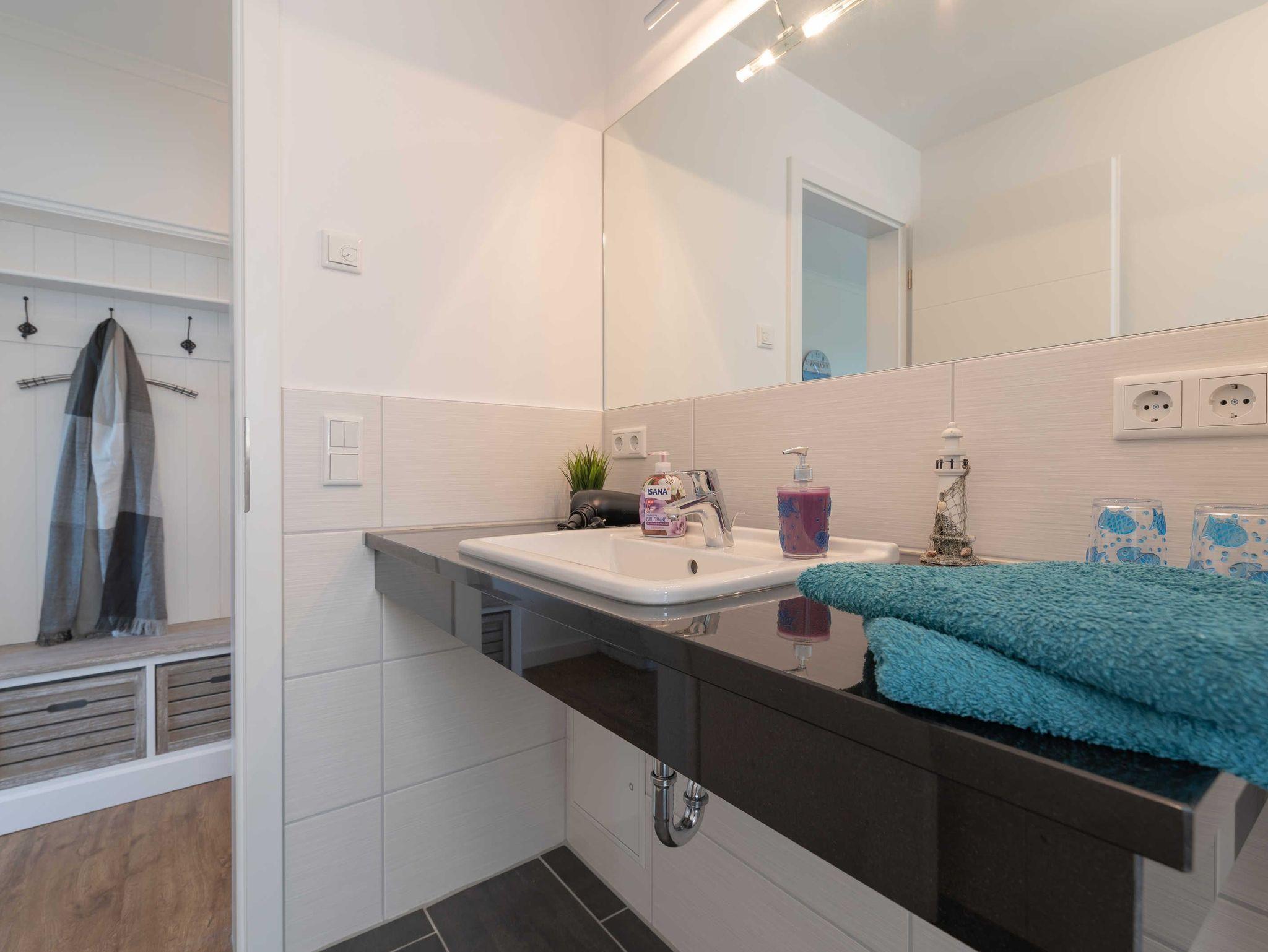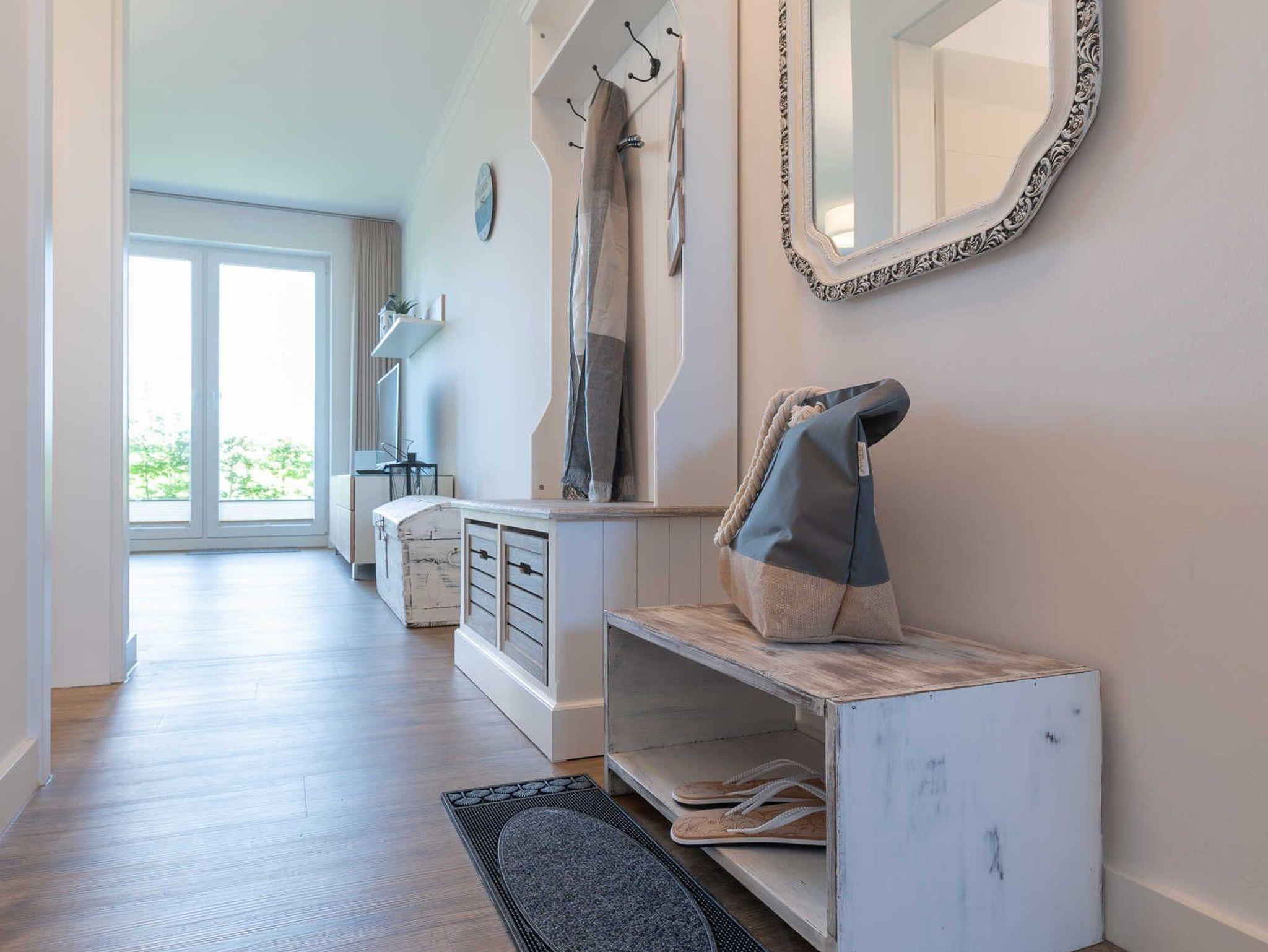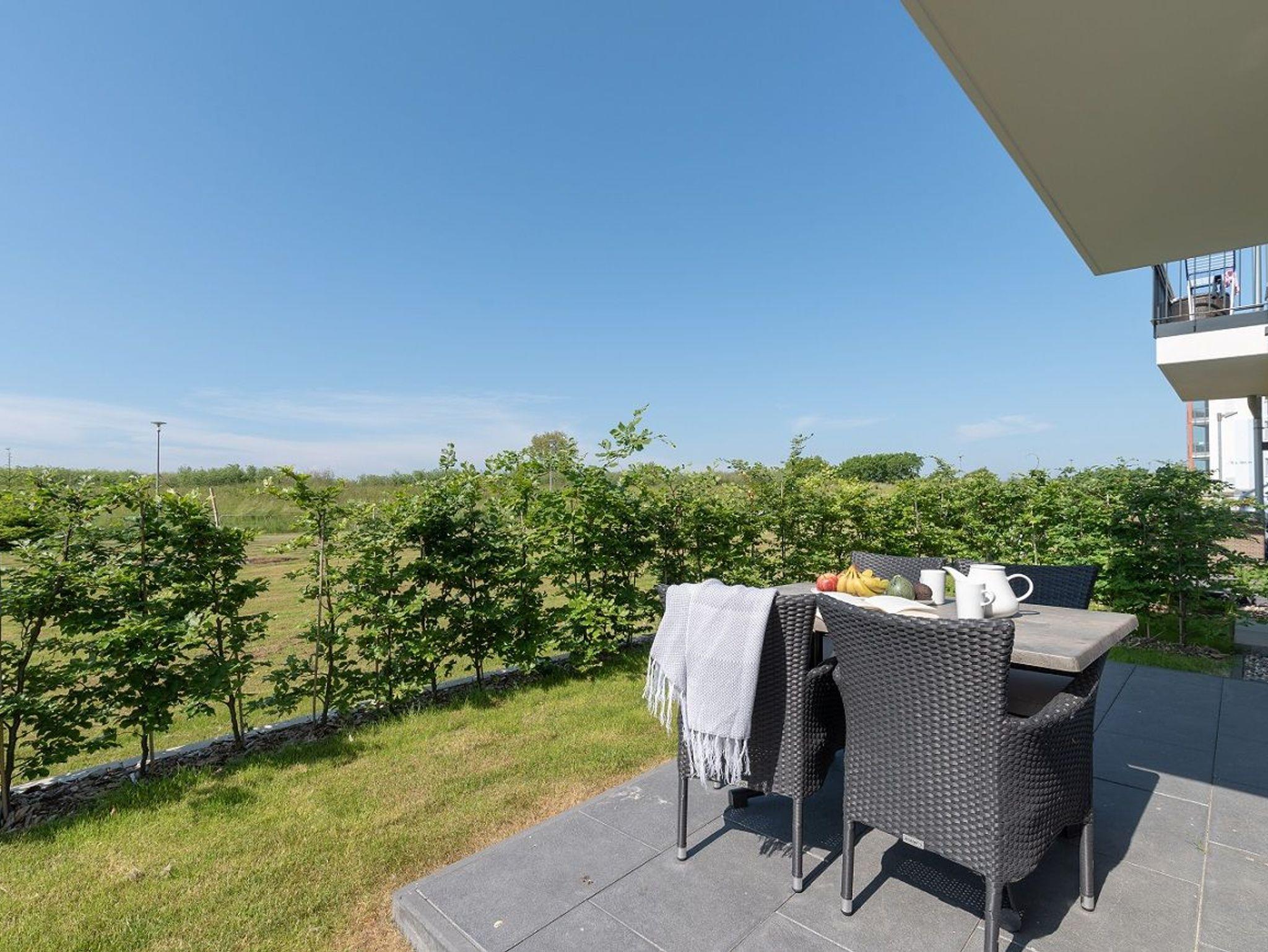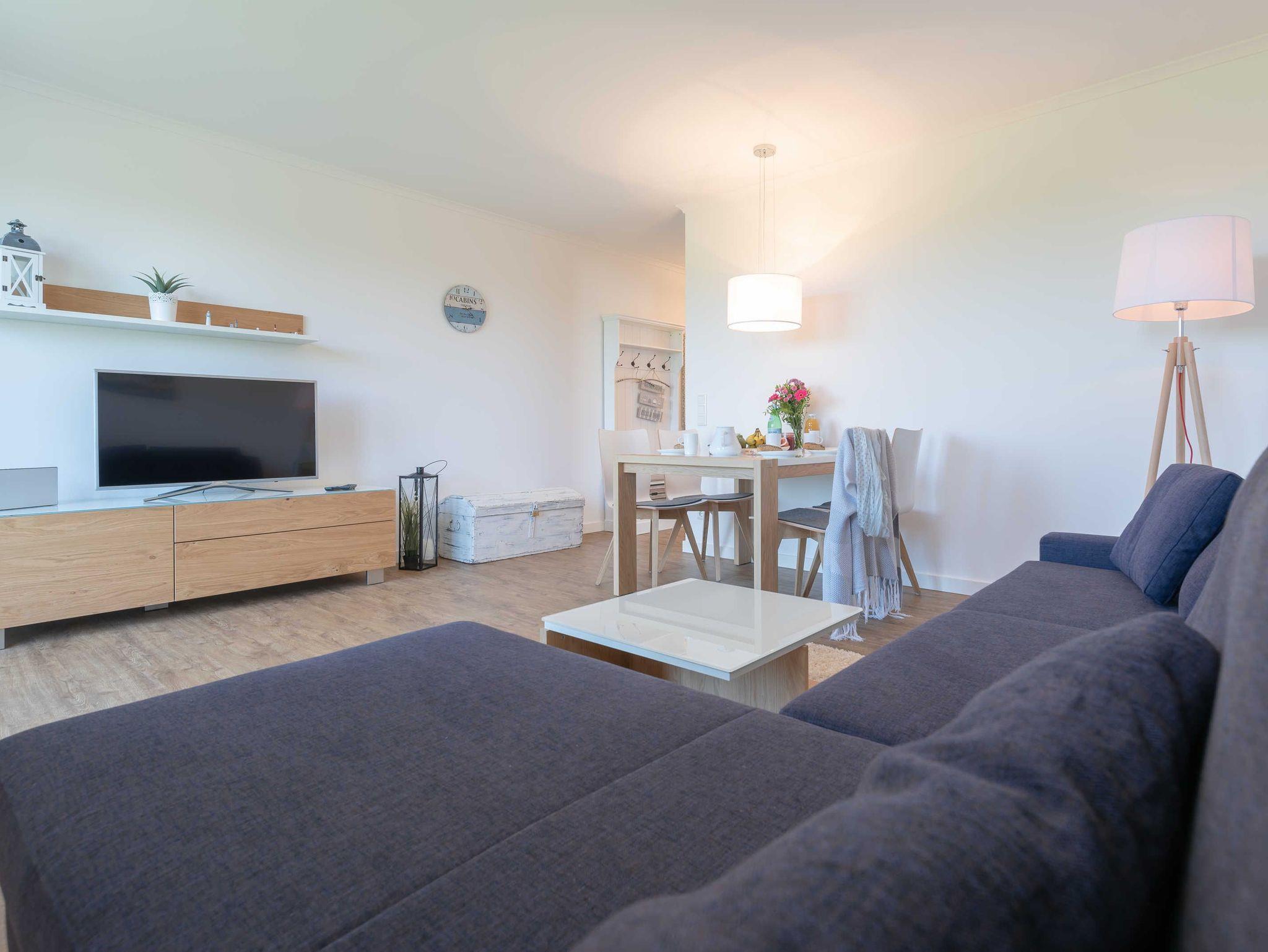 Es erwartet Sie eine Unterkunft mit einem gemütlichen Wohnraum. Hier finden Sie eine bequeme Eckcouch, einen einladenden Essbereich, eine kleine Stereoanlage und einen Flat Screen-TV. Im offenen Kochbereich stehen Ihnen in einer gut ausgestatteten Einbauküche Geschirrspüler, Kühlschrank inklusive Gefrierfach, Mikrowelle mit integriertem Backofen, Kochstelle mit Ceranfeld, Kaffeemaschine, Wasserkocher und Toaster zur Verfügung. Das Schlafzimmer bietet Ihnen ein großes Doppelbett, einen Kleiderschrank mit viel Stauraum und einen Flatscreen-TV. Ein elegantes Duschbad mit einer bodengleichen Dusche, einem großzügigen Waschtisch und Fön findet Sie hier ebenfalls vor. Die Terrasse sorgt mit einem herrlichen Blick auf die Dünen für das entsprechende Urlaubsfeeling unterstützt durch das Meeresrauschen der herrlichen Ostsee. Für erholsame Stunden können Sie hier vier Rattanstühle und einen Tisch zum Lesen und Entspannen nutzen.