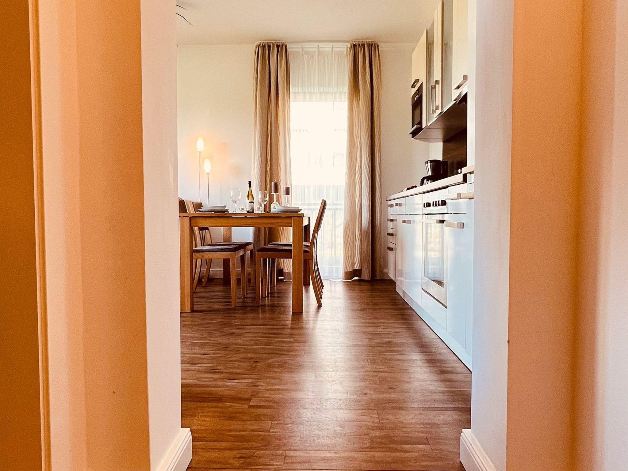 Diese für zwei Personen modern eingerichtete Wohnung liegt nur 50 Meter vom Strand entfernt. Herzstück des Wohn-/ Esszimmers ist ein stilvoller Gas-Kamin, der an kalten Tagen für Gemütlichkeit sorgt. Eine Sitzcouch, ein Esstisch mit Stühlen, ein -TV- Gerät mit DVD-Player und eine Stereoanlage sorgen für leichte Unterhaltung. Für weitere Vergnügungen stehen eine Bücher- und Spielesammlung zur Verfügung. Die offene Einbauküche verfügt über einen Geschirrspüler, einen Kühlschrank mit Gefrierfach, eine Kaffeemaschine, einen Wasserkocher, einen Toaster und eine Mikrowelle. Im Schlafzimmer erwartet Sie ein Doppelbett und ein Kleiderschrank. Das schöne Duschbad besticht mit bodengleicher Dusche, Handtuchtrockner und Föhn. Auf dem Balkon finden Sie Balkonmöbeln und einen Strandkorb. Dieser wird an warmen Sommertagen zu Ihrem Lieblingsort. Von hier aus haben Sie einen freien Blick auf die Promenade. In allen Räumen der Ferienwohnung sorgt die Fußbodenheizung für angenehme Wärme. Zur Wohnung gehören zudem ein kostenfreier Tiefgaragenstellplatz und eine Abstellmöglichkeit für Fahrräder. Bitte beachten Sie die Durchfahrtshöhe von max. 1,90 m in die Tiefgarage. Mit einem Personenaufzug gelangen Sie von der Tiefgarage aus direkt zu Ihrer Wohnung. Im Erdgeschoss der Wohnung befindet sich ein gekennzeichneter Abstellbereich für Kinderwagen. Hier noch einige Hinweise: Ein Wäscheset kann pro Person kostenpflichtig zugebucht werden. Eine Waschmaschine und ein Trockner stehen im separaten Hauswirtschaftsraum im Untergeschoss der Villa zu Ihrer Verfügung (gegen Gebühr / 1,00 Euro Münzen). Wäscheset, Kinderreisebett und Kinderhochstuhl können kostenpflichtig mitgebucht werden. Es handelt sich um eine Nichtraucherwohnung. Das kostenfreie WLAN in der Unterkunft ist ausschließlich für die Verwendung von Social Media und den Austausch von Bildern mit Familie und Freunden gedacht. Die Nutzung zum Streamen von Filmen ist nicht vorgesehen. Es sind keine Haustiere erlaubt. Sichern Sie sich einen der begehrten Strandkörbe nur ein paar Meter entfernt von den rauschenden Wellen der Ostsee (Anfang Mai - Ende August) und buchen Sie jetzt zu besonderen Konditionen (12,00 Euro pro Tag oder 75,00 Euro pro Woche.)