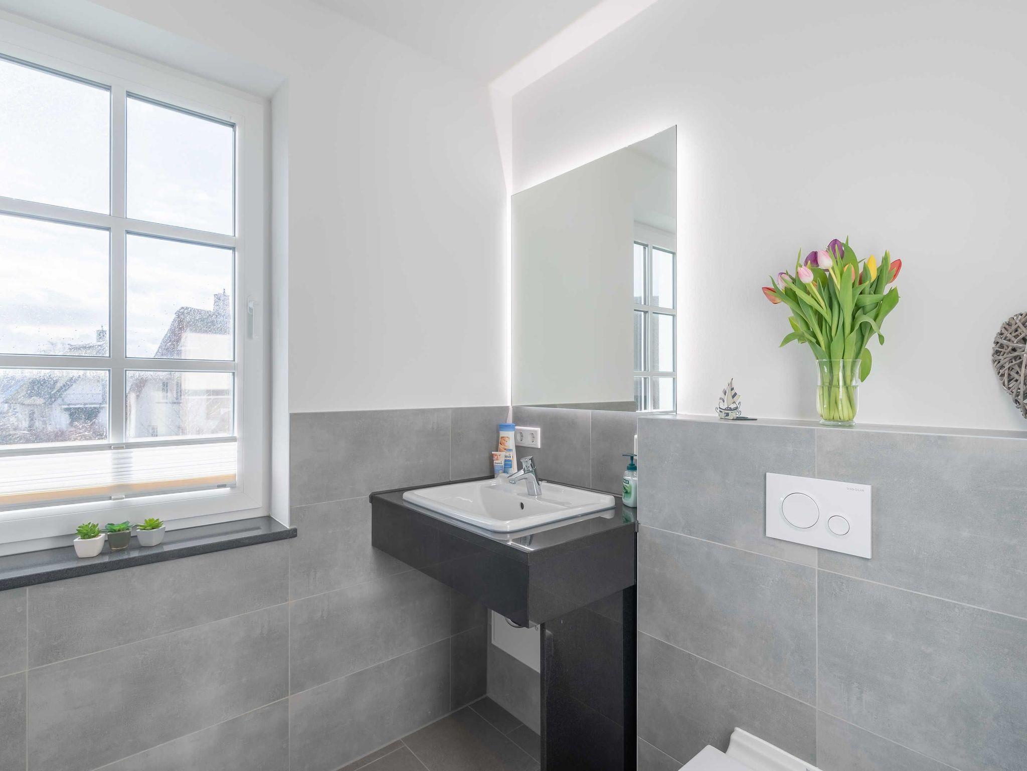 Das Badezimmer mit bodengleicher und geräumiger Dusche verfügt über einen Waschtisch mit Spiegel und Toilette. Ein Fenster sorgt für die nötige frische Luft nach dem Duschen.