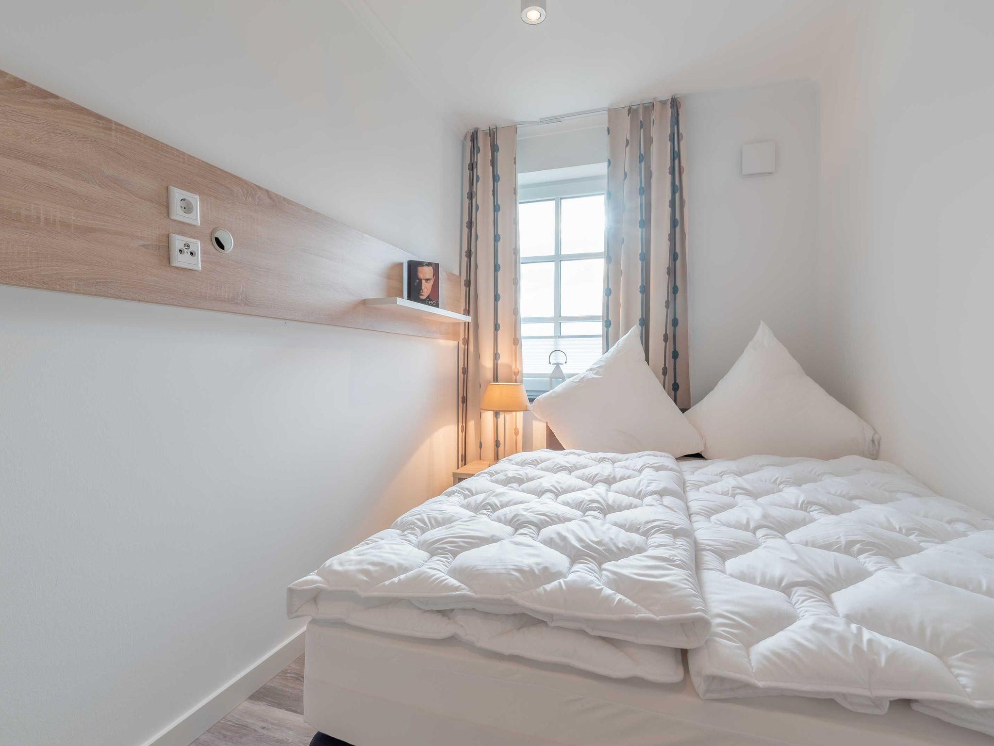 mit einem Flat-TV ausgestattet. Im zweiten Schlafzimmer stehen ein weiteres gemütliches Boxspringbett (140 x 200 cm) und ein Kleiderschrank. Beide Schlafzimmer sind mit Verdunklungsgardinen ausgestattet.