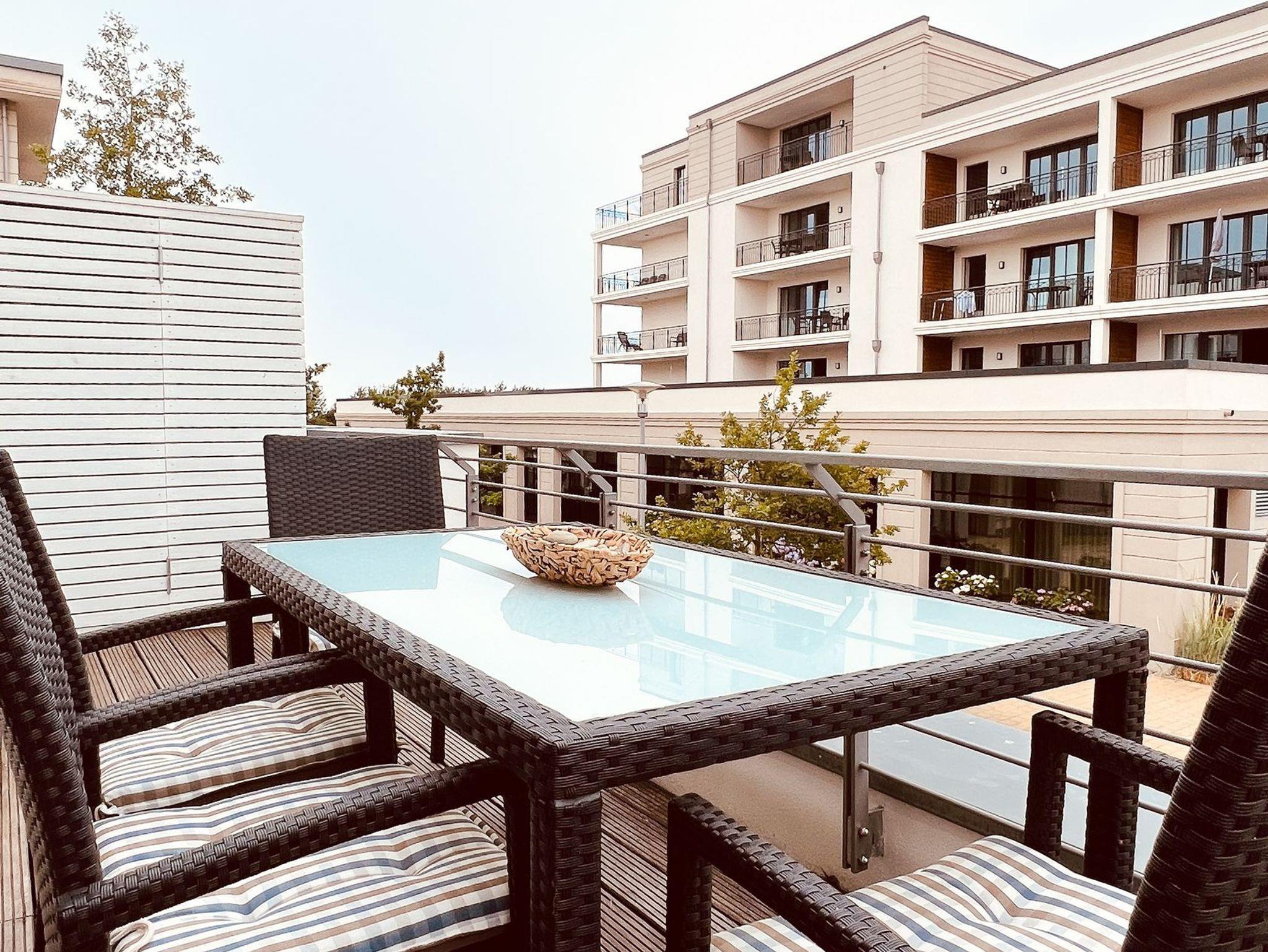 Der Wohnbereich dieser modernen und großzügig eingerichteten Ferienwohnung, verfügt über eine L-förmige Schlafcouch, ein TV-Gerät, einen kleinen Bestelltisch und eine Midi-Stereoanlage. Der Esstisch mit vier Stühlen eignet sich auch für einen Spieleabend. Dieser steht im offenen Bereich zwischen Wohnen und der Küche. Neben der Standardeinrichtung der Küchenzeile finden Sie alles, was Sie benötigen, um vielleicht auch mal ein eigenes Gericht zu kreieren. Daneben gibt es einen Geschirrspüler, ein Cerankochfeld, einen Backofen, einen Kühlschrank und Gefriermöglichkeit sowie eine Mikrowelle. Der Schlafraum empfängt Sie mit einem großen Doppelbett. Für die mitgebrachten Kleidungsstücke finden Sie einen zweitürigen Kleiderschrank. Dieser ist in einem separaten Bereich untergebracht worden. Im Schlafzimmer selbst gibt es noch eine Kommode. Ihre Koffer können ebenfalls in diesem Raum abgestellt werden. Das Duschbad ist mit einer ebenerdig zu begehenden Dusche eingerichtet worden. Neben einer sogenannten „Regendusche“ und einer in die Dusche integrierten Ablage, steht ein beleuchteter großer Wandspiegel, ein Waschtisch, ein Handtuchtrockner sowie ein Föhn bereit. bereit. Auf Ihren Balkon gelangen Sie sowohl vom Wohn- als auch vom Schlafbereich aus. Da der Balkon nach Osten ausgerichtet wurde, bietet sich hier ein ausgiebiges Frühstück in der Vormittagssonne an. Passende und komfortable Möbel erleichtern den perfekten Start in den Urlaubstag. Aus der Tiefgarage gelangen Sie per Aufzug in Ihre Wohnebene. In der Tiefgarage befindet sich auch Ihr kostenloser PKW- Stellplatz. Bitte beachten Sie die Durchfahrtshöhe von max. 1,90 m. Bei Überschreitung der maximalen Durchfahrtshöhe, besteht die Möglichkeit auf einen kostenpflichtigen Parkplatz in unmittelbarer Nähe auszuweichen. Für die angemieteten oder mitgebrachten Fahrräder finden Sie dort auch einen abschließbaren Fahrradabstellraum. Für eine Wäsche der mitgebrachten Bekleidung wurden Waschmaschine und Wäschetrockner im Waschraum, der sich im Erdgeschoss befindet, eingerichtet. Diese sind gebührenpflichtig. Halten Sie bitte 50 Cent- Münzen für die Geräte bereit. Und noch einige Hinweise: Die Ferienwohnung selbst ist eine Nichtraucherwohnung in der keine Haustiere gestattet sind. Das kostenfreie WLAN in der Unterkunft ist ausschließlich für die Verwendung von Social Media und den Austausch von Bildern mit Familie und Freunden gedacht. Die Nutzung zum Streamen von Filmen ist nicht vorgesehen. Sichern Sie sich zusätzlich den Anspruch auf einen der begehrten Strandkörbe nur ein paar Meter entfernt von den rauschenden Wellen der Ostsee (Anfang Mai - Ende August) und buchen Sie jetzt zu besonderen Konditionen (12,00 € pro Tag oder 75,00 € pro Woche).