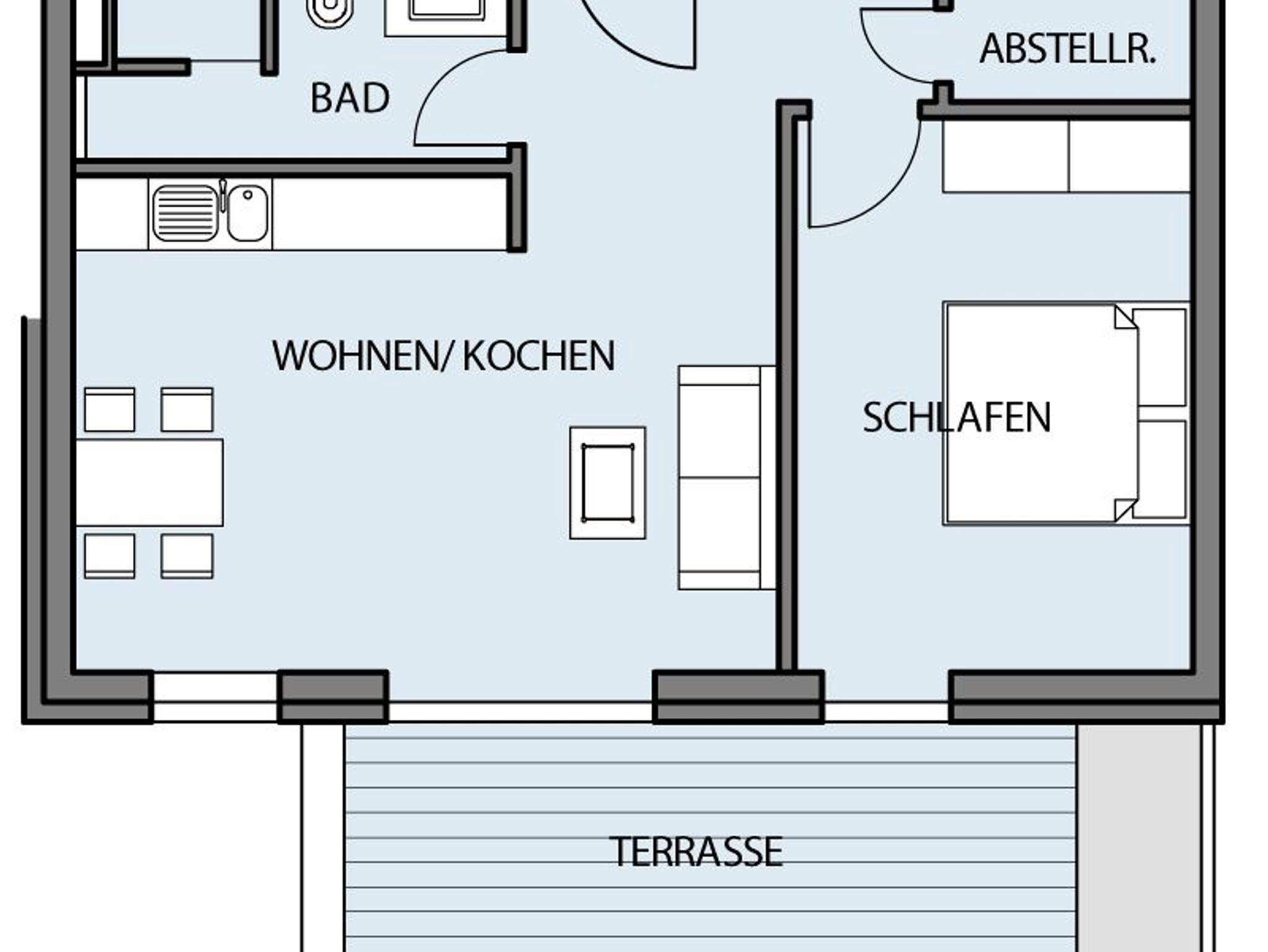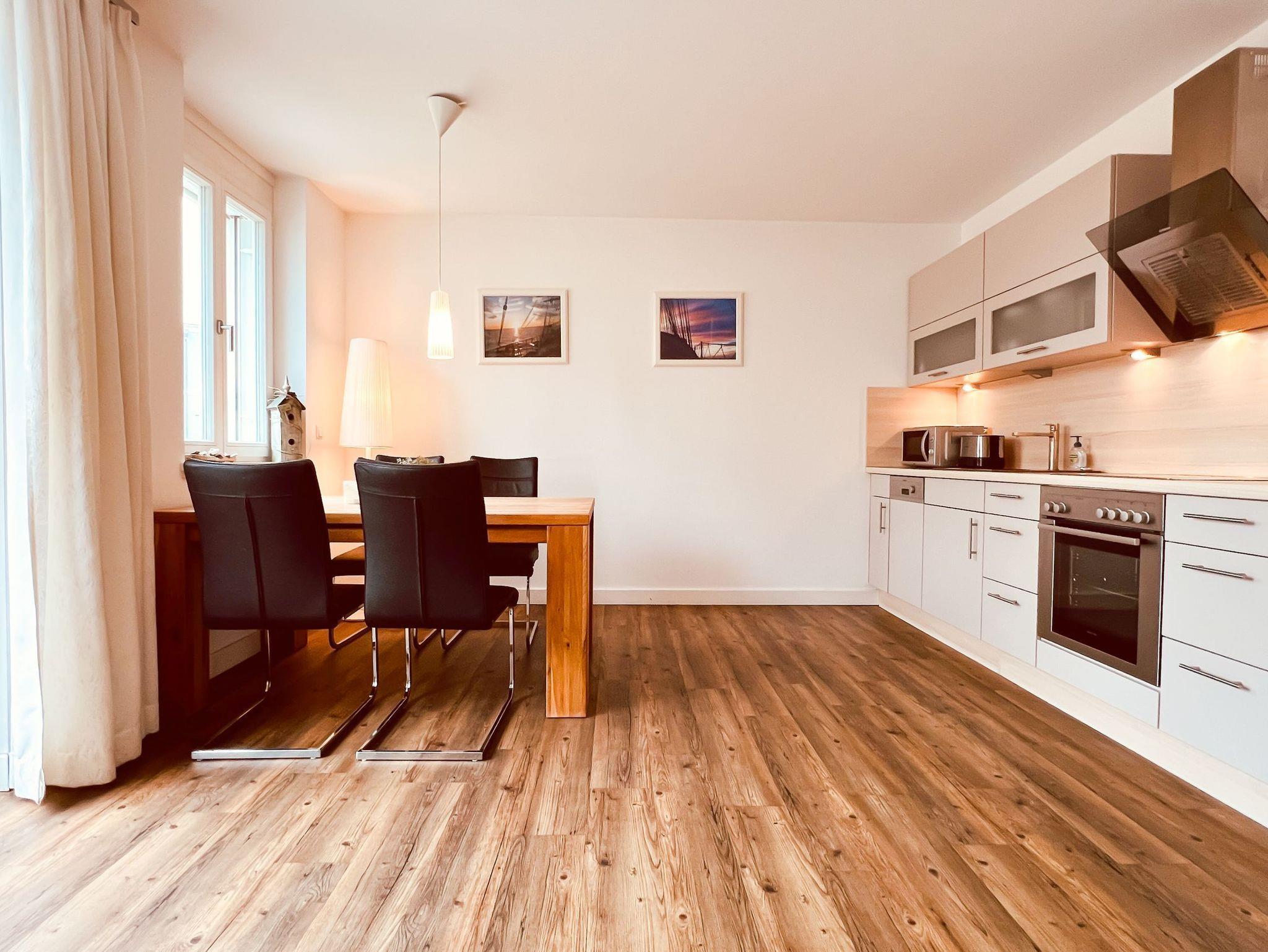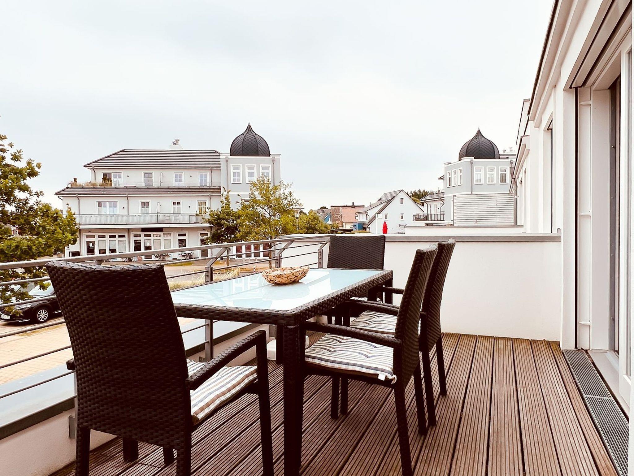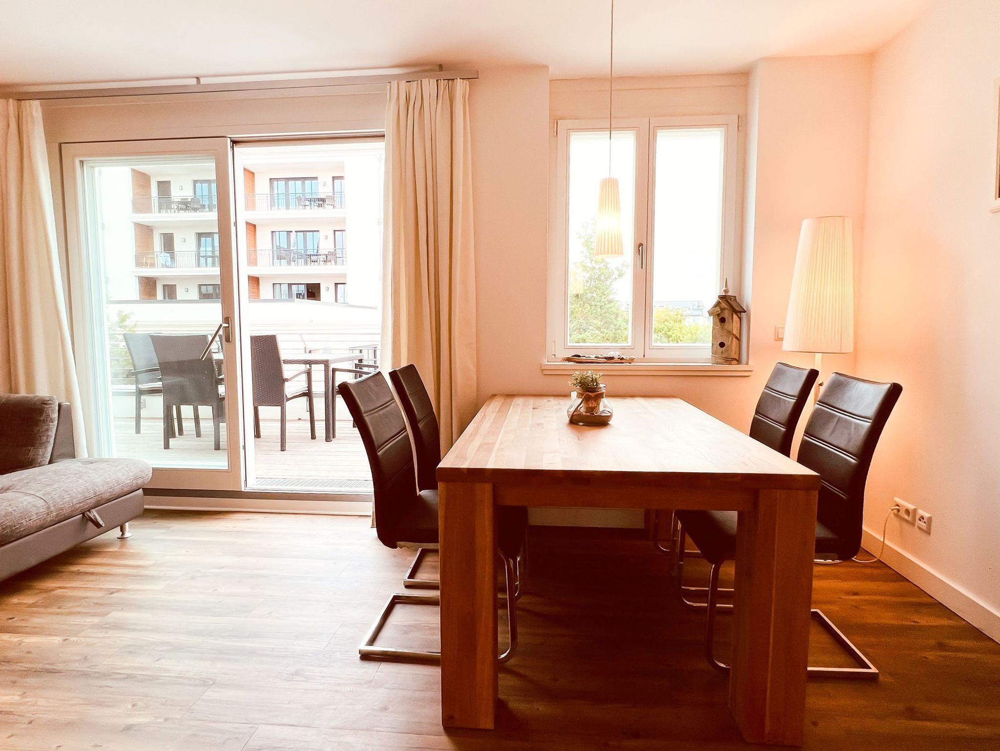 Strandnahe Zwei-Raumwohnung für max. vier Erwachsene und ein Kind mit seitlichem Meerblick, Sauna und Balkon im 1. OG.