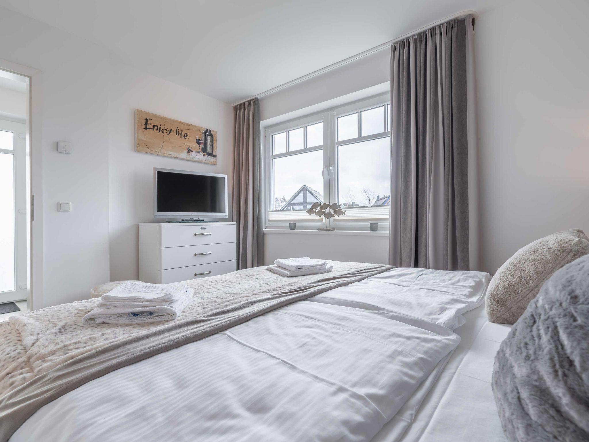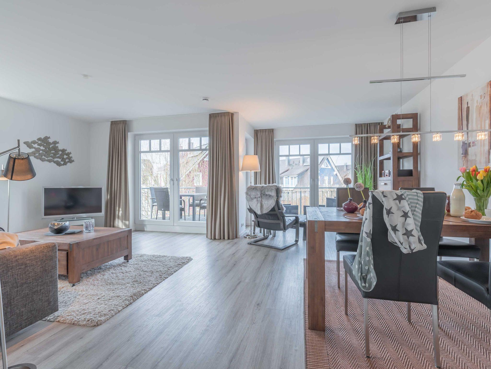 Die moderne und großzügig eingerichtete sonnige Ferienwohnung befindet sich in der ersten Etage der Villa Strandnah, nur 120 m vom Strand entfernt. Im Wohnraum befinden sich eine hochwertige Couchgarnitur mit Schlaffunktion zum Relaxen. Zur Unterhaltung stehen Ihnen ein großer Flachbild TV, eine Hifi-Anlage bluetoothfähig und eine Spielesammlung zur Verfügung. Ein gemütlicher Relaxsessel mit Aussicht wird Ihr Lieblingsplatz. Der offene Essbereich verfügt über einen großen Tisch mit vier Stühlen. Die separate großzügige Küche ist mit einer modernen Einbauküche mit Geschirrspüler, Kühlschrank mit Gefrierfach, Backofen mit Cerankochfeld und Mikrowelle ausgestattet. Neben Kaffemaschine, Wasserkocher und Toaster ist auch eine Tchibo-Cafissimo Kapselmaschine vorhanden. Das modern eingerichtete Schlafzimmer mit dem großzügigen Boxspringbett (2,00 m x 1,80 m) verfügt ebenso über einen großen Flachbild TV und einen geräumigen Schrank mit Kommode. Das helle Duschbad mit Fußbodenheizung und zwei Fenstern hat eine bodengleiche Dusche, einen großen Waschtisch mit Spiegel und Handtuchwärmer. Es gibt eine Abstellkammer für Koffer und Taschen. Der große Süd-West Balkon lädt zum Verweilen ein.
