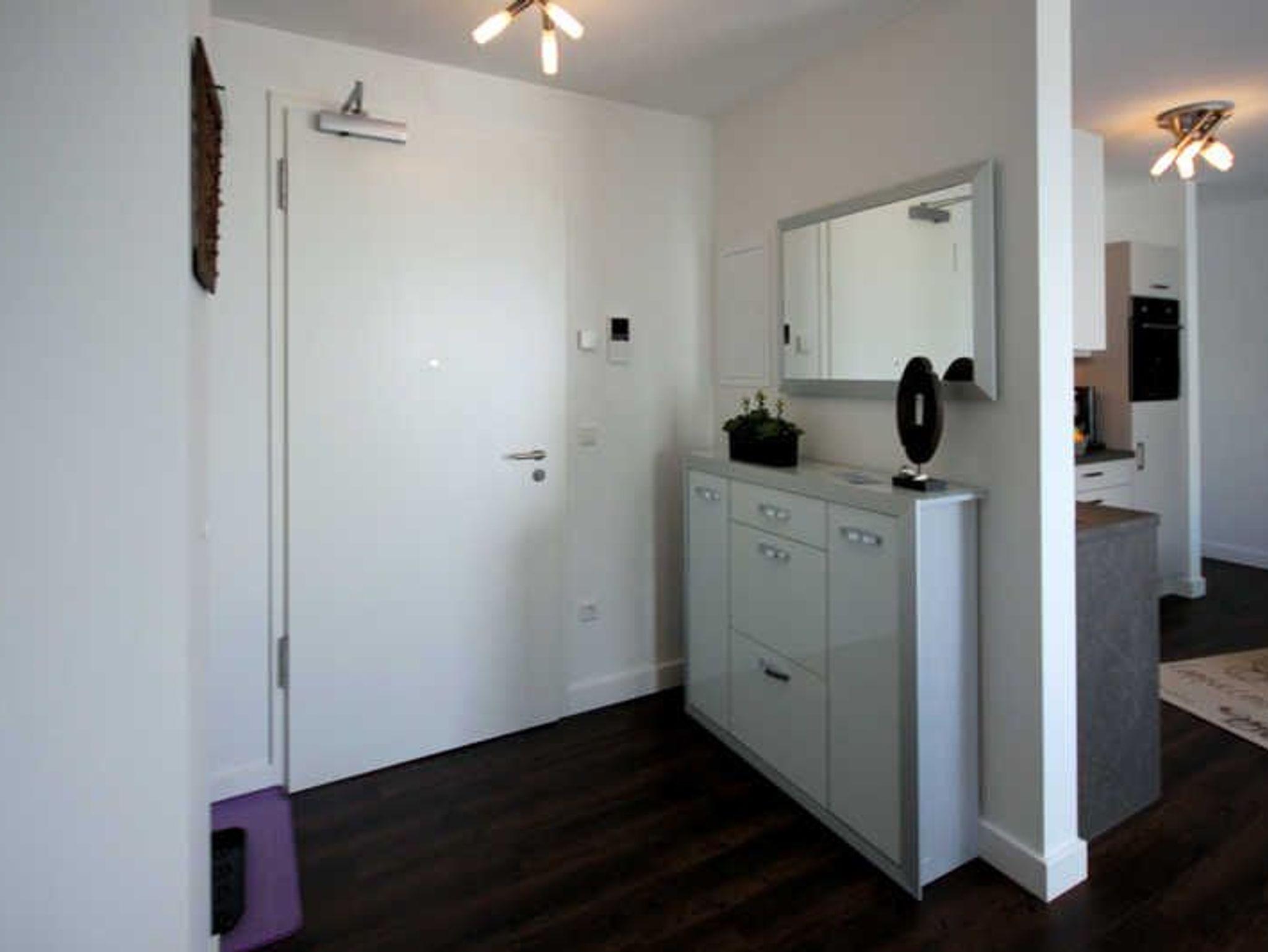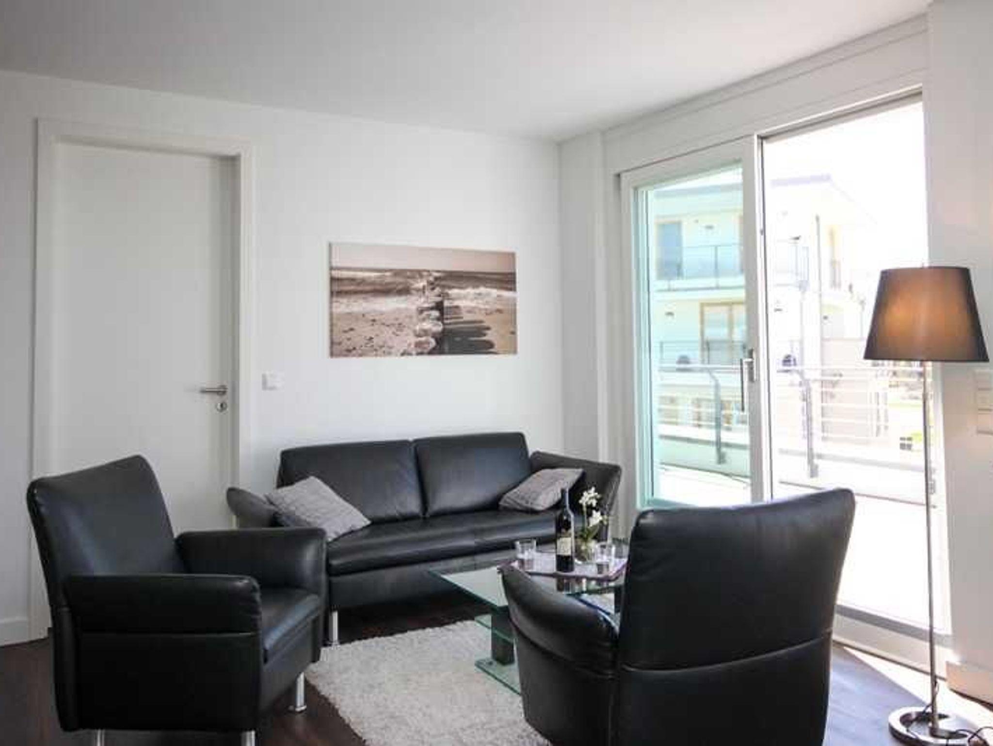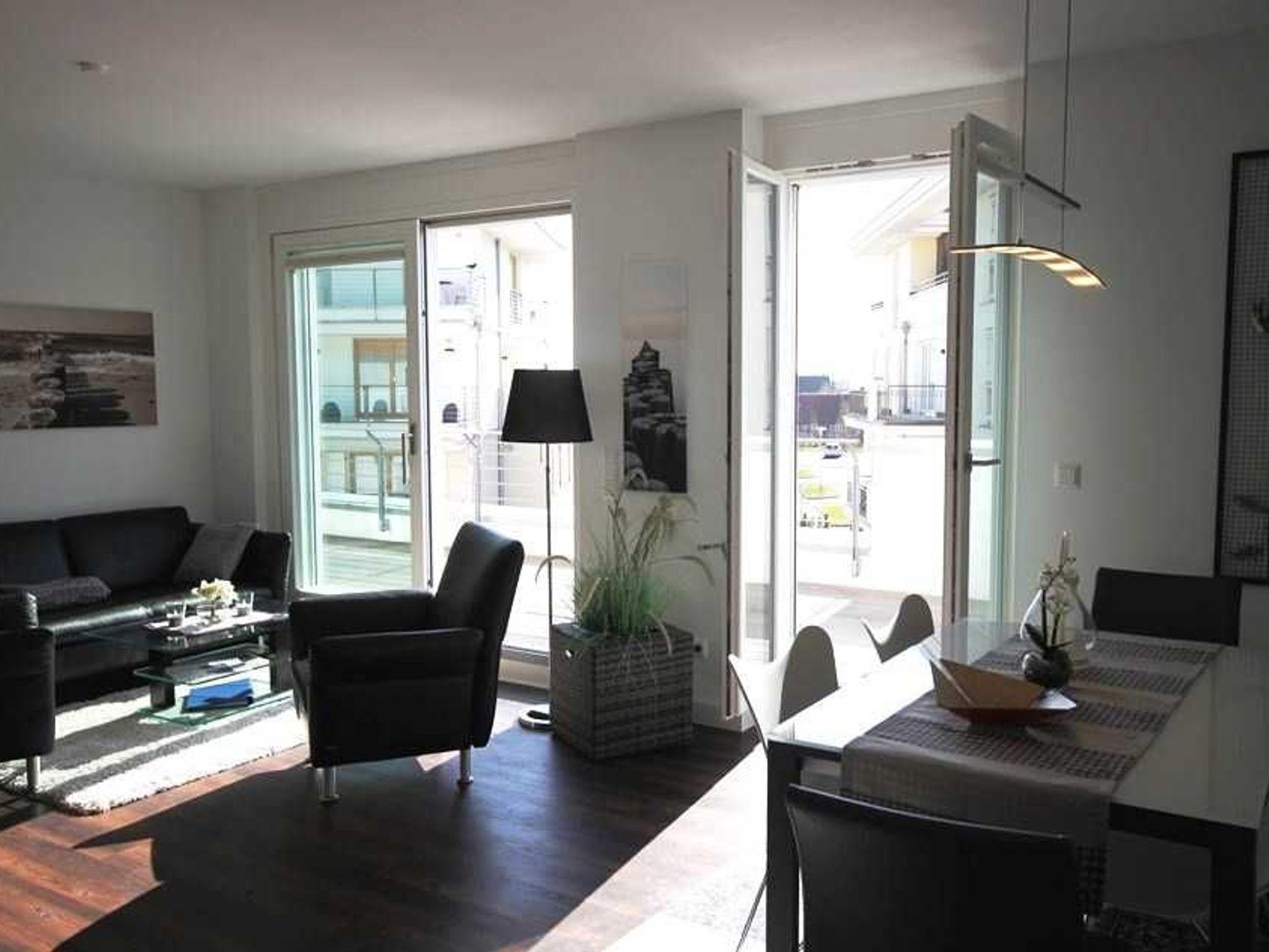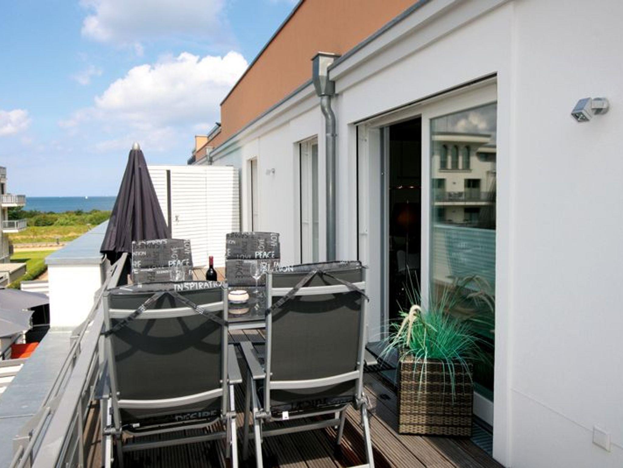 Der großzügige Ess- und Wohnbereich verfügt über einen Glastisch mit sechs Stühlen, eine gemütliche Zweisitzer-Couch und zwei großen Sesseln. Für Ihre Unterhaltung sorgen ein TV- Gerät und ein Radio mit CD- Player. Die Einbauküche bietet, neben der Standardausrüstung, eine Mikrowelle, Cerankochfeld, Backofen, Geschirrspüler und einen Kühlschrank mit integriertem Gefrierfach. Die Küche ist zum Wohnbereich offen. Die beiden Schafräume besitzen jeweils ein großzügiges Doppelbett. In einem der Schlafzimmer befindet sich zusätzlich noch ein Kleiderschrank. Im zweiten Schlafzimmer stehen Ihnen eine Kommode für Ihre Kleidung zur Verfügung. Und ein TV-Gerät inklusive Blu-ray-Player. Von diesem Schlafraum aus gibt es einen direkten Zugang zu einem der beiden Duschbäder. Beide verfügen über eine bodengleiche Dusche und einen Waschtisch mit Spiegel. Auf den großen Balkon gelangen Sie aus beiden Schlaf- und dem Wohnraum. Da der Balkon nach Westen ausgerichtet ist, kann hier ein warmer Sommerabend entspannt ausklingen. Ein Balkontisch mit vier Stühlen und ein Strandkorb stehen dafür bereit. Über die Brüstung des Balkons haben Sie dann einen weiten Blick auf das Meer. Zu der Ferienwohnung gehört ein kostenfreier Tiefgaragenstellplatz. Bitte beachten Sie die Durchfahrtshöhe von max. 1,90 m. Bei Überschreitung der maximalen Durchfahrtshöhe, besteht die Möglichkeit auf einen kostenpflichtigen Parkplatz in unmittelbarer Nähe auszuweichen. Der im Gebäude installierte Aufzug erleichtert den Transport der mitgebrachten Koffer. Zudem befindet sich ebenfalls im Untergeschoss ein separater abschließbarer Fahrradraum. Hier noch einige Hinweise: Haustiere sind nicht gestattet. Die Unterkunft ist eine Nichtraucherwohnung. Eine Waschmaschine und ein Trockner stehen im Waschraum, der sich im Erdgeschoss befindet, zur Verfügung (gegen Gebühr / 0,50 Euro Münzen). Das kostenfreie WLAN in der Unterkunft ist ausschließlich für die Verwendung von Social Media und den Austausch von Bildern mit Familie und Freunden gedacht. Die Nutzung zum Streamen von Filmen ist nicht vorgesehen. In der Hauptsaison wird für die dritte und vierte Person ein Aufpreis in Höhe von 10,00 Euro/ÜN pro Person berechnet. Wäscheset, Kinderreisebett und Kinderhochstuhl können kostenpflichtig zugebucht werden. Sichern Sie sich zusätzlich den Anspruch auf einen der begehrten Strandkörbe nur ein paar Meter entfernt von den rauschenden Wellen der Ostsee (Anfang Mai - Ende August) und buchen Sie jetzt zu besonderen Konditionen (12,00 Euro pro Tag oder 75,00 Euro pro Woche.)