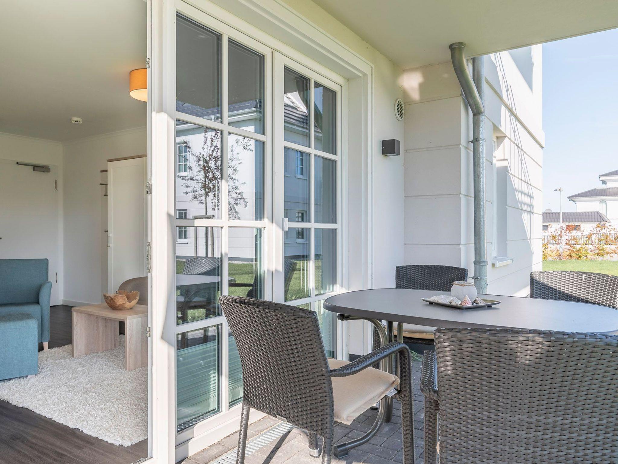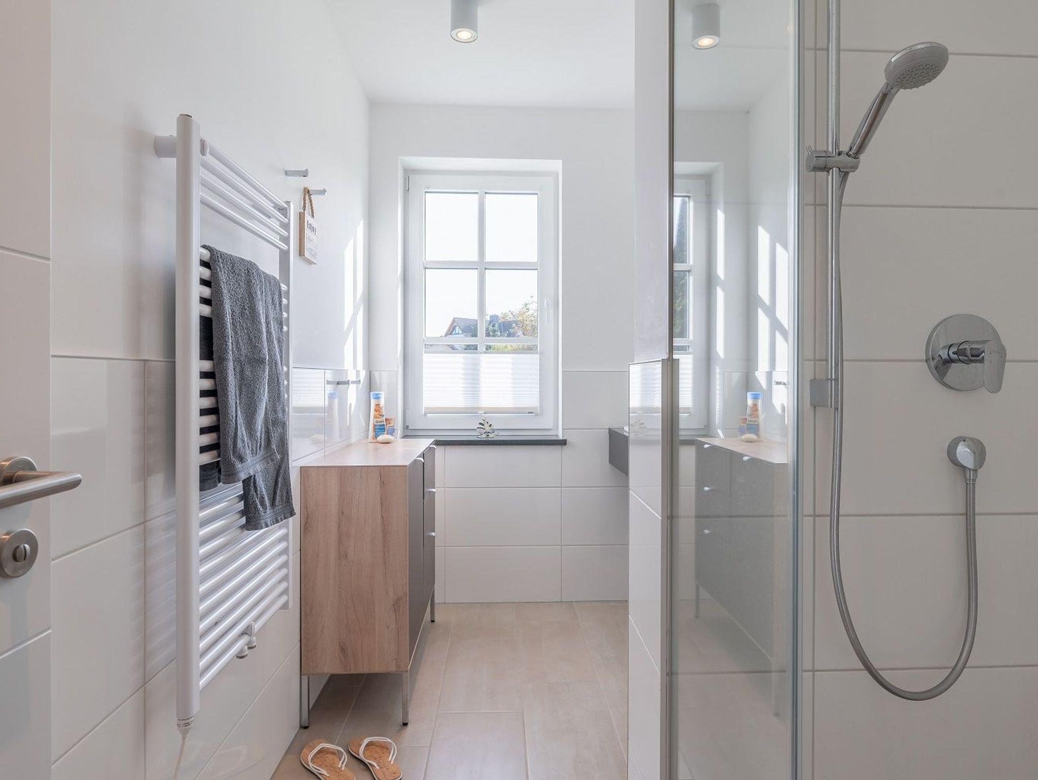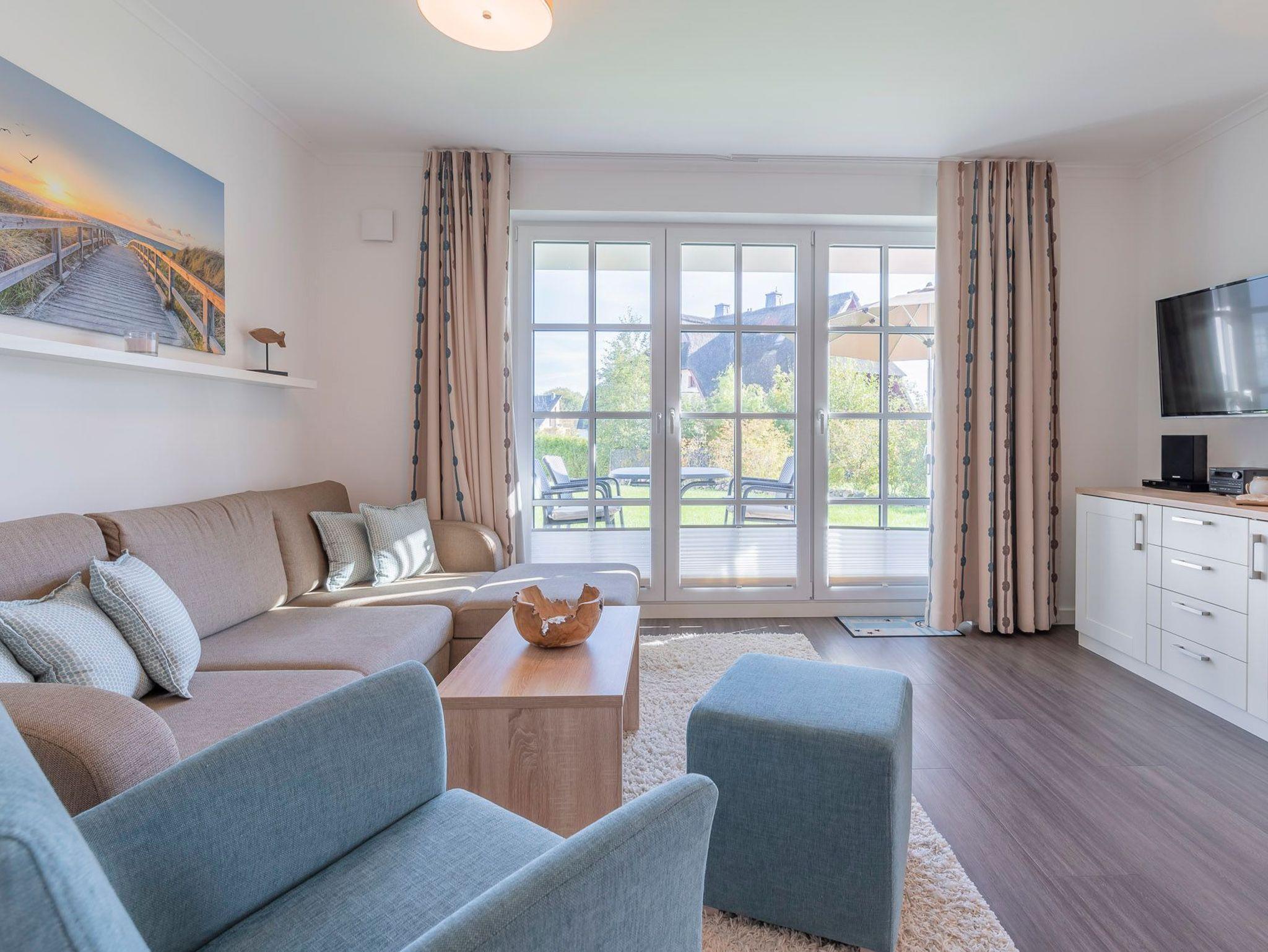 Die moderne Küche bietet jeden Komfort. Sie ist mit hochwertigen Geräten ausgestattet, dazu gehören Backofen, Ceran-Kochfeld, Kaffeemaschine, Toaster,[nbsp] Wasserkocher und Kühlschrank inklusive Gefrierfach. Der helle Essbereich eignet sich perfekt zum gemütlichen Beisammensein in kleiner Runde. Die zwei Schlafzimmer sind mit bequemen Boxspringbetten und ausreichend Stauraum für Ihre Mitbringsel ausgestattet. Im modernen Wohnzimmer bietet die Couch neben gemütlichen Abenden vor dem Fernseher einen zusätzlichen Schlafplatz für die fünfte Person. Das Bad verfügt über eine ebenerdige Dusche, einen Waschtisch mit großem Spiegel und ein zusätzliches Sideboard. Vom Wohnbereich gelangen Sie auf die schön angelegte Terrasse (Ostseite) mit Blick ins Grüne. So lässt es sich früh morgens mit der Sonne am Frühstückstisch starten. Die Grünanlage auf der Südseite mit schönem Blick auf modern gedeckten Reetdachhäuser und den zugehörigen Sonnenliegen ruft anschließend zum Sonnenbaden.