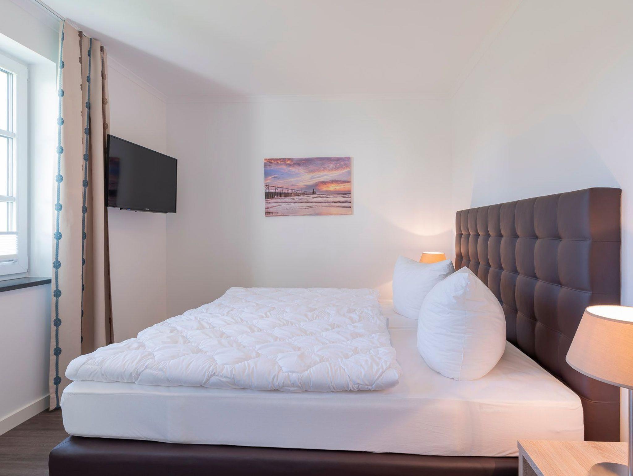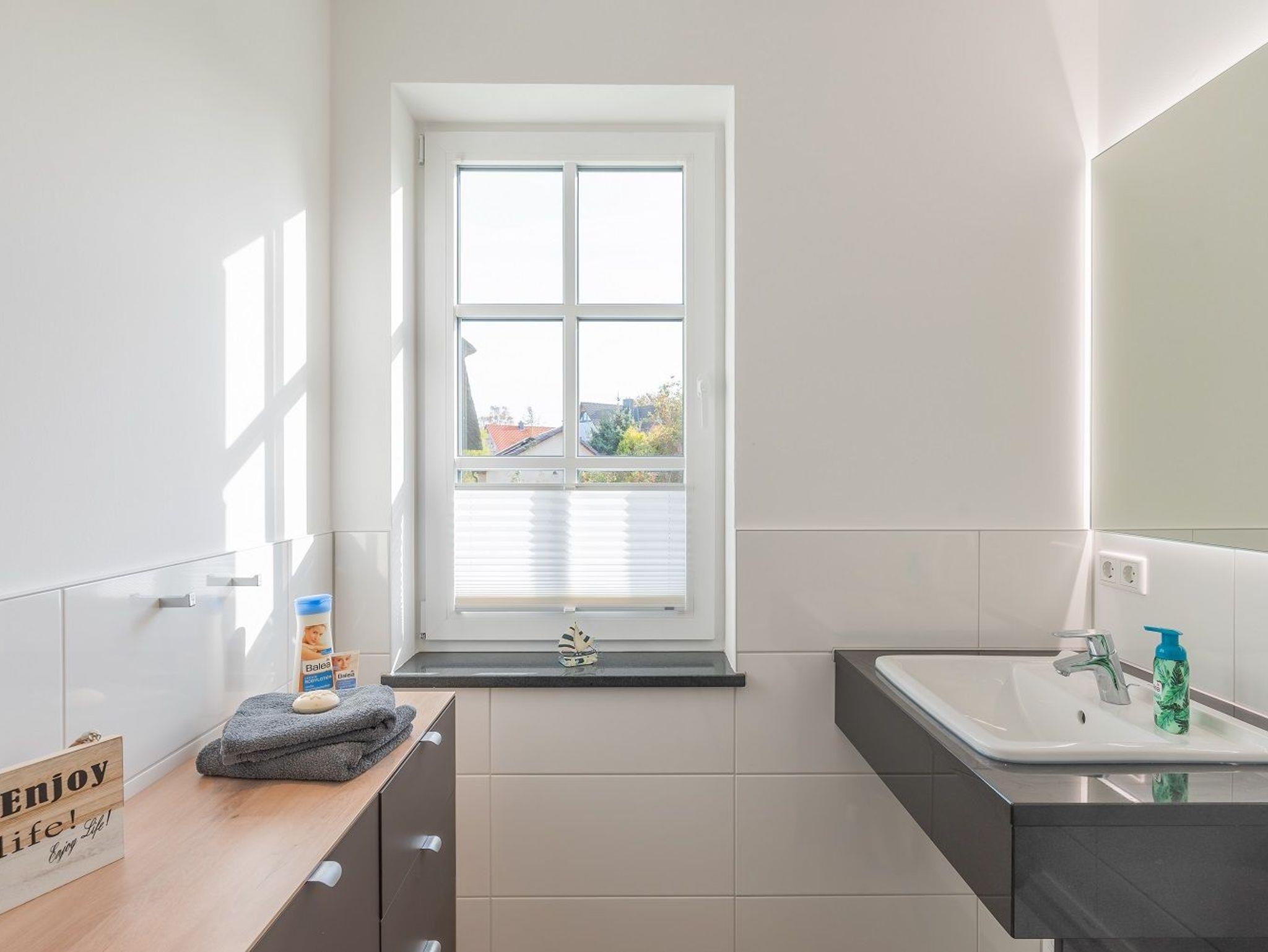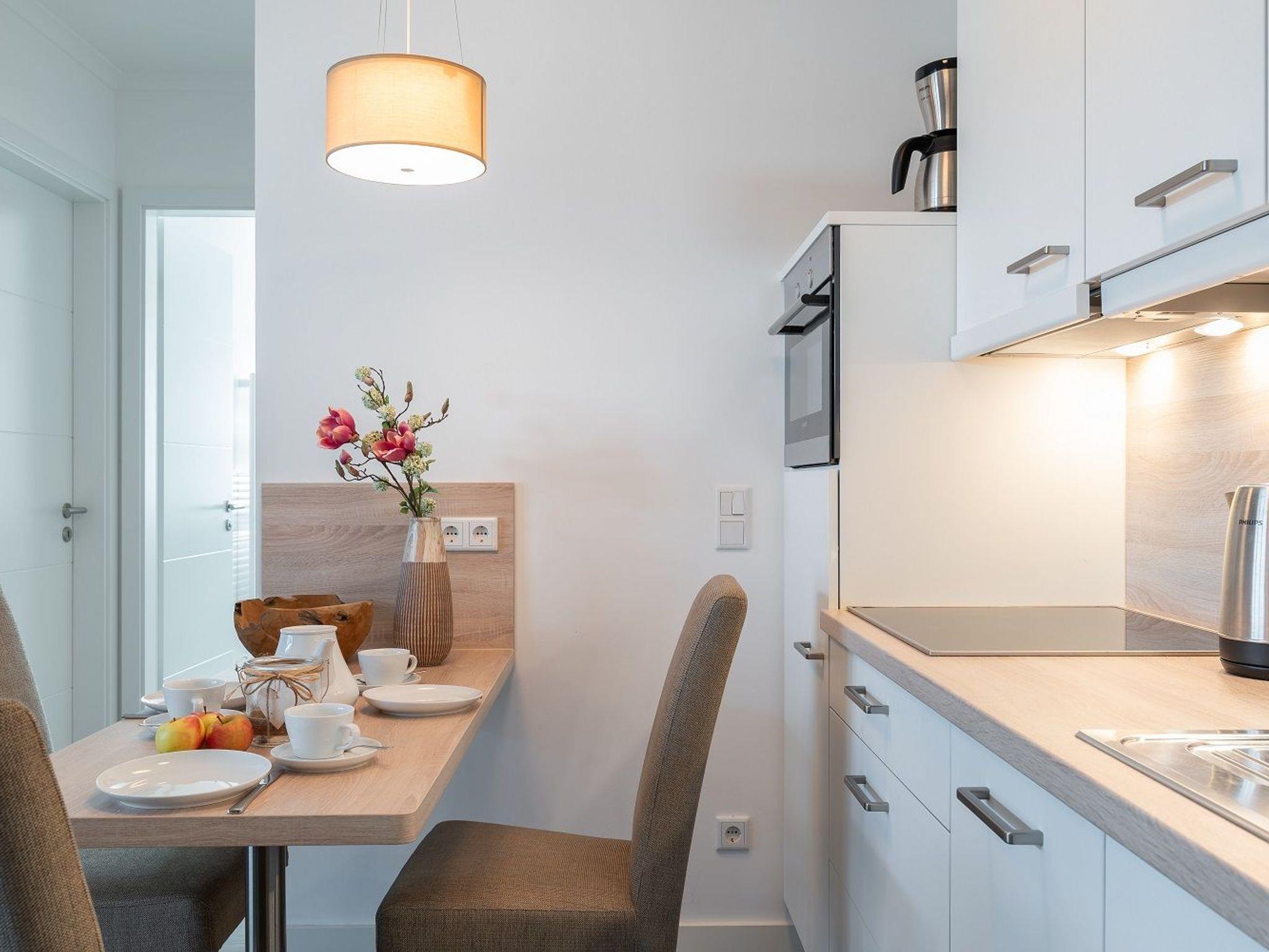 Die moderne Küche bietet jeden Komfort. Sie ist mit hochwertigen Geräten ausgestattet, dazu gehören Backofen, Ceran-Kochfeld, Kaffeemaschine, Toaster,[nbsp] Wasserkocher und Kühlschrank inklusive Gefrierfach. Der helle Essbereich eignet sich perfekt zum gemütlichen Beisammensein in kleiner Runde. Die zwei Schlafzimmer sind mit bequemen Boxspringbetten und ausreichend Stauraum für Ihre Mitbringsel ausgestattet. Im modernen Wohnzimmer bietet die Couch neben gemütlichen Abenden vor dem Fernseher einen zusätzlichen Schlafplatz für die fünfte Person. Das Bad verfügt über eine ebenerdige Dusche, einen Waschtisch mit großem Spiegel und ein zusätzliches Sideboard. Vom Wohnbereich gelangen Sie auf die schön angelegte Terrasse (Ostseite) mit Blick ins Grüne. So lässt es sich früh morgens mit der Sonne am Frühstückstisch starten. Die Grünanlage auf der Südseite mit schönem Blick auf modern gedeckten Reetdachhäuser und den zugehörigen Sonnenliegen ruft anschließend zum Sonnenbaden.