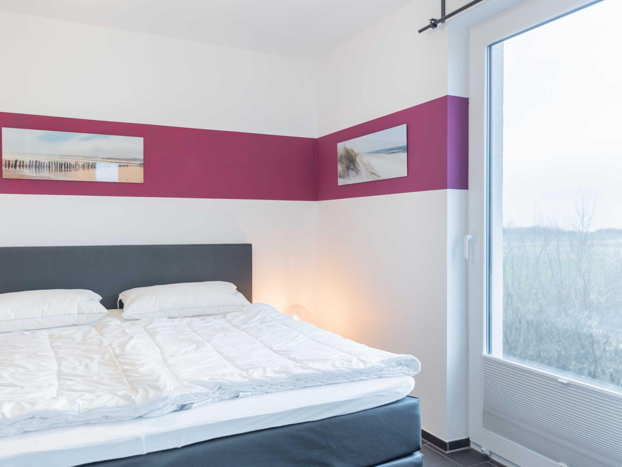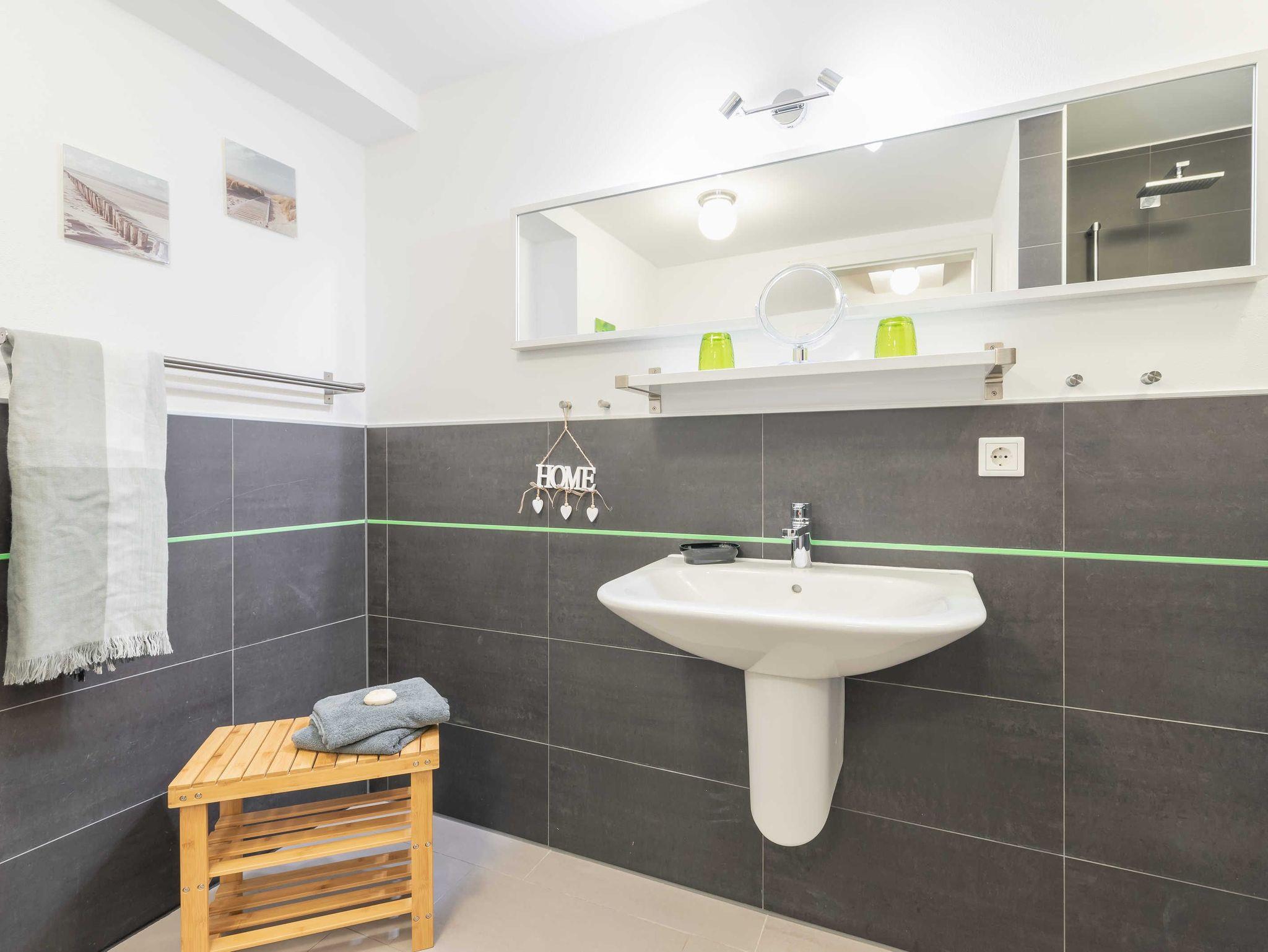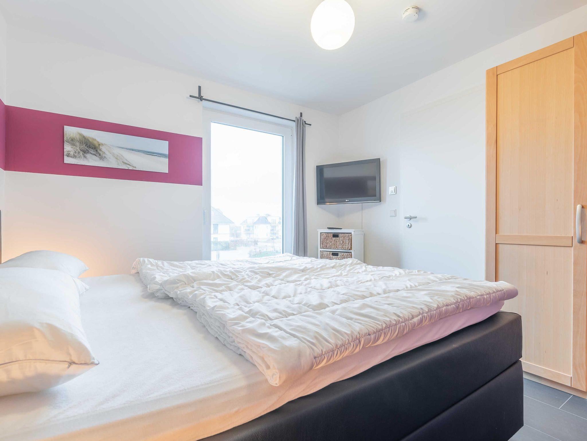 Zur Wohnung gehören ein Ostbalkon mit Meerblick und ein kostenfreier PKW-Stellplatz in der Tiefgarage. Bitte beachten Sie die Durchfahrtshöhe von max. 1,90 m. Von der Tiefgarage aus können Sie mit dem Fahrstuhl bequem zur Wohnung fahren. Am Eingang des Objekts befinden sich zudem Fahrradständer. Die modern eingerichtete Ferienwohnung bietet Ihnen ein großes Wohnzimmer mit Koch- und Essbereich und eine bequeme Schlafcouch für zwei weitere Personen. Bunte Unterhaltung bietet ein LCD-Satelliten-TV mit Radio und DVD-Spieler. Das große Schlafzimmer ist mit einem Kleiderschrank und einem komfortablen Doppelbett (durchgängige Matratze) eingerichtet. In der kompletten Wohnung ist eine Fußbodenheizung installiert. Vom Wohnbereich aus gelangen Sie nach draußen auf den Balkon. Im Bad befinden sich eine ebenerdige Dusche, ein WC und ein Waschtisch mit großem Spiegel. Ein Föhn ist vorhanden. Des Weiteren finden Sie eine komplett eingerichtete Einbauküche mit Cerankochfeld, Kühlschrank mit Gefrierfach, Geschirrspüler, Wasserkocher, Kaffeemaschine, Toaster und eine Mikrowelle mit Backfunktion.