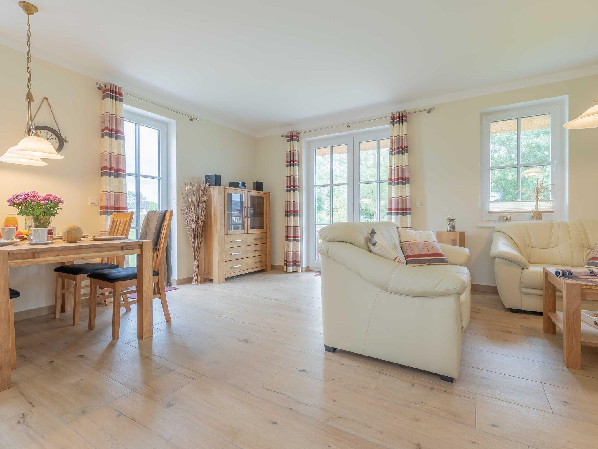Die gemütliche Couchecke im Wohnbereich eignet sich ideal zum entspannen nach einen ausgedehnten Strandspaziergang.