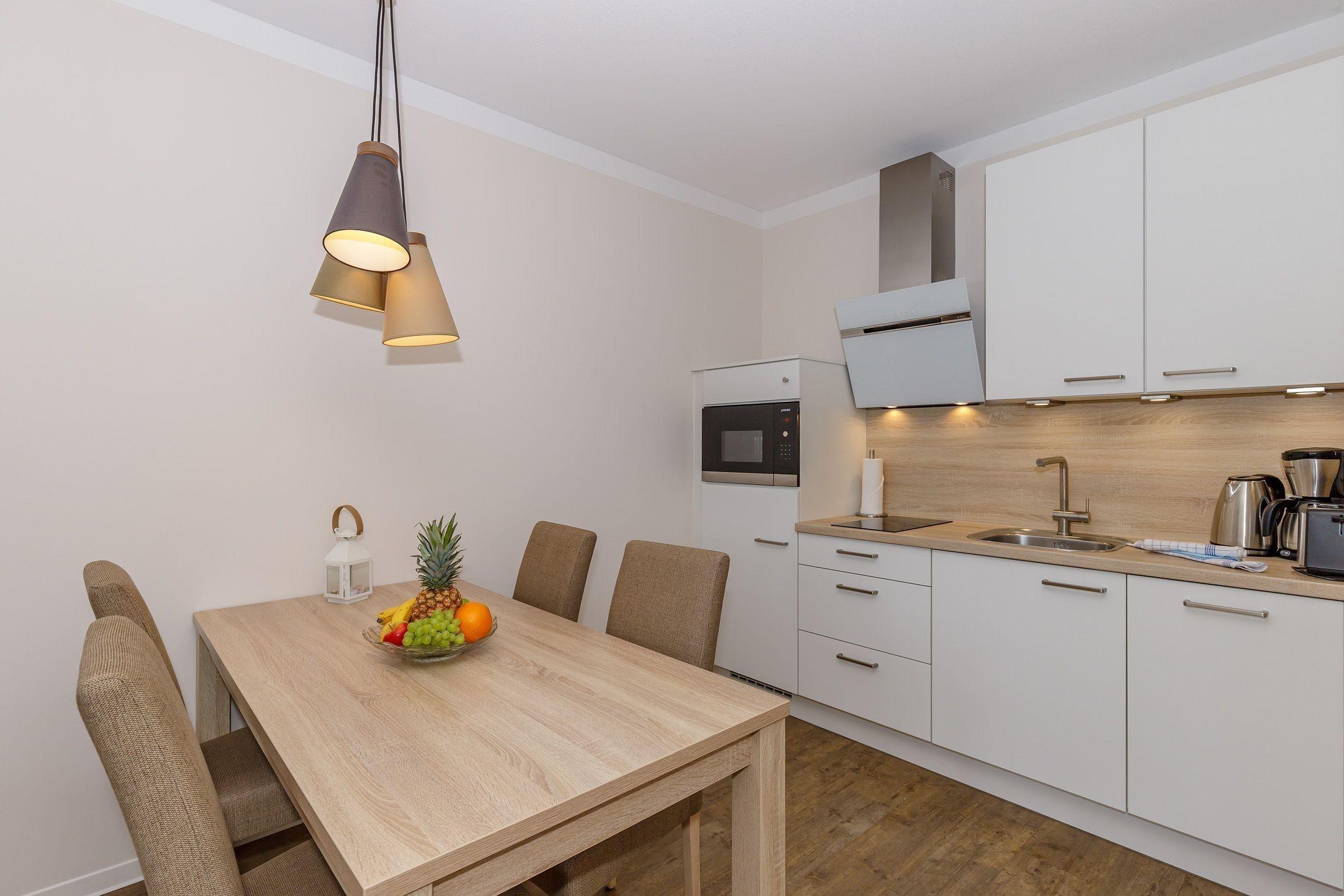 Die offene Küche mit integriertem Essbereich besitzt einen Geschirrspüler, Kühlschrank mit einem Gefrierfach, Toaster, Kaffeemaschine, Mikrowelle mit Grillfunktion und Heißluft, 2-Platten-Ceranfeld und Wasserkocher.