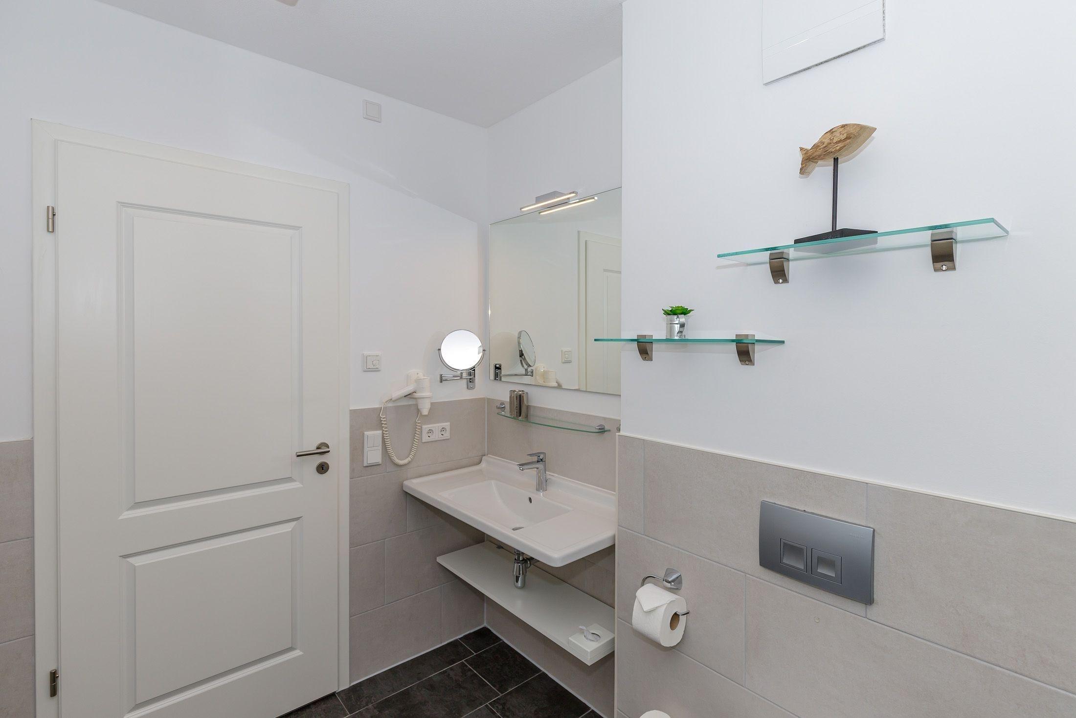 Die offene Regendusche ist das Highlight des Badezimmers und ausgestattet mit einem Handtuchwärmer, einem Waschtisch mit Kosmetikspiegel und einem Haartrockner.