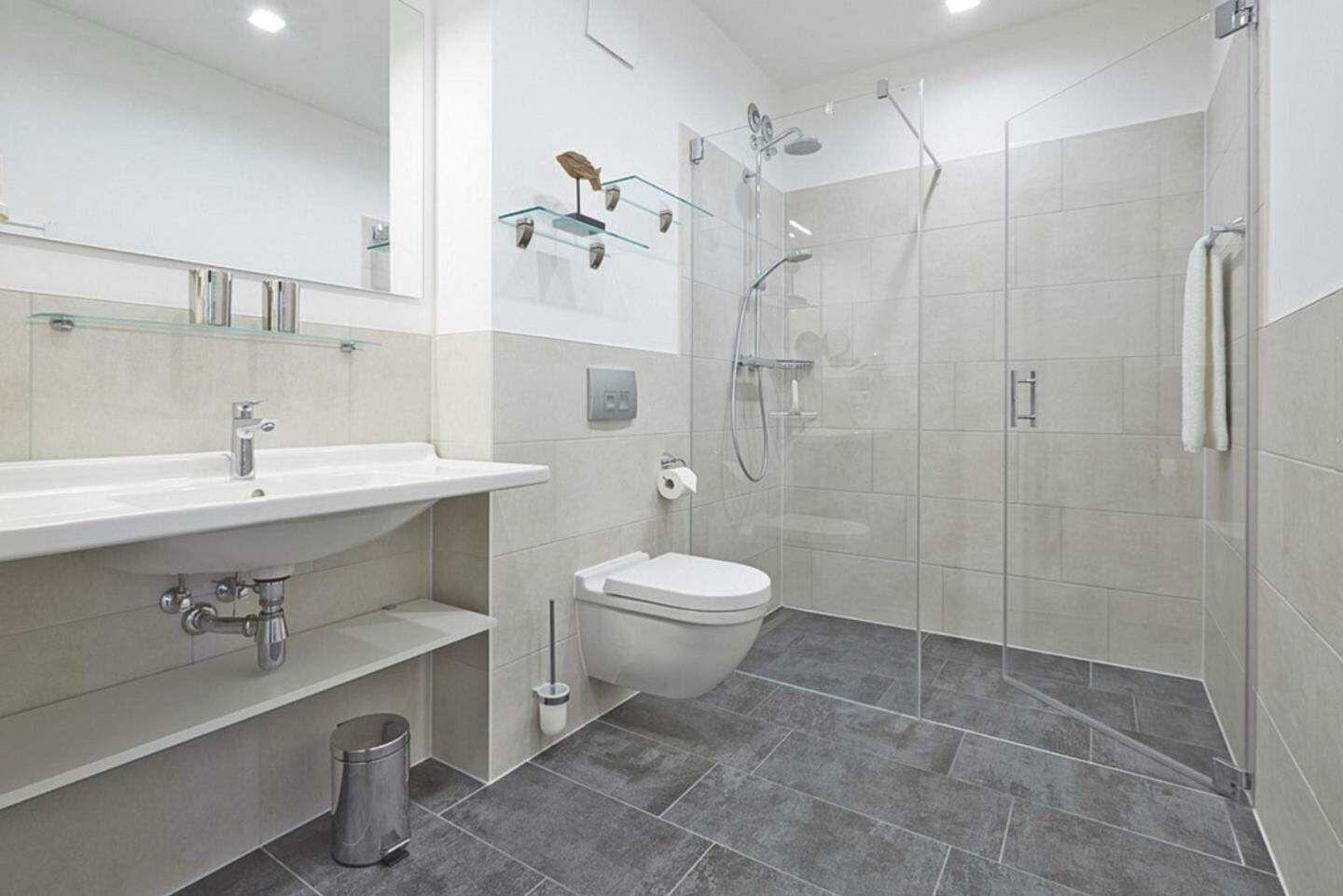 Die offene Regendusche ist das Highlight der Wohnung. Das Badezimmer ist ausgestattet mit einem Handtuchwärmer, einem Waschtisch mit Kosmetikspiegel und einem Haartrockner.