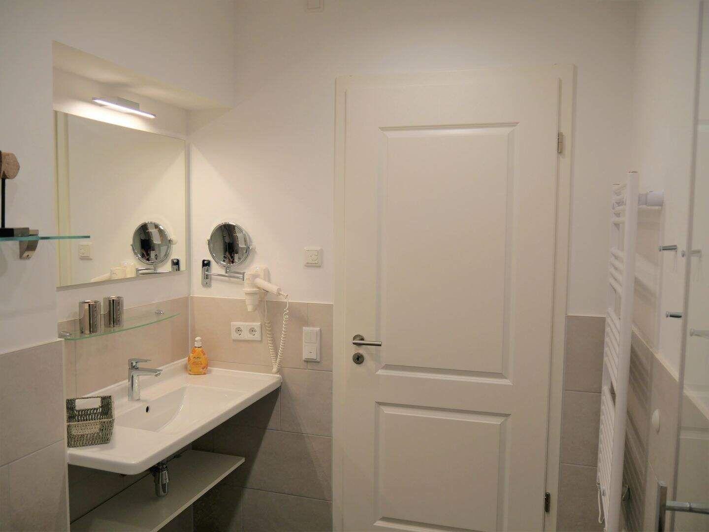 Die offene Regendusche ist das Highlight der Wohnung. Das Badezimmer ist ausgestattet mit einem Handtuchwärmer, einem Waschtisch mit Kosmetikspiegel und einem Haartrockner.