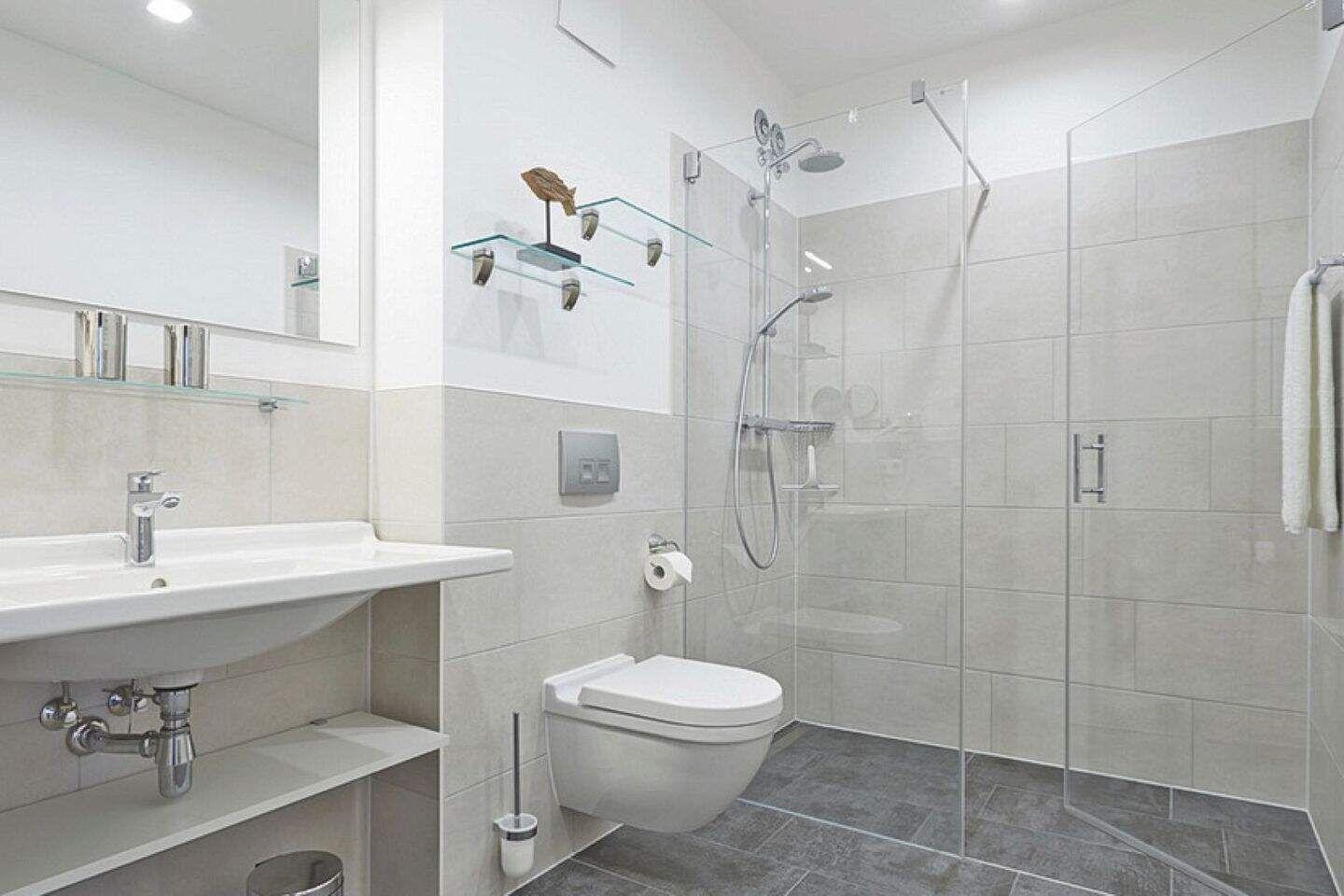 Die offene Regendusche ist das Highlight der Wohnung. Das Badezimmer ist ausgestattet mit einem Handtuchwärmer, einem Waschtisch mit Kosmetikspiegel und einem Haartrockner.