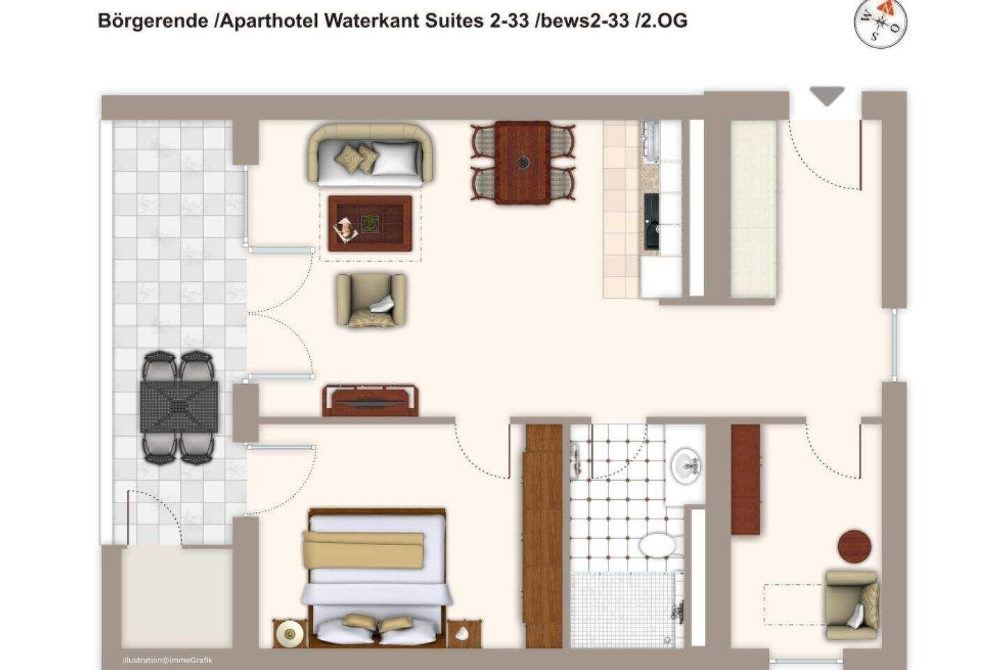 Von Ihrem überdachten Balkon mit Westausrichtung, haben Sie einen seitlich eingeschränkten Blick auf die Ostsee. Natürlich stehen Ihnen hier auch Terrassenmöbel zur Verfügung, sodass Sie hier Ihr Frühstück oder Ihr Abendessen bei einem malerischen Sonnenuntergang genießen können. Der überdachte Balkon ist sowohl vom Wohnzimmer, als auch vom Schlafzimmer aus begehbar. Die Waterkant Suites liegen direkt an der Promenade in Börgerende und somit direkt am Meer.
