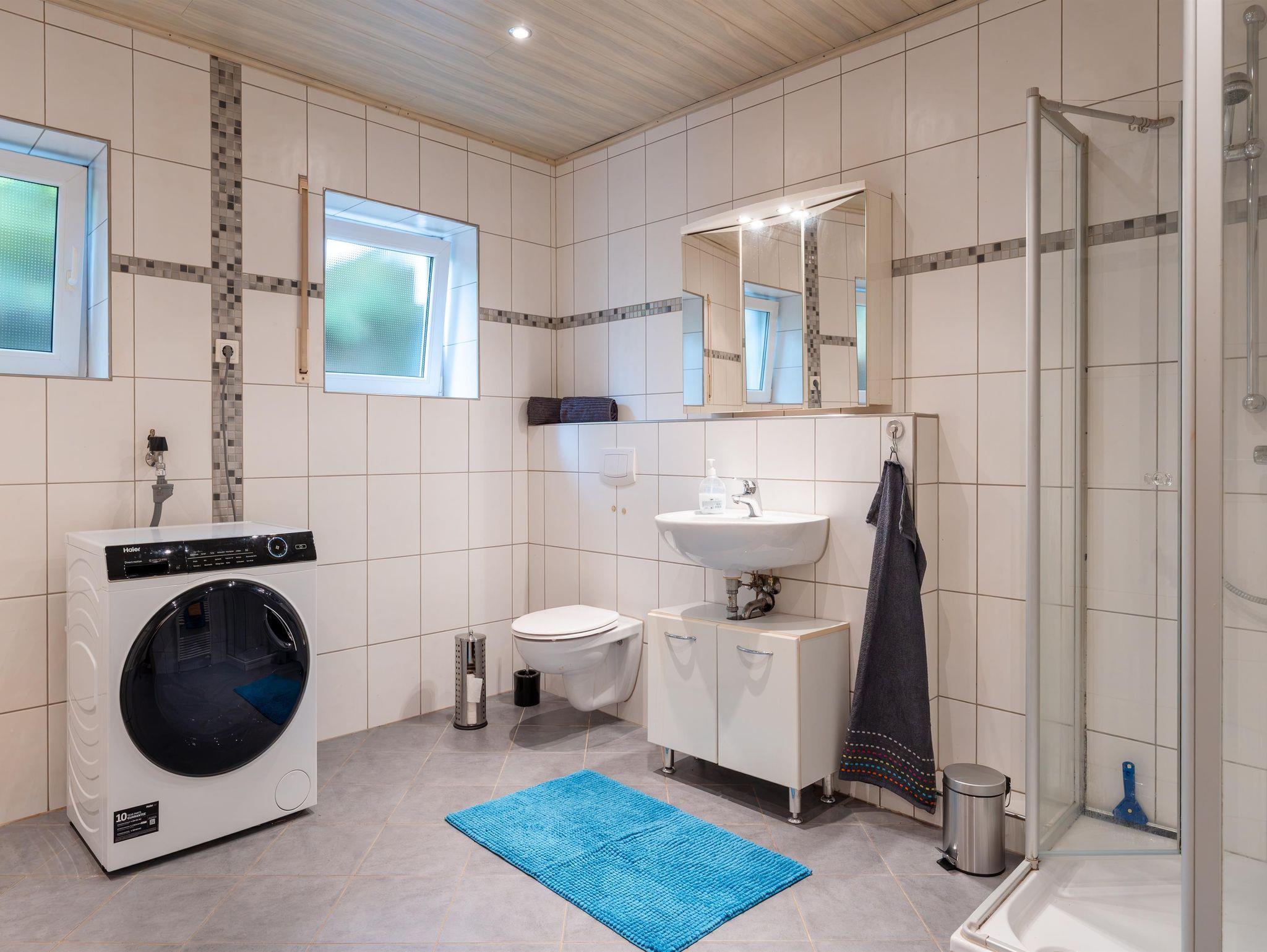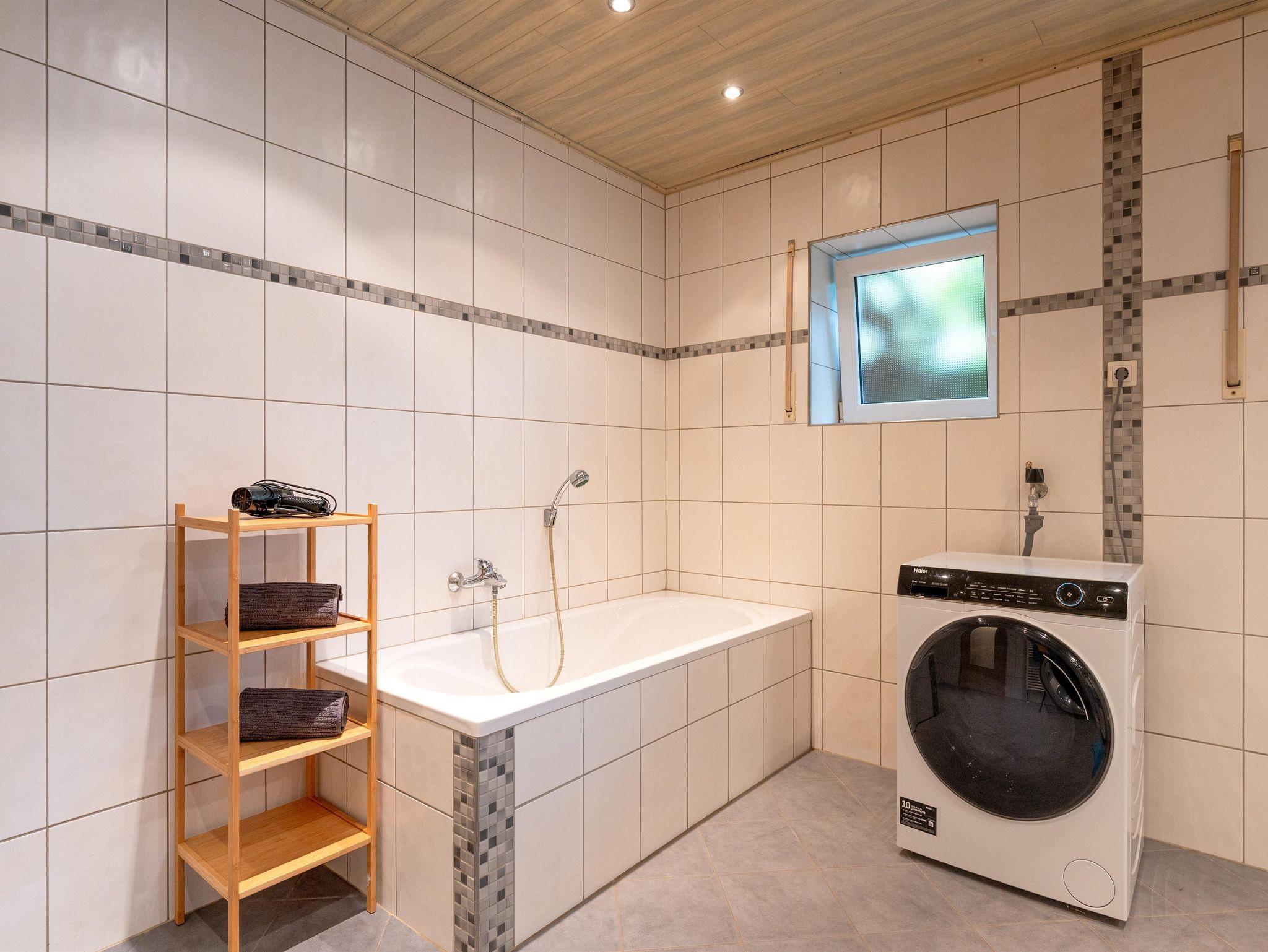 Ein großräumiges Badezimmer mit WC, Dusche sowohl auch mit einer Badewanne sind ganz neu renoviert und dort steht Ihnen sogar eine eigens zu nutzende Waschmaschine zur Verfügung. Im Badezimmer liegt ein Haarföhn für Ihren Aufenthalt bereit.