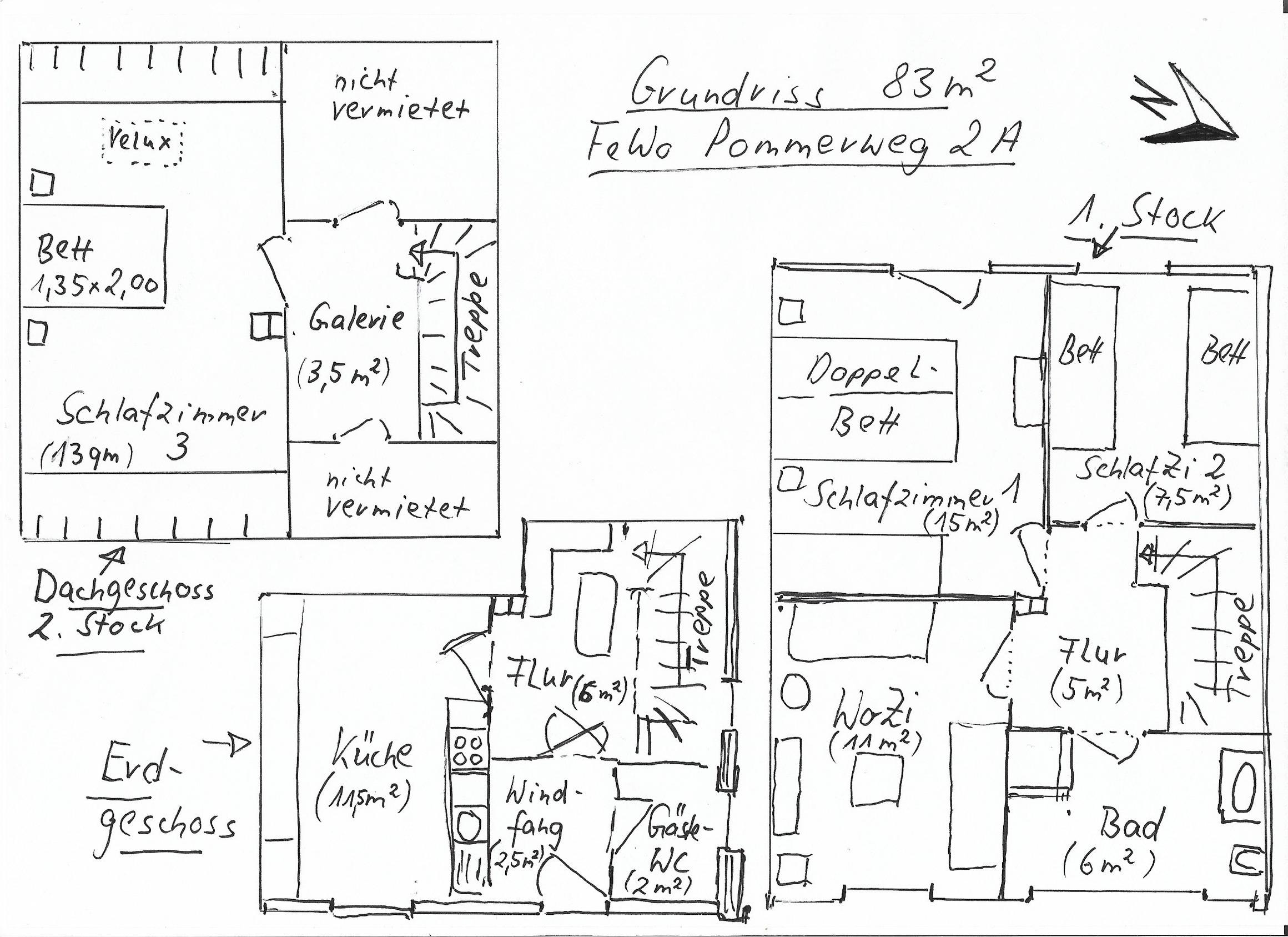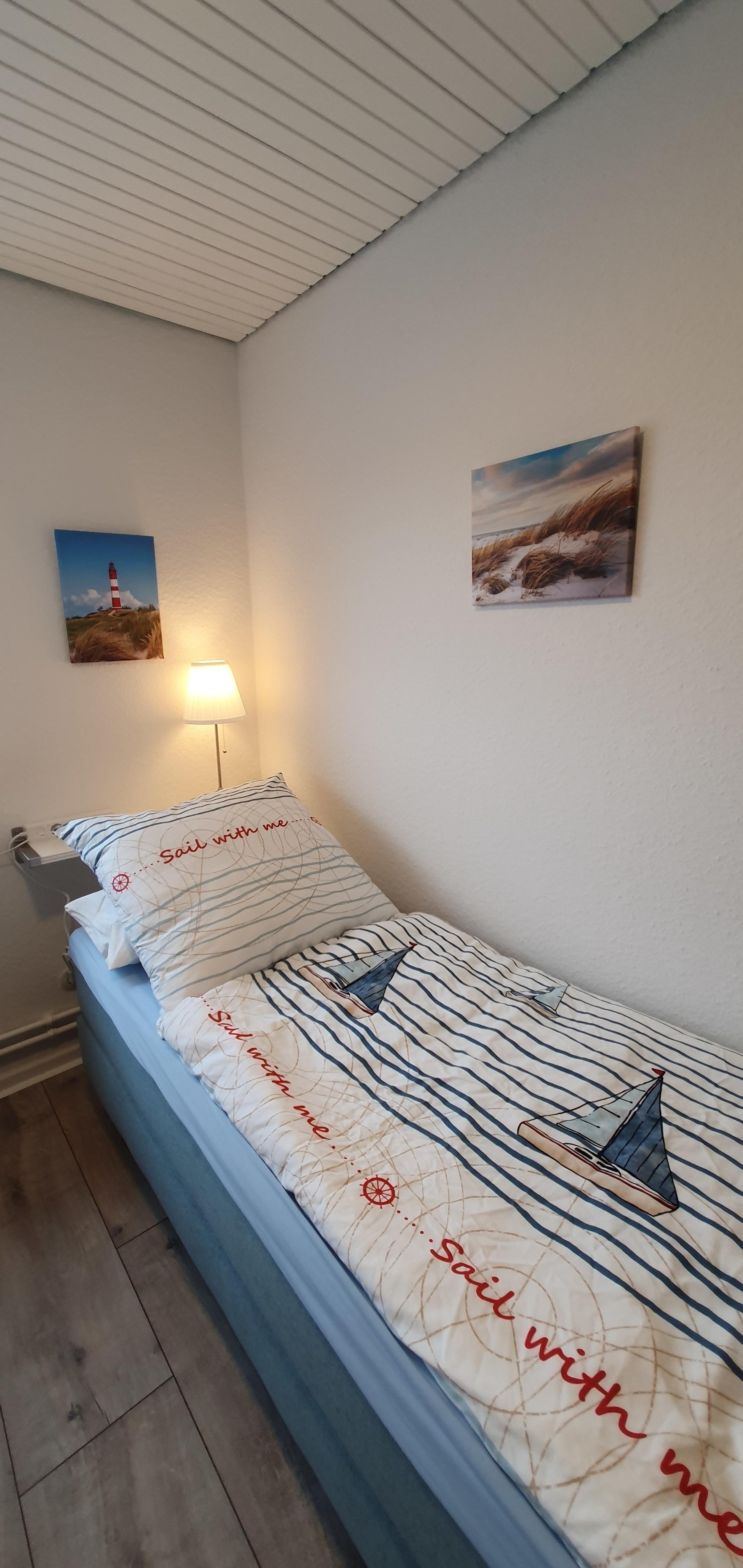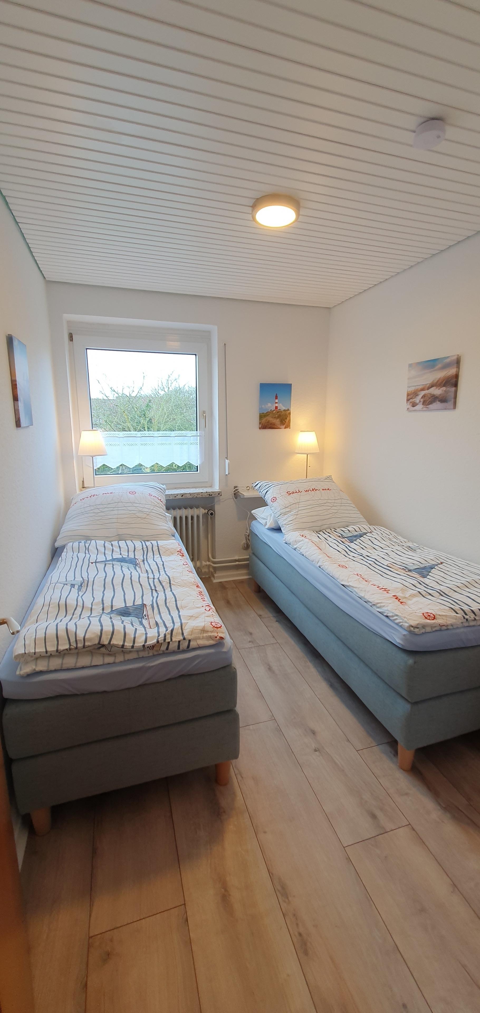 Das Haus für max. 5 Personen besticht durch einen Mix aus neuem und liebevoll aufgearbeitetem Mobiliar. Es verfügt über 1 großes Schlafzimmer mit 2 zusammenstehenden Boxspringbetten à 90 x 200 cm, 1 kleines Schlafzimmer mit 2 Boxspringbetten à 80 x 200 cm (jeweils ca. 60 cm hoch) und ein Dachstudio mit einer Art Futon Bett 130 x 200 cm (ca. 50 cm hoch).