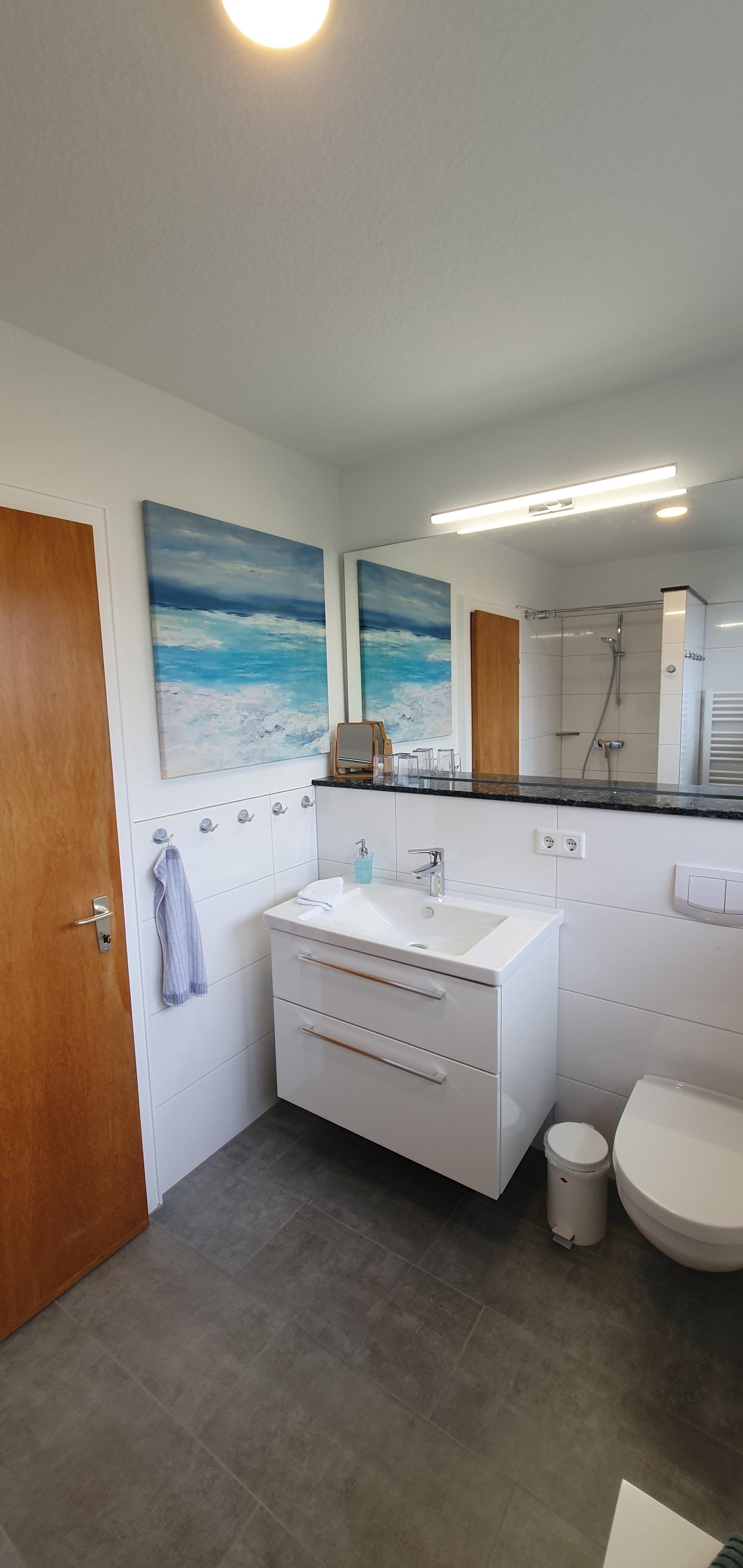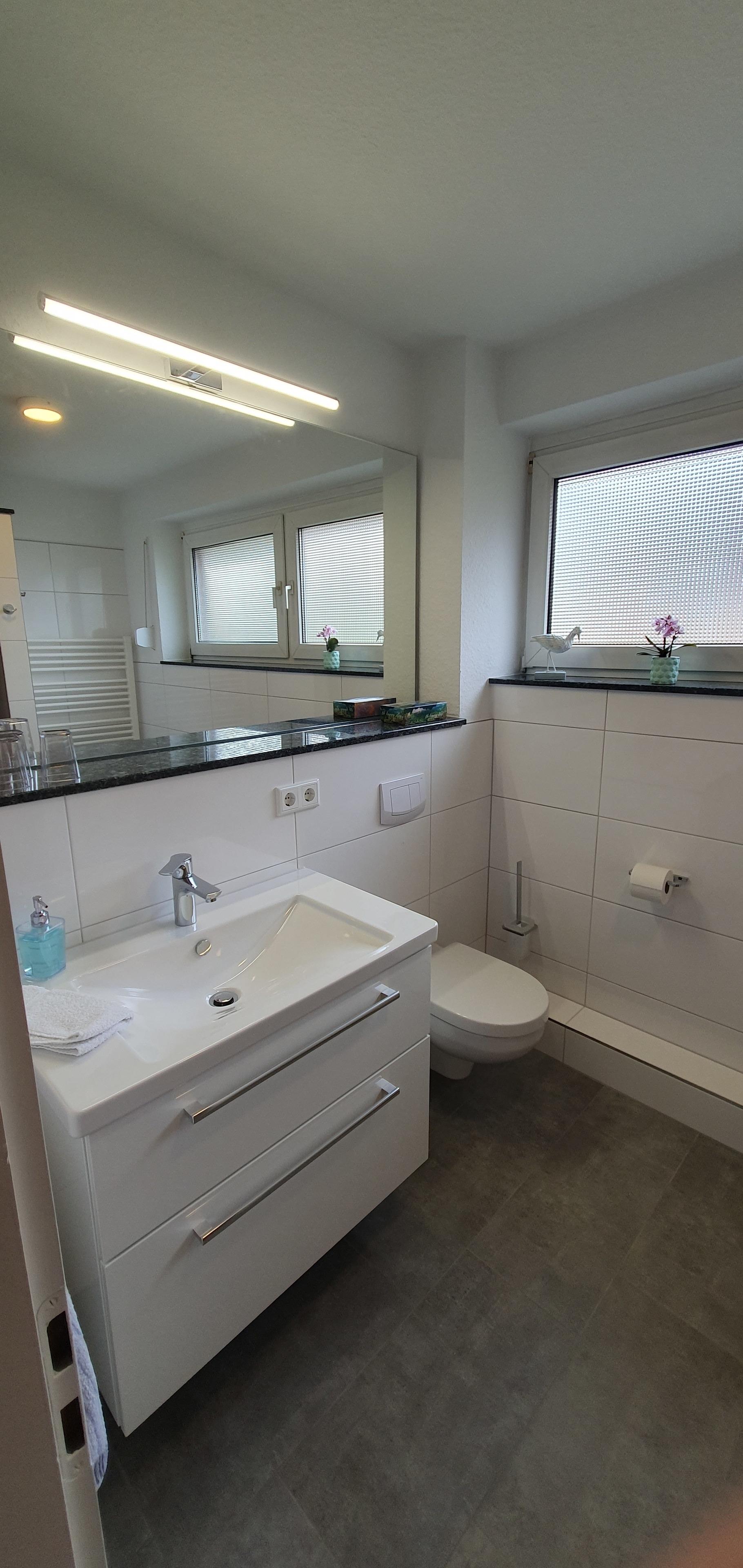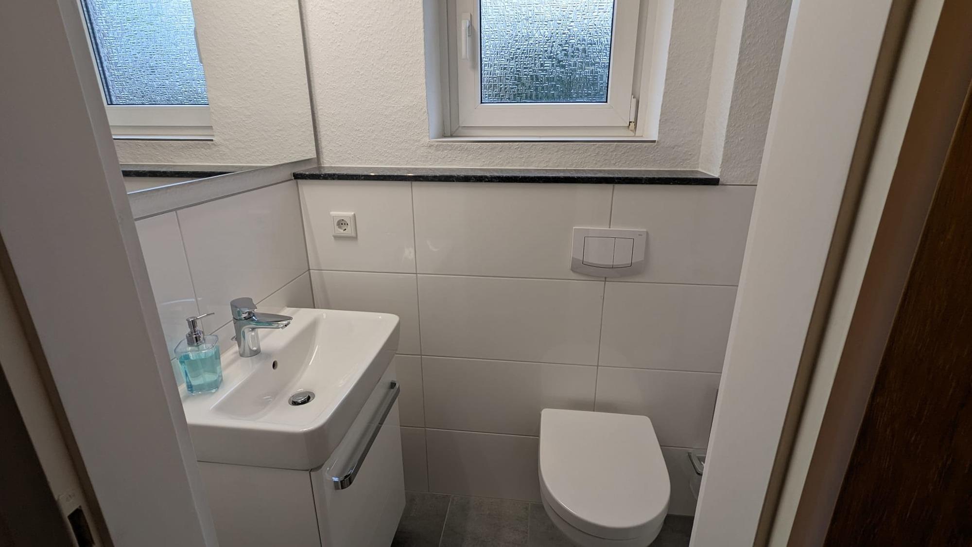 Neben einem neuen Gäste-WC im Eingangsbereich gibt es im 1. Obergeschoss ein neues Badezimmer mit Dusche und Fußbodenheizung und ein gemütliches kleines Wohnzimmer mit Smart-TV, Glasfaser-WLAN, Radio, CD-Player und portablem Bluetooth-Lautsprecher.