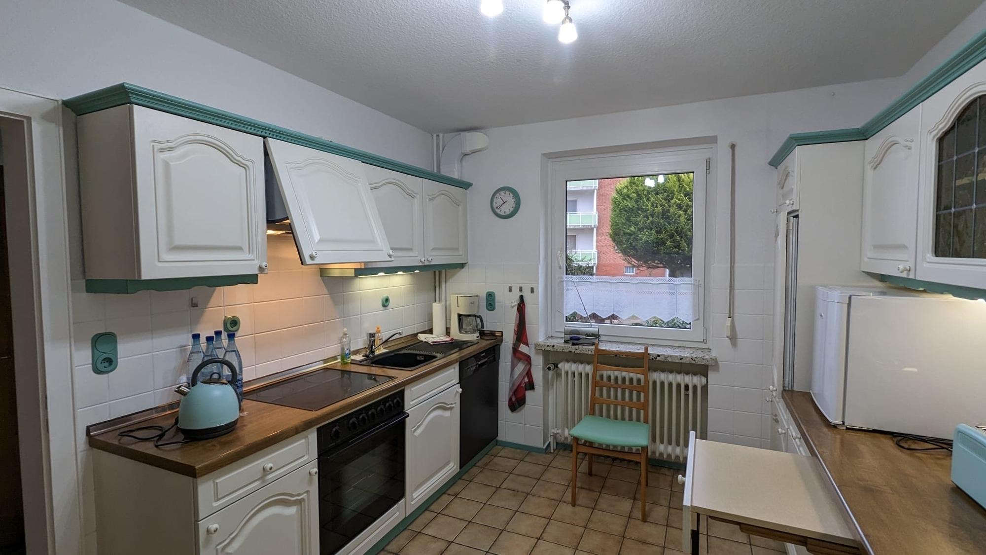 Die farblich aufgefrischte alte Holzküche im Erdgeschoss verfügt über einen kleinen Ausziehtisch sowie Umluft-Backofen, vier Ceran-Kochfelder, Dunstabzug, Mikrowelle, Spülmaschine, Kühlschrank, Mini-Gefrierschrank, Toaster, Kaffeemaschine, Zitruspresse, Mixer und Wasserkocher. Für gemeinsame Mahlzeiten und Spieleabende wurde in der kleinen Diele neben der Küche eine gemütliche Sitzecke mit Stauraum für eine schöne Auswahl an Gesellschaftsspielen eingebaut.