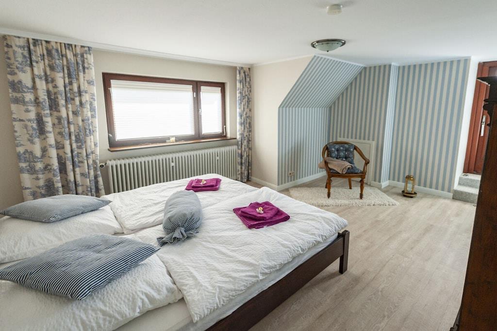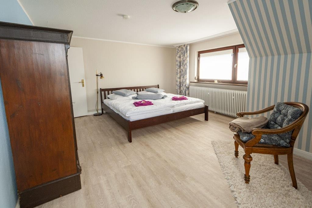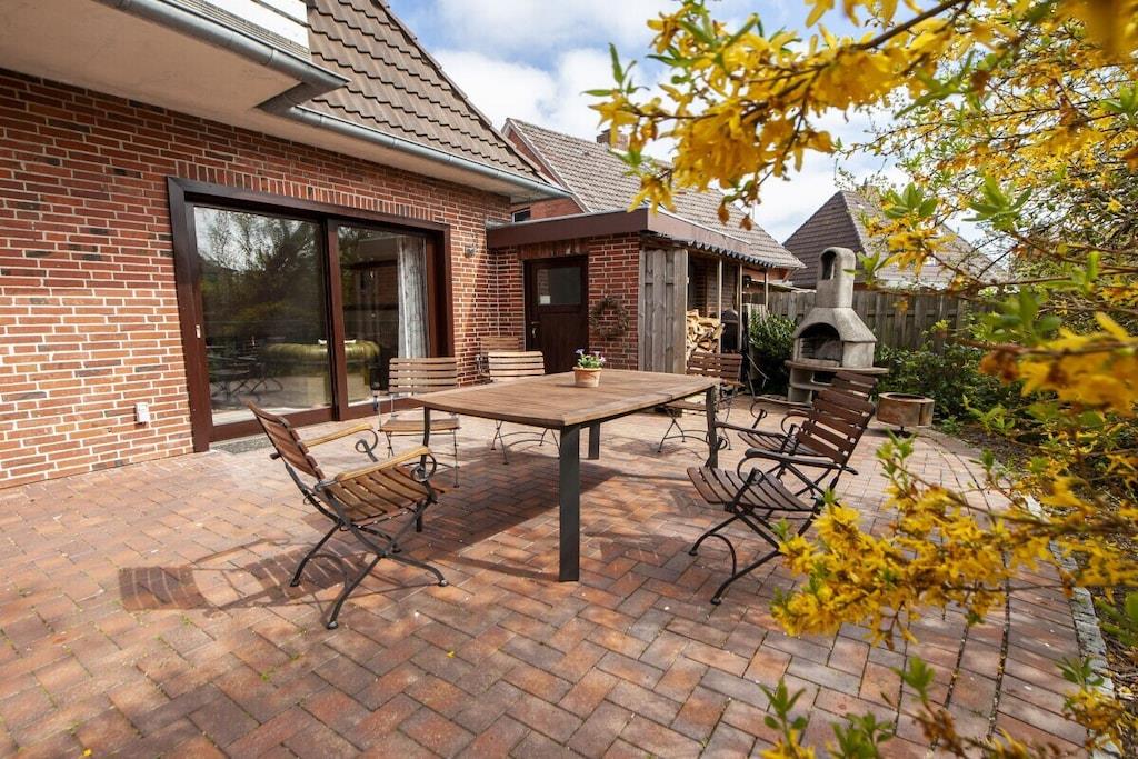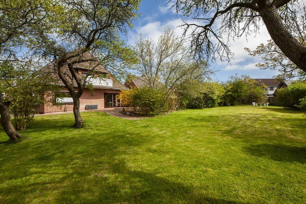 Individuelt feriehus Gorch Fock for 8 personer. Sentralt beliggende, men likevel svært rolig. 4 soverom, 2 bad, ett med badekar, koselig stue og spisestue med vedovn. Stor hage med terrasse og balkong. Også godt egnet for små grupper, seminarer og lignende arrangementer. Ingen mainstream, bare koselig og unikt. Klar hodet på diket i den salte sjøluften. Enten du nyter stranden om sommeren, går turer i mudderbankene når som helst, eller trosser en storm og deretter varmer deg ved ovnen med en Pharisäer (kaffe og kaffe) eller te.