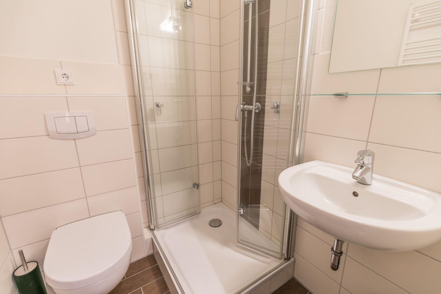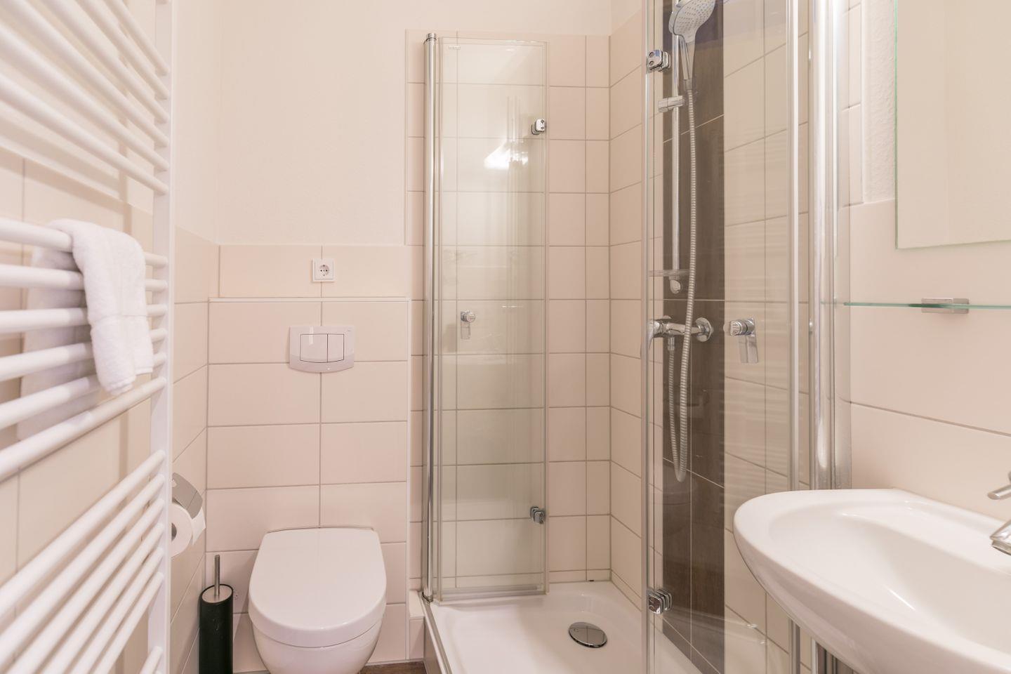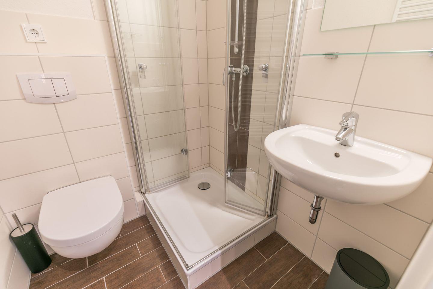 Dusche, WC, Waschbecken, Spiegel mit Ablage, Handtuchtrockner, Föhn, Abluft