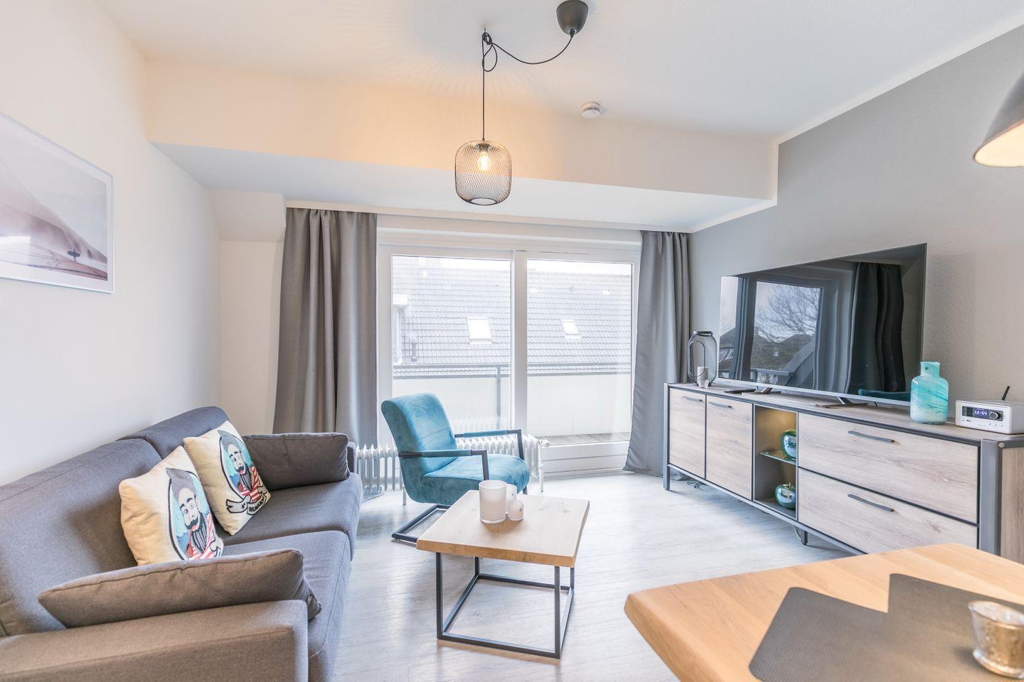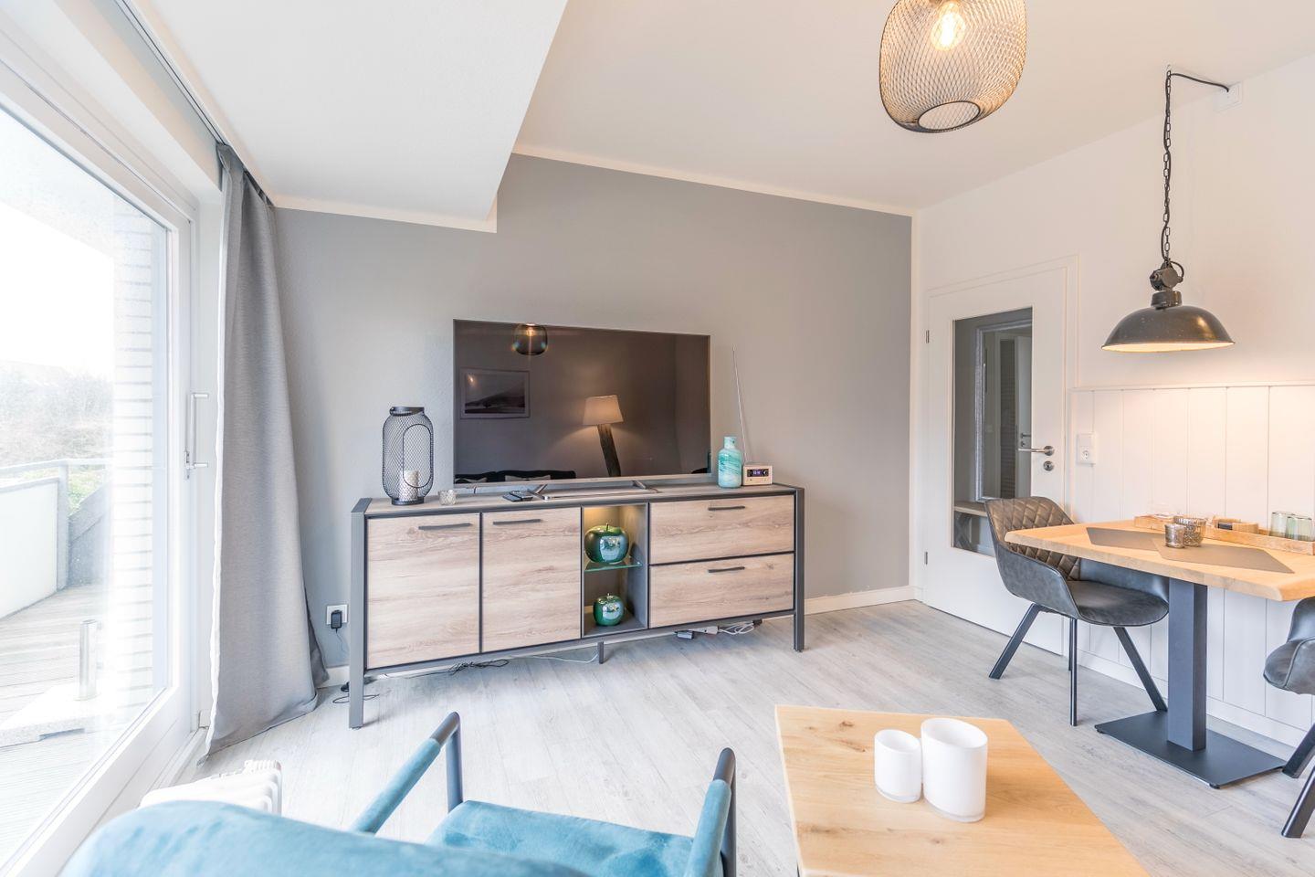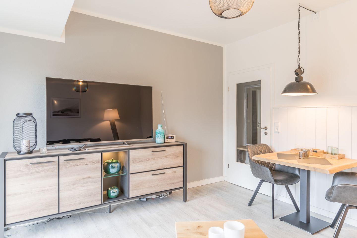 Couch, Sessel, Couchtisch, 58“-Flachbild-Smart-TV, TV-Sideboard inkl. Beleuchtung, Radio mit Bluetooth und Wifi-Verbindung, Zugang zum Süd-Balkon mit 2 Stühlen + Tisch