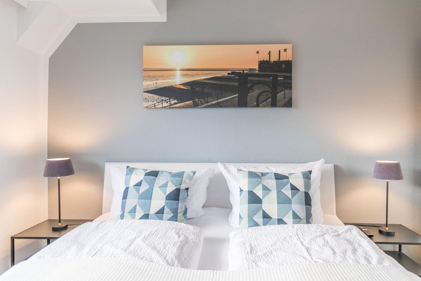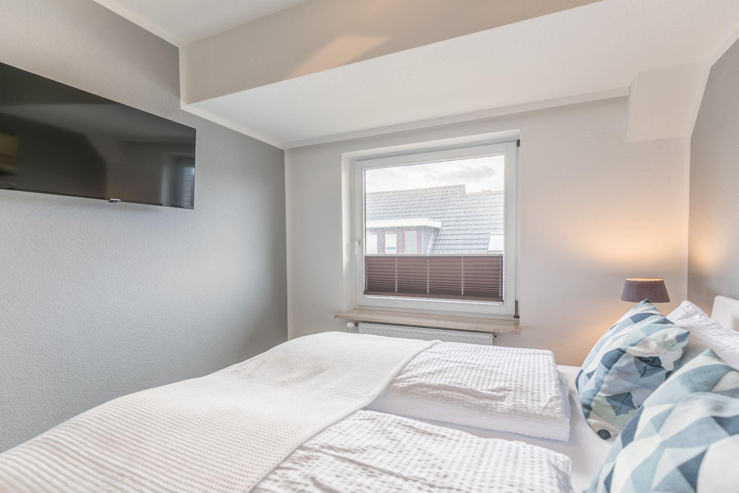 Doppelbett (1,80x2,00m) mit Nachttischen und Lampen, verstellbarere Lattenroste (Kopf- und Fußteil), Kleiderschrank, Flachbild-TV, Verdunkelungsplissee, Schranktresor