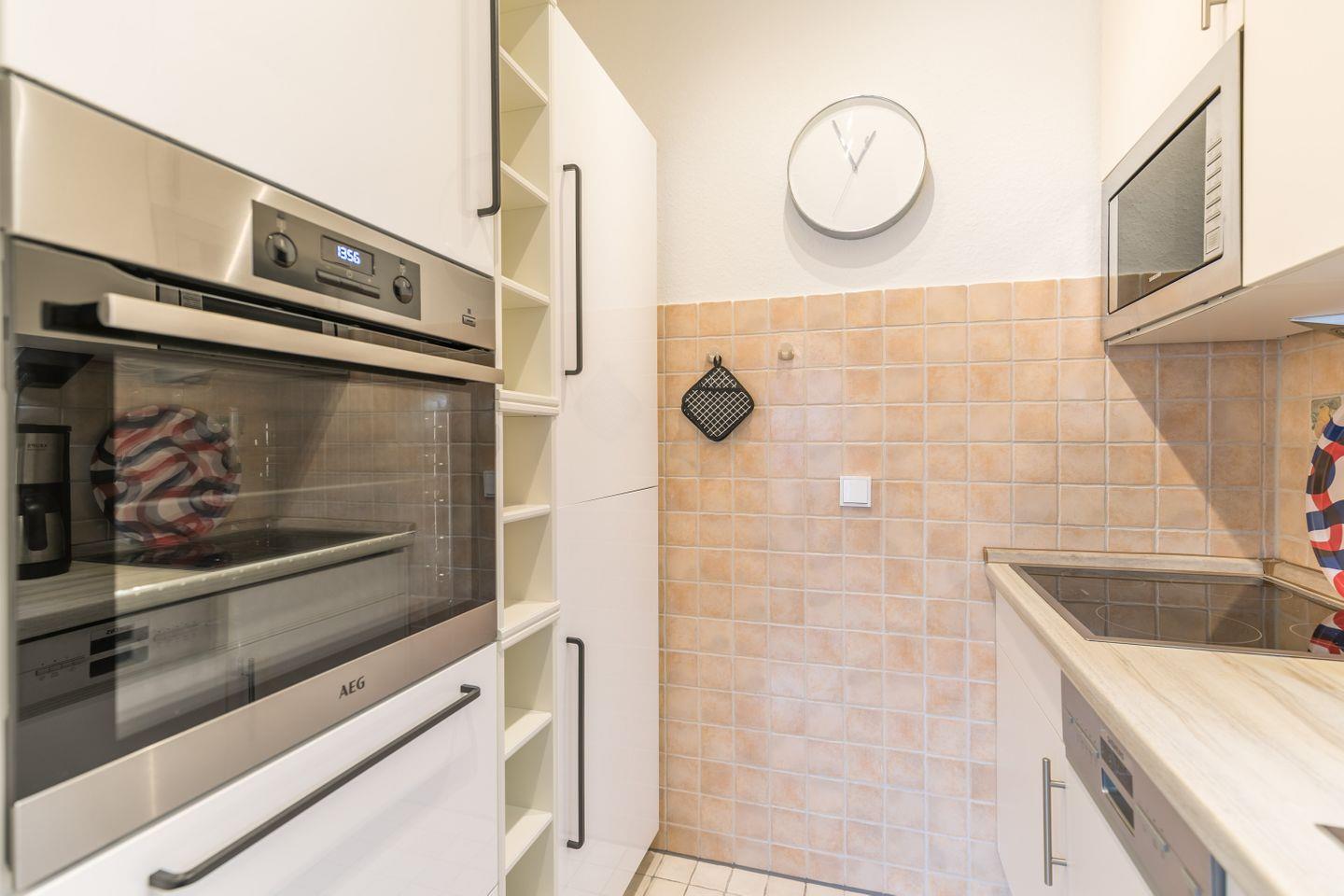 Backofen, Ceranfeld, Geschirrspüler, Kühlschrank mit Eisfach, Kaffeemaschine, Wasserkocher, Toaster, Eierkocher, Mikrowelle, Dunstabzugshaube, Esstisch mit 2 Stühlen