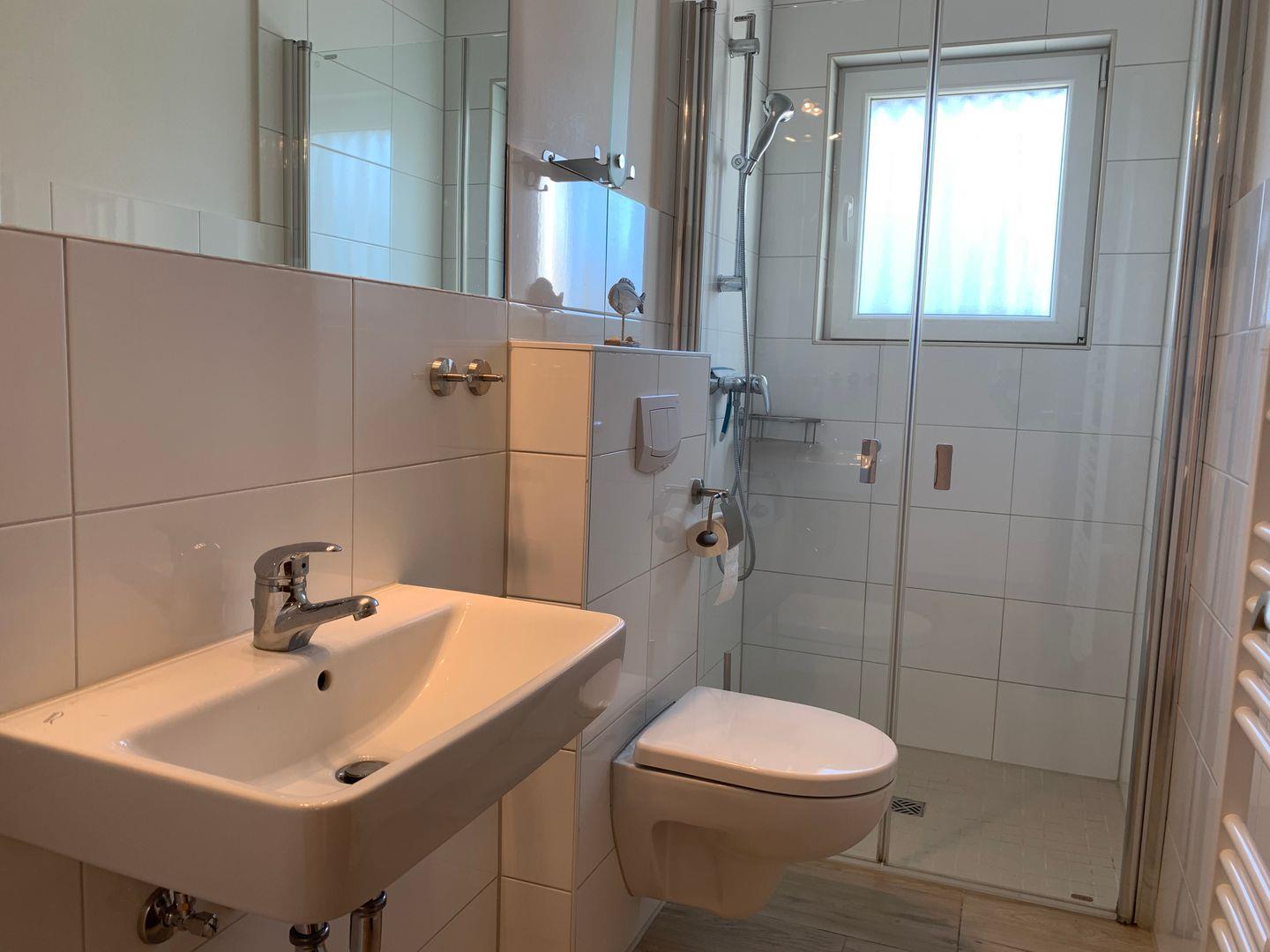 Das Bad verfügt über eine Dusche/WC. Vom Wohnbereich gelangen Sie auf die Terrasse. Das eine Schlafzimmer verfügt über ein Doppelbett, das zweite Schlafzimmer über 2 Einzelbetten. Der Wohnung ist ein PKW - Stellplatz direkt am Haus zugehörig.