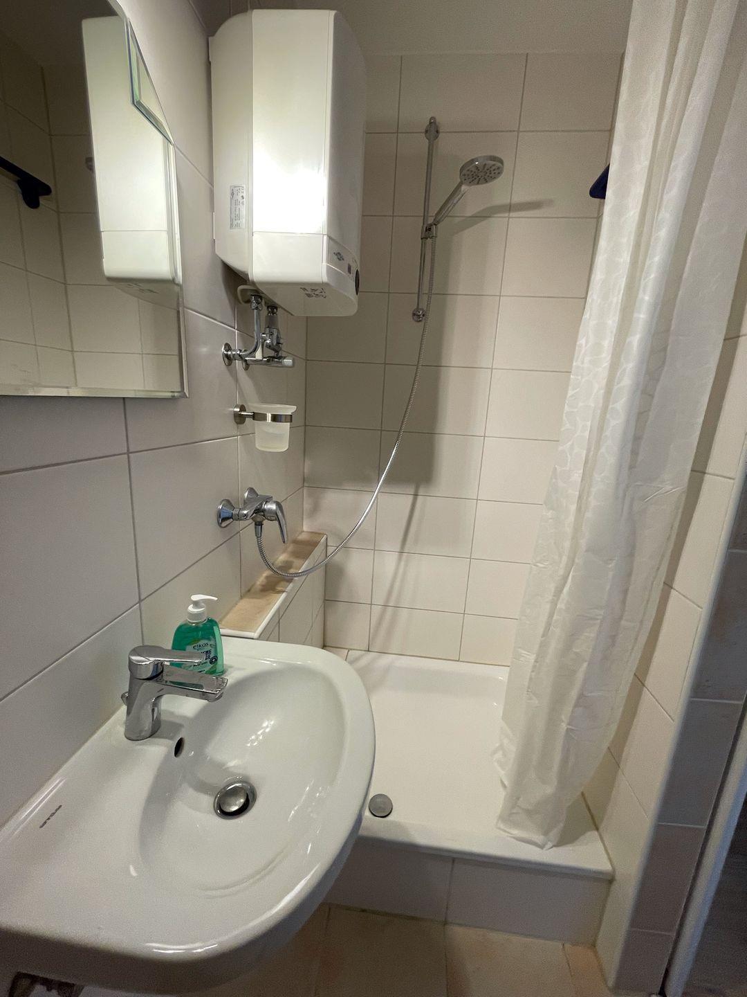 Das Schlafzimmer bietet Platz für zwei Personen und sorgt für erholsame Nächte. Das Badezimmer ist modern gestaltet und verfügt über eine Dusche, ein WC sowie ein Waschbecken. Teil der Ausstattung ist auch ein Wäscheservice, falls Sie während Ihres Aufenthaltes frische Handtücher oder Bettwäsche benötigen.
