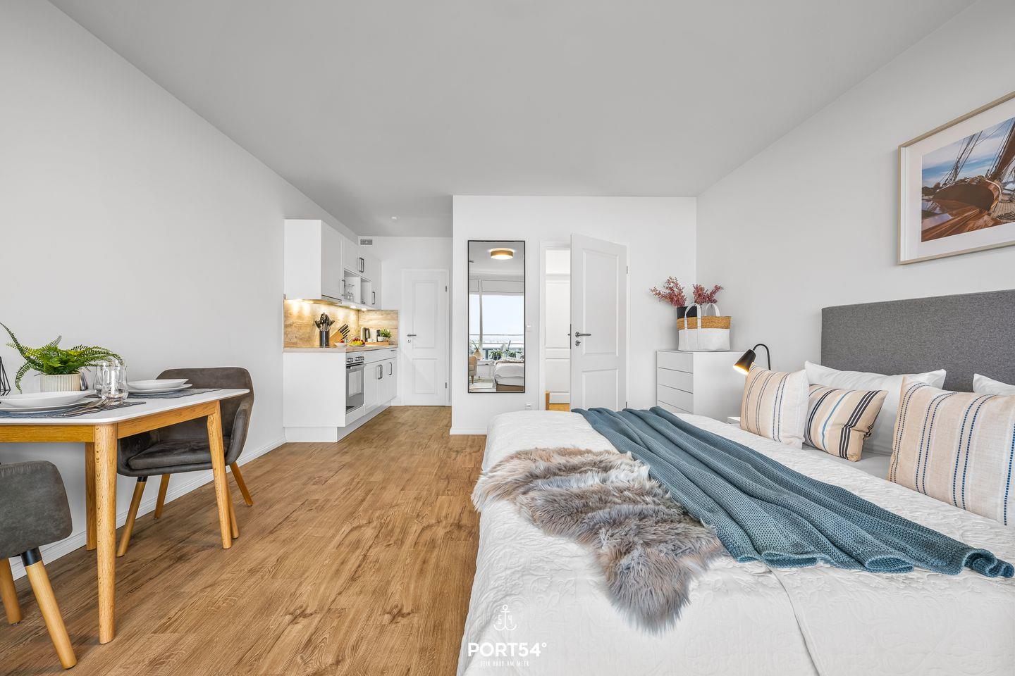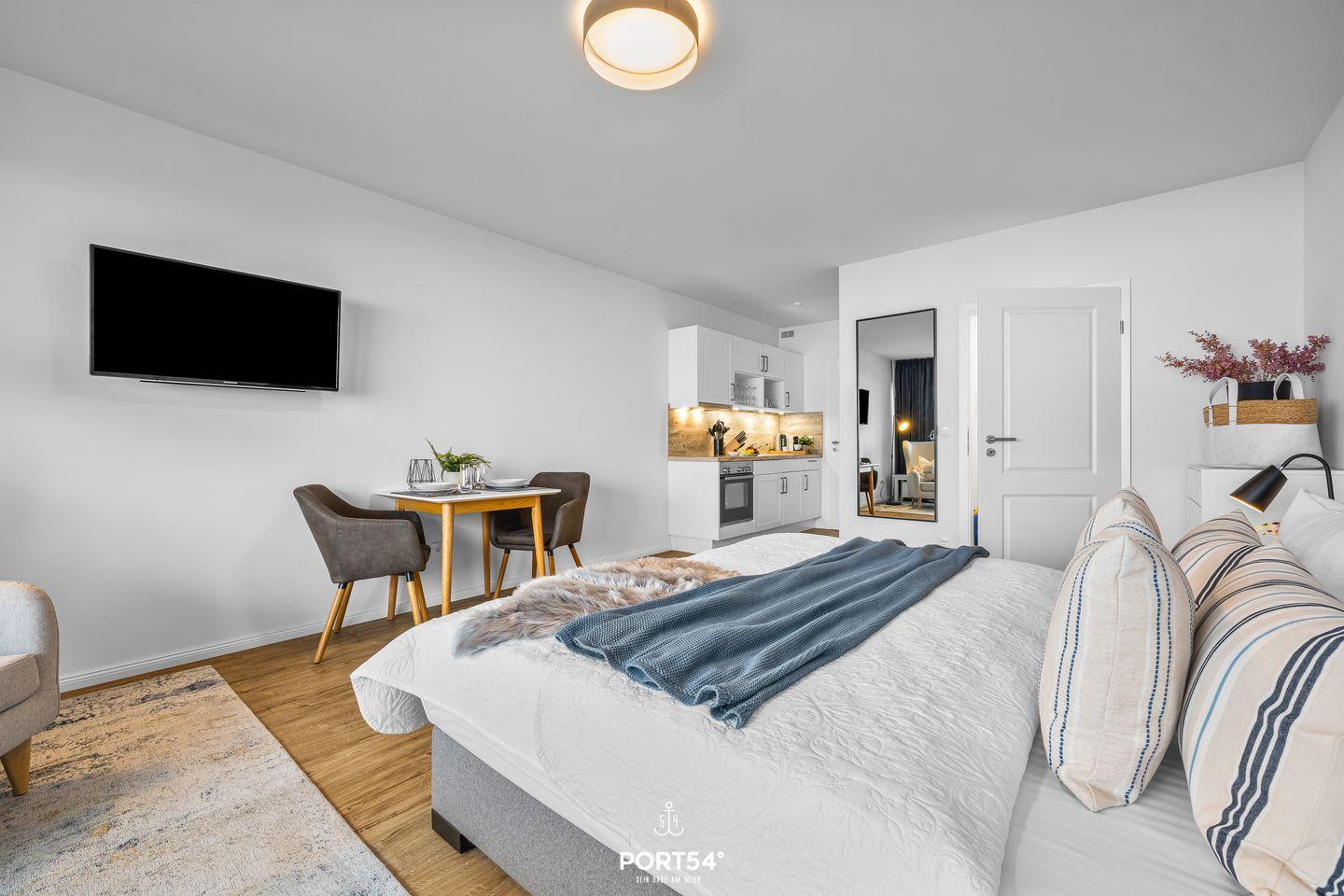 Das neu und modern eingerichtete Apartment überzeugt mit einem stilvollen Wohnkonzept. Der Wohn- und Schlafbereich ist mit einem gemütlichen Doppelbett sowie bequemen Sesseln ausgestattet, die zum Entspannen und Genießen des Ausblicks einladen. Vom Balkon aus eröffnet sich Ihnen ein traumhafter Panoramablick auf die Nordsee – ideal für ruhige Stunden an der frischen Meeresluft. Das moderne Bad mit Dusche rundet den komfortablen Eindruck ab.