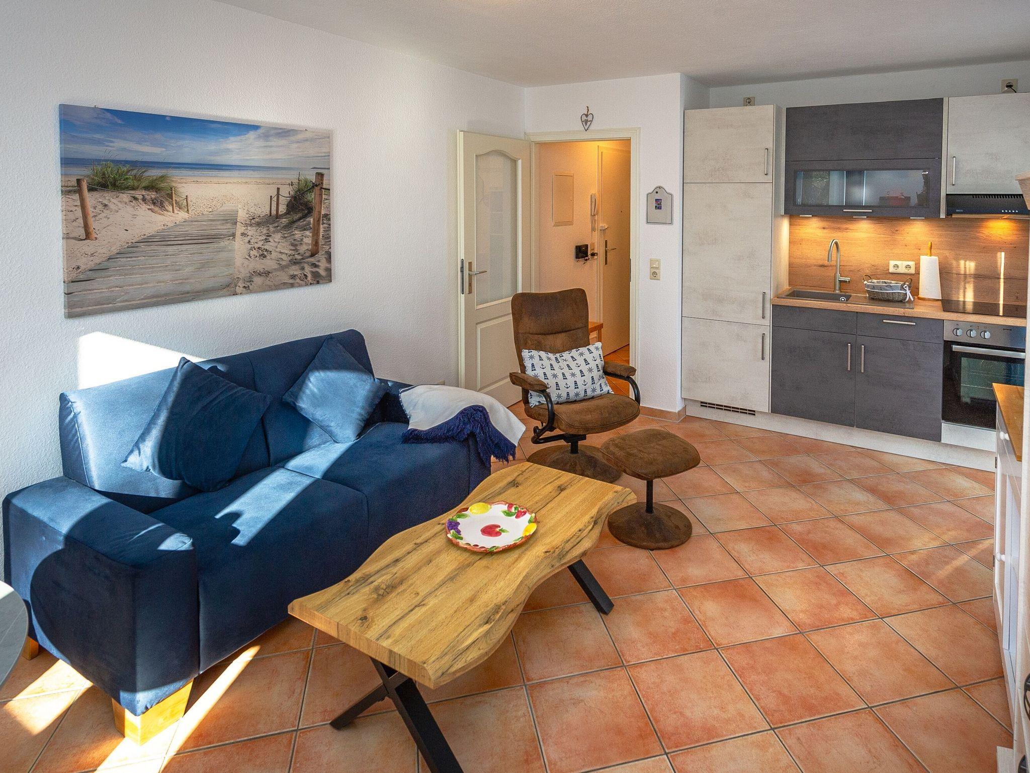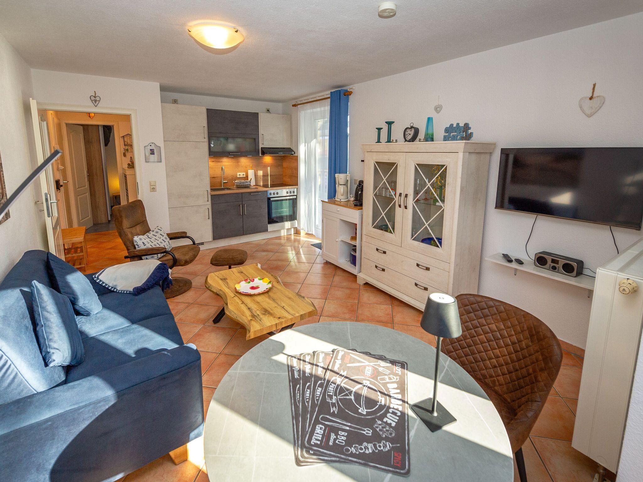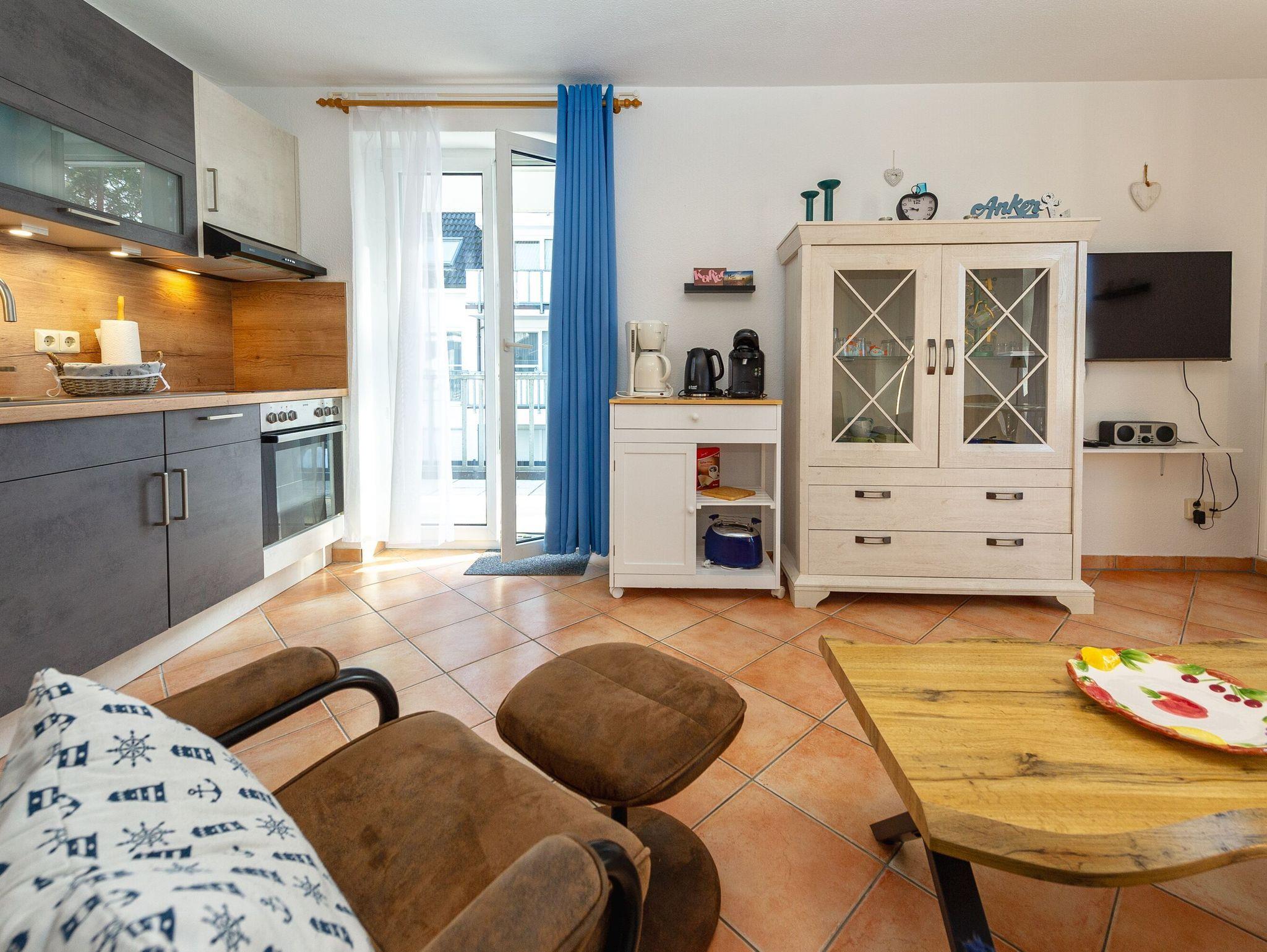 Das geräumige Wohn-/Esszimmer ist mit einer gemütlichen Couch, einem Relaxsessel, einem Flachbild-TV, Internetradio, einer Essecke und einer Küchenzeile eingerichtet. Hier stehen Ihnen u.a. ein Ceranherd inkl. Backofen, ein Kühlschrank mit Gefrierfach, eine Filterkaffee- und eine Tassimo-Kaffeemaschine, ein Wasserkocher, ein Toaster und diverses weiteres Kleininventar zur Verfügung. Einen Bäcker für die frischen Brötchen am Morgen gibt es direkt im Haus, auch zum nächsten Einkaufsmarkt ist es nicht weit.