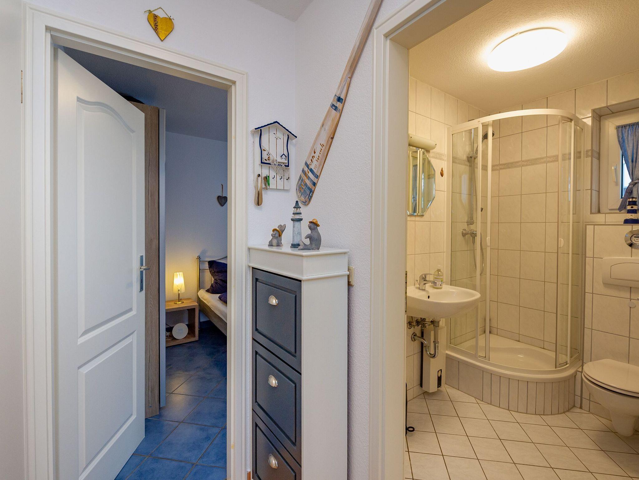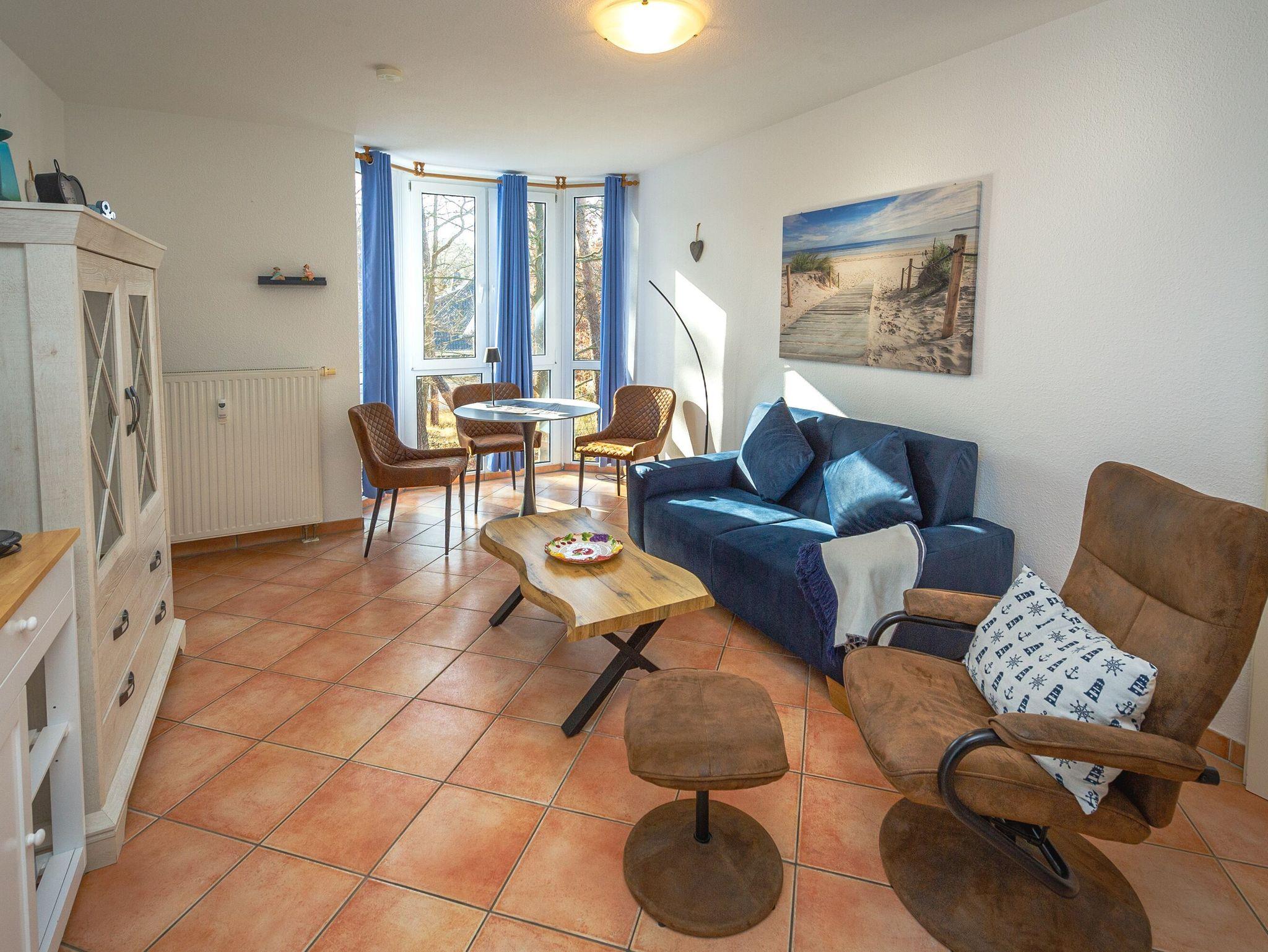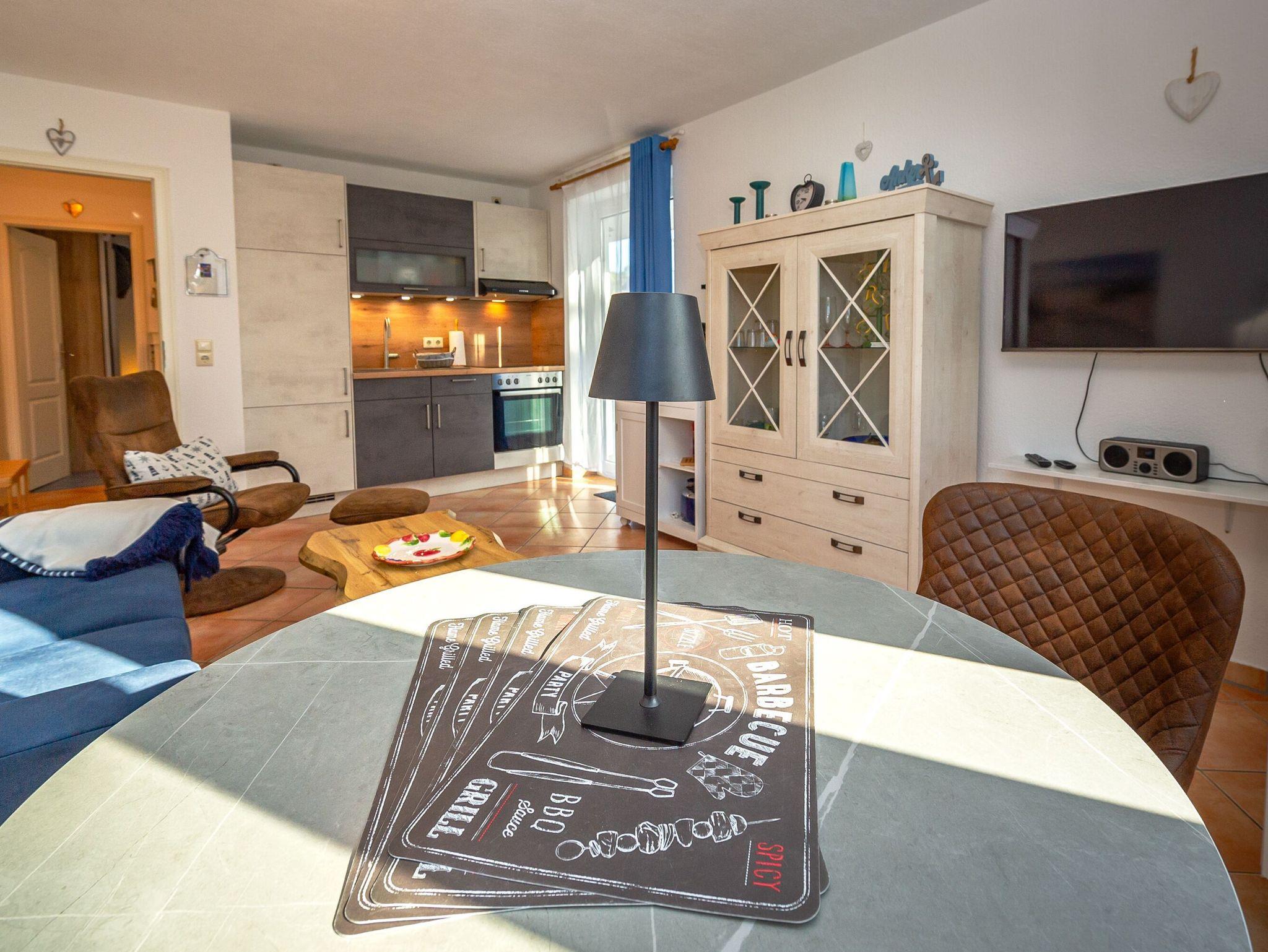 Das geräumige Wohn-/Esszimmer ist mit einer gemütlichen Couch, einem Relaxsessel, einem Flachbild-TV, Internetradio, einer Essecke und einer Küchenzeile eingerichtet. Hier stehen Ihnen u.a. ein Ceranherd inkl. Backofen, ein Kühlschrank mit Gefrierfach, eine Filterkaffee- und eine Tassimo-Kaffeemaschine, ein Wasserkocher, ein Toaster und diverses weiteres Kleininventar zur Verfügung. Einen Bäcker für die frischen Brötchen am Morgen gibt es direkt im Haus, auch zum nächsten Einkaufsmarkt ist es nicht weit.