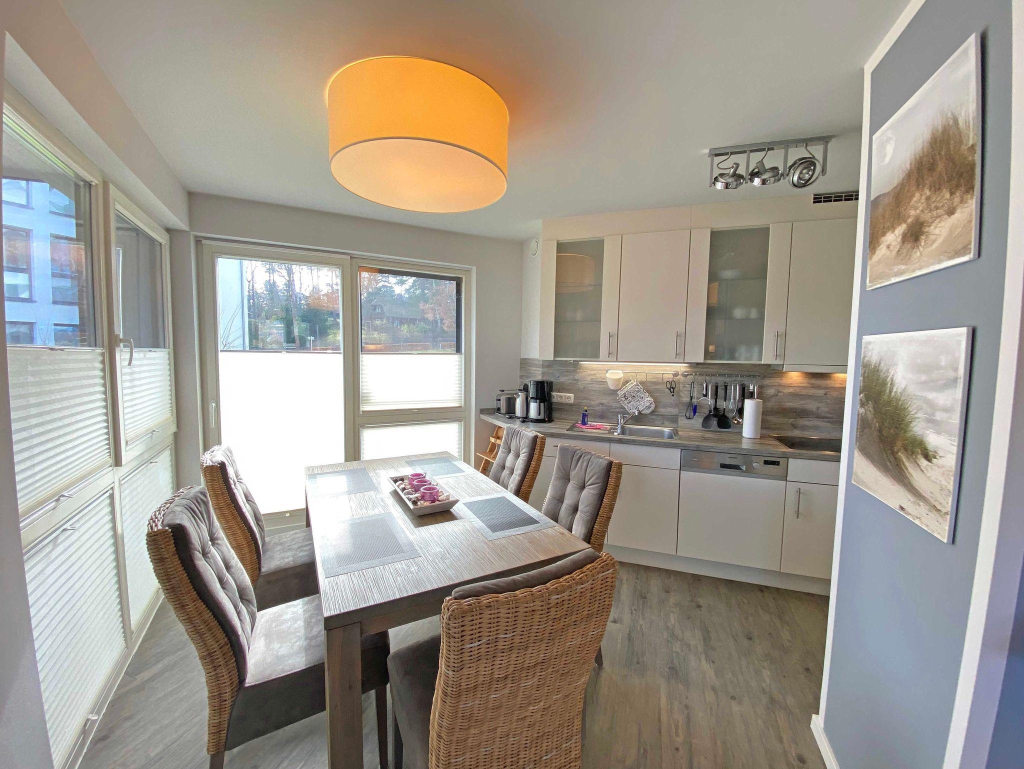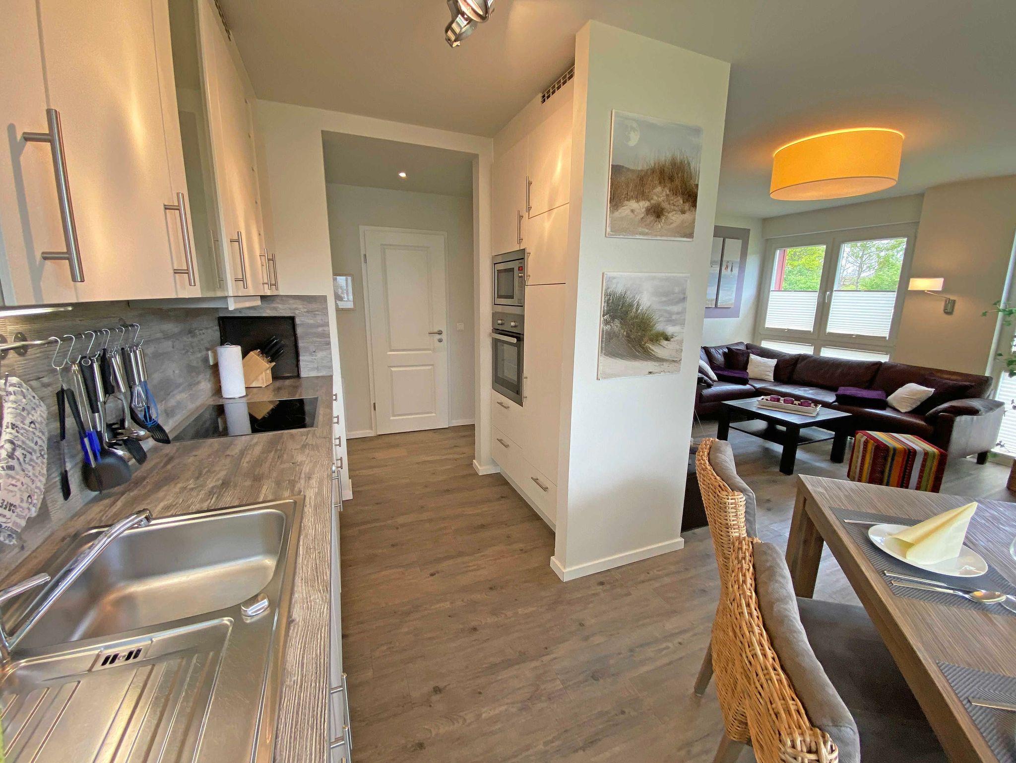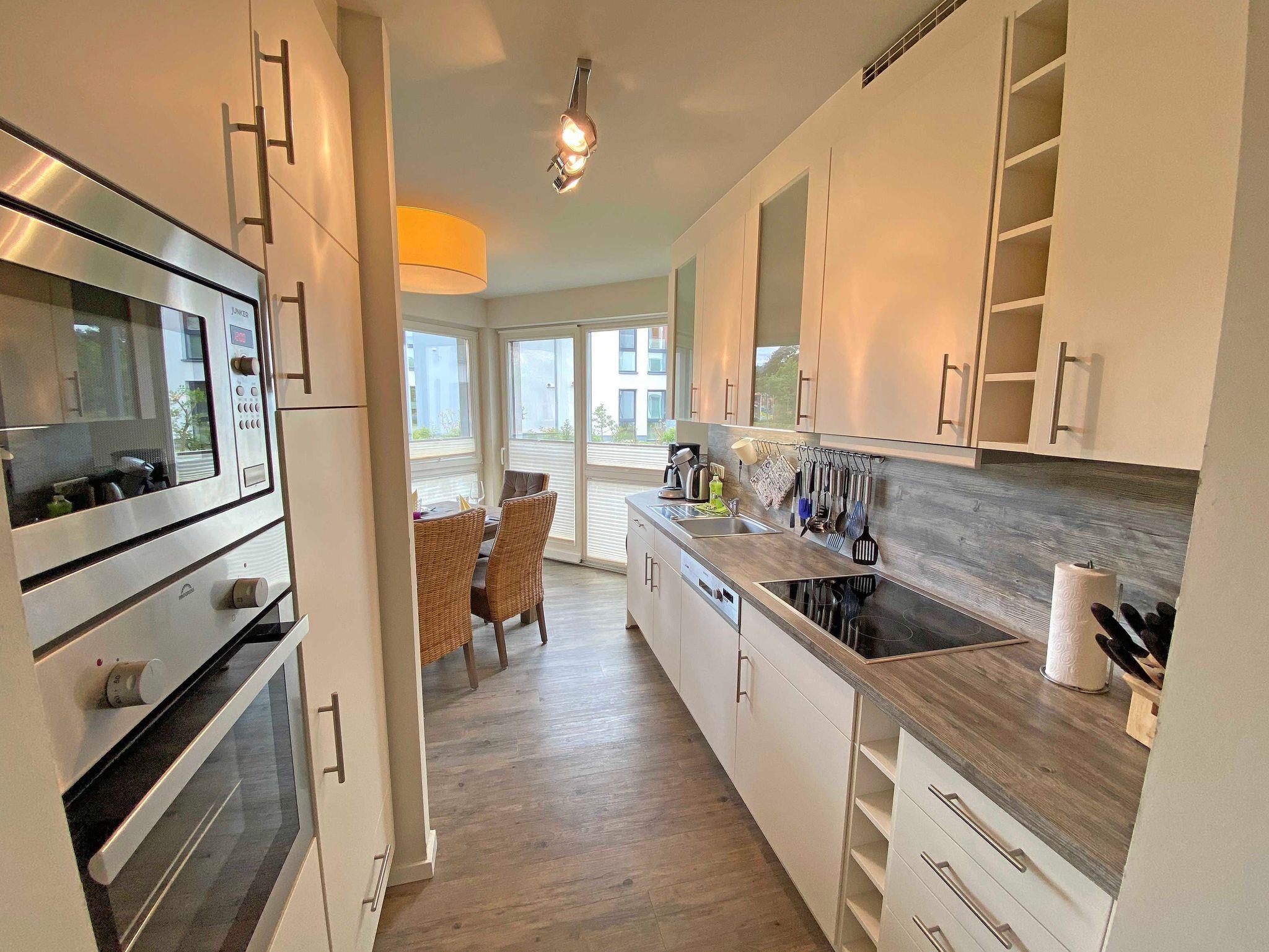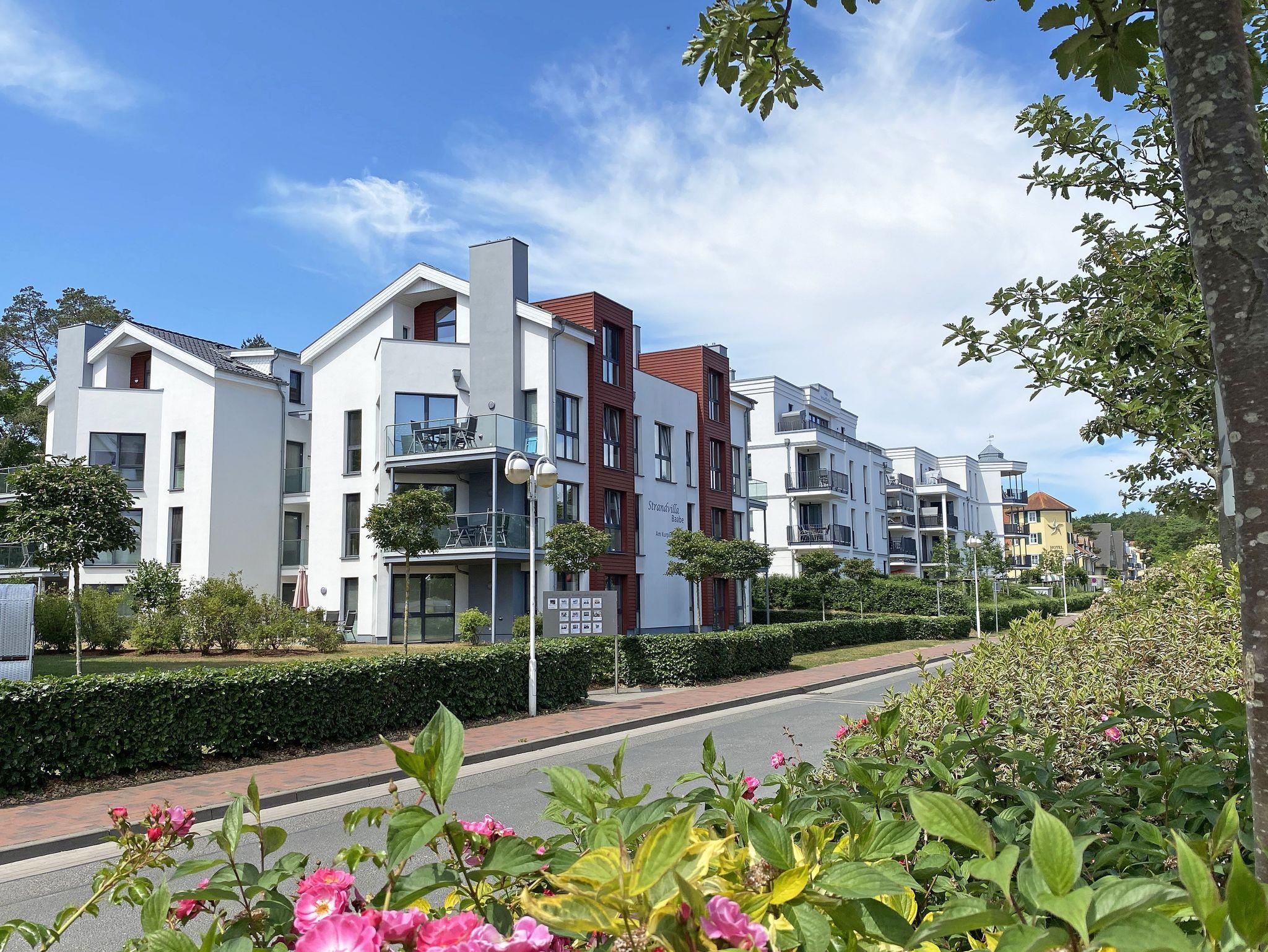 Die stilvoll und komfortabel eingerichtete Nichtraucherferienwohnung „Strandgang“ befindet sich im Erdgeschoss des Hauses. Es erwartet Sie eine 3 - Raumwohnung mit einer Wohnfläche von ca. 70 qm. Die Wohnung ist mit viel Liebe zum Detail ausgestattet und für maximal 4 Erwachsene + 1 Kleinkind bis 3 Jahre im Kinderreisebett. Der offene lichtdurchflutete Wohnbereich mit Kamin ist mit modernen maritimen Möbeln ausgestattet. Eine große, bequeme Ledercouch, Couchtisch mit Hocker, Sideboard und Vitrine sorgen für Gemütlichkeit vor dem Kamin. Für die Unterhaltung steht Ihnen ein Smart-TV mit Blu-Ray-Player zur Verfügung ebenso wie eine kleine Auswahl an Urlaubslektüre und CD`s. Auch auf einen kostenlosen Internetanschluss (WLAN) müssen Sie nicht verzichten. Auf der nach Süd-Osten zum Meer hin ausgerichteten und teilweise überdachten Terrasse, die Sie direkt vom Wohnbereich aus betreten können, stehen Ihnen eine Sitzgarnitur mit Sonnenschirm für ein gemütliches Frühstück in der Morgensonne oder ein Glas Wein am Abend zur Verfügung. Dabei genießen Sie einen wundervollen Blick auf die Strandpromenade und Gartenanlage. Die hochwertig eingerichtete Einbauküche besitzt ein Cerankochfeld, Backofen, Kühlschrank mit Gefrierkombination, Mikrowelle, Toaster, Wasserkocher, Kaffeemaschine, SENSEO Pad Kaffeemaschine mit Thermoskanne, Eierkocher und verschiedenen Küchenutensilien. Der Essbereich schließt sich an und besteht aus einem großen Esstisch und gepolsterten Stühlen. Für einen erholsamen Schlaf steht Ihnen ein Boxspringbett (1,80m x 2,00m) zur Verfügung, mit durchgehendem Topper in Komforthöhe. Nachttischablagen mit Wandleuchten, ein großzügiger Kleiderschrank, Kommode und ein Herrendiener ergänzen die Ausstattung im Schlafzimmer. Ein weiteres Schlafzimmer ist mit 2 Boxspringbetten (0,90m x 2,00m), Kleiderschrank, Schreibtisch mit Stuhl und einem zusätzlichen TV ausgestattet. In allen Räumen gibt es einen Sichtschutz mit Faltjalousien, Verdunkelung in den Schlafzimmern, sowie Insektenschutzgitter. Das große Bad mit Fenster, Waschtisch, Wandspiegel, ebenerdiger Regendusche, Wellnesswanne, WC, Haartrockner, Handtuchtrockner und Kosmetikspiegel ist Ihr Wellnessbereich! Mit der Sauna, Bio-Ofen und LED-Farblicht ist es ein Erlebnis im Sommer wie auch im Winter. Von der Sauna unter die Regendusche oder auch direkt in die Ostsee, danach in die Wellness-Wanne und dann zum Ausklang eine gute Tasse Tee oder ein Glas Rotwein vor dem Kamin. Das ist Urlaub! Ein zweites Bad im Innenbereich bietet Ihnen eine große Dusche, Waschtisch, Haartrockner und WC. Für die kleine Wäsche gibt es eine Waschmaschine / Trockner im Bad. Der Flurbereich ist mit einem Ganzkörperspiegel, Garderobe und Schuhablage ausgestattet. Alle Wohn- und Schlafräume haben einen angenehmen Vinyl Fußboden. Die Bäder sind gefliest. Eine Fußbodenheizung sorgt an kühleren Tagen für wohlige Wärme. Für unsere kleinen Gäste stehen ein Kinderreisebett sowie ein Hochstuhl inklusive zur Verfügung. Ihre eigenen oder gemieteten Fahrräder können Sie im Fahrradraum der Tiefgarage abstellen. In der Tiefgarage steht Ihnen ein PKW-Abstellplatz (Nr.04, Einfahrtshöhe 1,95m) zur Verfügung. Auf der Grünanlage des Villen Ensembles sind Grillplätze zur Gemeinschaftsnutzung vorhanden. 1 kleines Haustier ist mit seinem eigenen Schlafplatz gegen eine Gebühr ein gern gesehener Gast. Die Erstausstattung eines Wäschepaketes (komplette Bettwäsche, 1 Duschhandtuch, 2 kleine Handtücher) können Sie bis 14 Tage vor Anreise gegen einen Aufpreis dazu buchen oder durch eigene ergänzen. Ab 2 gebuchten Paketen erhalten Sie einmalig 1 Geschirrtuch und einen Duschvorleger dazu.