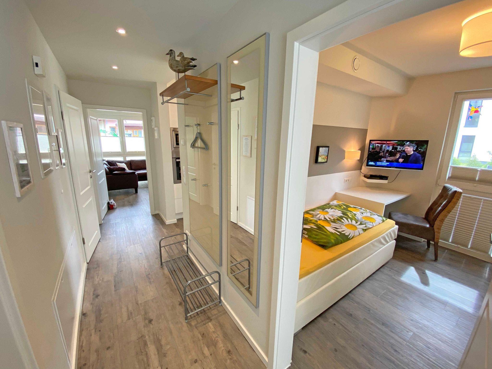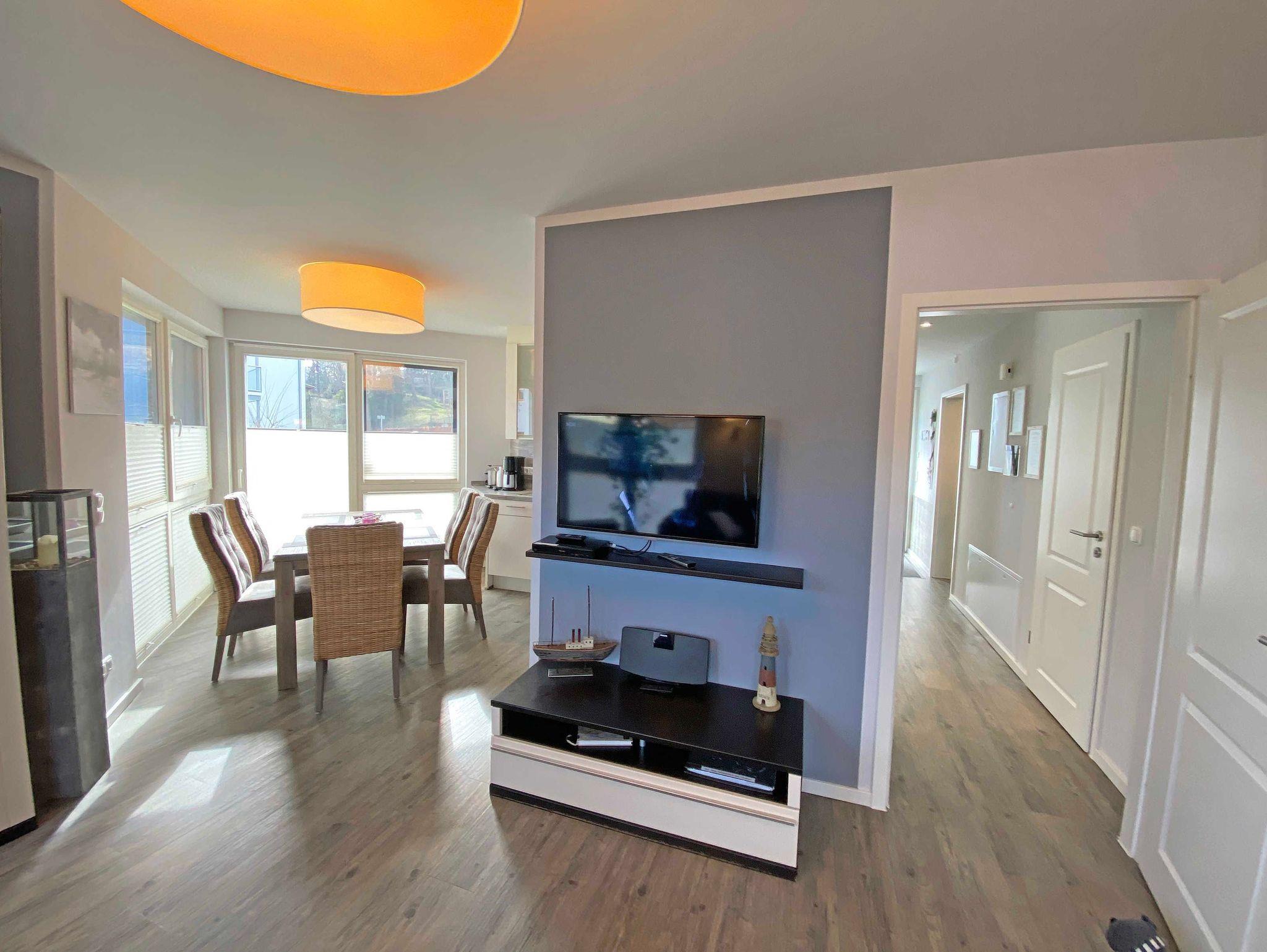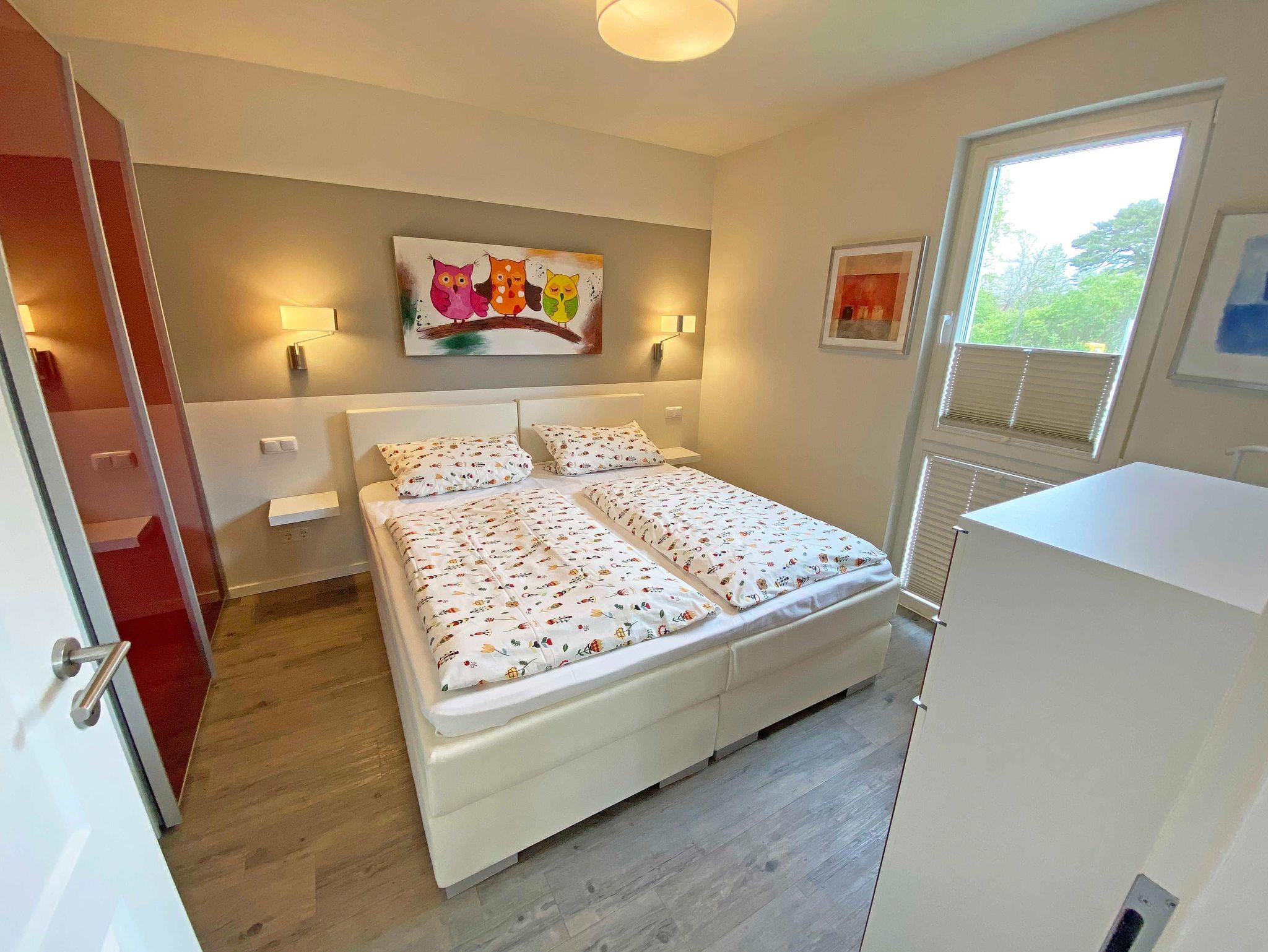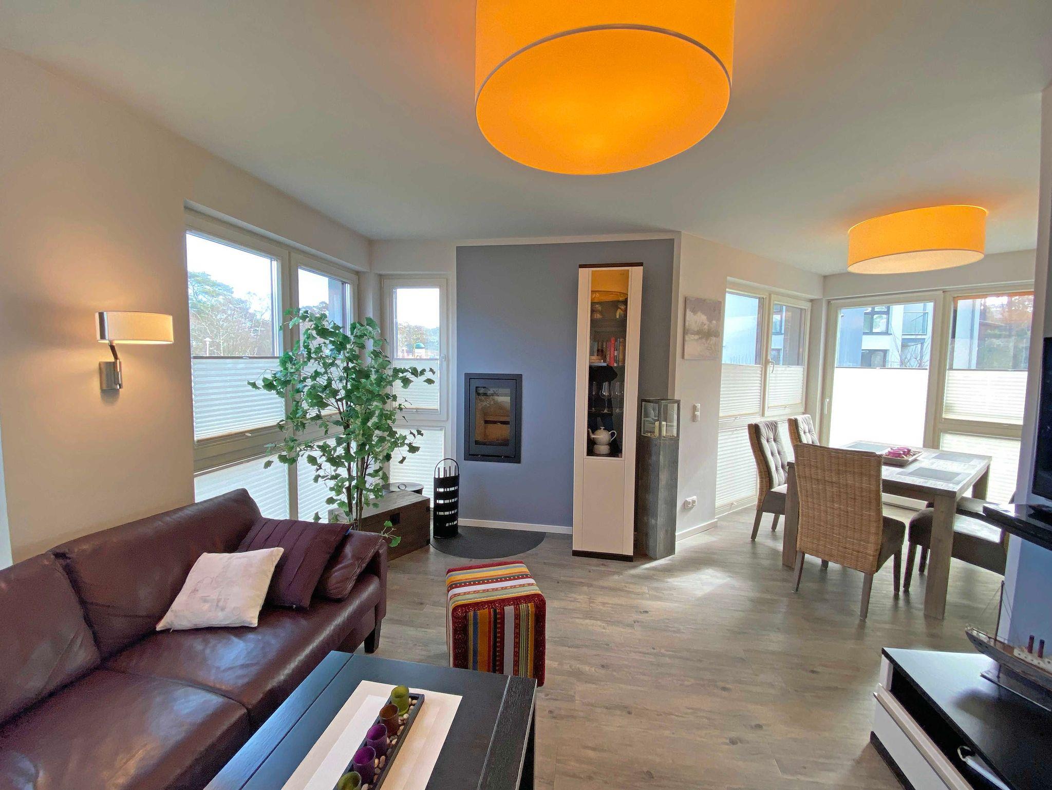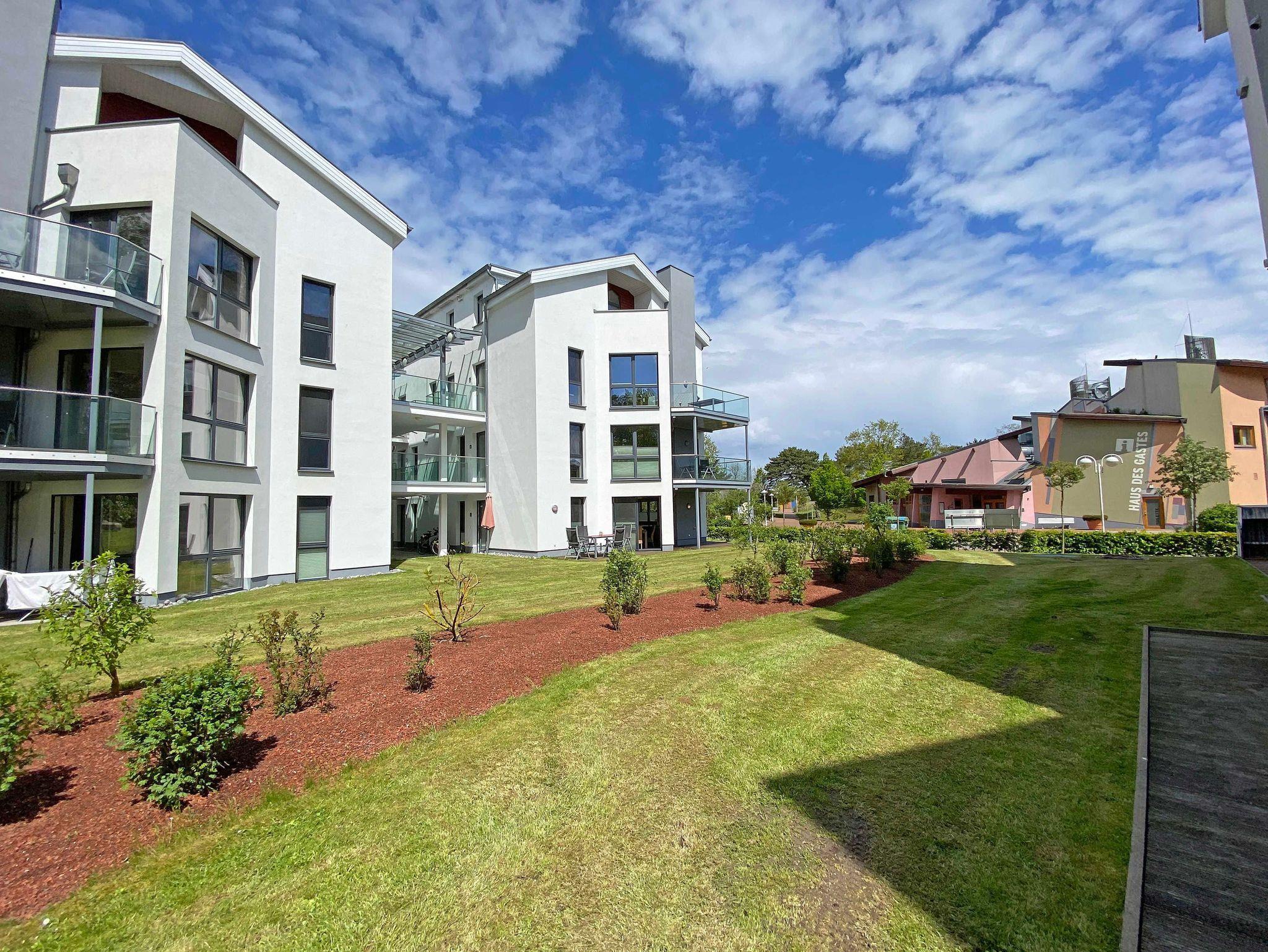 Die stilvoll und komfortabel eingerichtete Nichtraucherferienwohnung „Strandgang“ befindet sich im Erdgeschoss des Hauses. Es erwartet Sie eine 3 - Raumwohnung mit einer Wohnfläche von ca. 70 qm. Die Wohnung ist mit viel Liebe zum Detail ausgestattet und für maximal 4 Erwachsene + 1 Kleinkind bis 3 Jahre im Kinderreisebett. Der offene lichtdurchflutete Wohnbereich mit Kamin ist mit modernen maritimen Möbeln ausgestattet. Eine große, bequeme Ledercouch, Couchtisch mit Hocker, Sideboard und Vitrine sorgen für Gemütlichkeit vor dem Kamin. Für die Unterhaltung steht Ihnen ein Smart-TV mit Blu-Ray-Player zur Verfügung ebenso wie eine kleine Auswahl an Urlaubslektüre und CD`s. Auch auf einen kostenlosen Internetanschluss (WLAN) müssen Sie nicht verzichten. Auf der nach Süd-Osten zum Meer hin ausgerichteten und teilweise überdachten Terrasse, die Sie direkt vom Wohnbereich aus betreten können, stehen Ihnen eine Sitzgarnitur mit Sonnenschirm für ein gemütliches Frühstück in der Morgensonne oder ein Glas Wein am Abend zur Verfügung. Dabei genießen Sie einen wundervollen Blick auf die Strandpromenade und Gartenanlage. Die hochwertig eingerichtete Einbauküche besitzt ein Cerankochfeld, Backofen, Kühlschrank mit Gefrierkombination, Mikrowelle, Toaster, Wasserkocher, Kaffeemaschine, SENSEO Pad Kaffeemaschine mit Thermoskanne, Eierkocher und verschiedenen Küchenutensilien. Der Essbereich schließt sich an und besteht aus einem großen Esstisch und gepolsterten Stühlen. Für einen erholsamen Schlaf steht Ihnen ein Boxspringbett (1,80m x 2,00m) zur Verfügung, mit durchgehendem Topper in Komforthöhe. Nachttischablagen mit Wandleuchten, ein großzügiger Kleiderschrank, Kommode und ein Herrendiener ergänzen die Ausstattung im Schlafzimmer. Ein weiteres Schlafzimmer ist mit 2 Boxspringbetten (0,90m x 2,00m), Kleiderschrank, Schreibtisch mit Stuhl und einem zusätzlichen TV ausgestattet. In allen Räumen gibt es einen Sichtschutz mit Faltjalousien, Verdunkelung in den Schlafzimmern, sowie Insektenschutzgitter. Das große Bad mit Fenster, Waschtisch, Wandspiegel, ebenerdiger Regendusche, Wellnesswanne, WC, Haartrockner, Handtuchtrockner und Kosmetikspiegel ist Ihr Wellnessbereich! Mit der Sauna, Bio-Ofen und LED-Farblicht ist es ein Erlebnis im Sommer wie auch im Winter. Von der Sauna unter die Regendusche oder auch direkt in die Ostsee, danach in die Wellness-Wanne und dann zum Ausklang eine gute Tasse Tee oder ein Glas Rotwein vor dem Kamin. Das ist Urlaub! Ein zweites Bad im Innenbereich bietet Ihnen eine große Dusche, Waschtisch, Haartrockner und WC. Für die kleine Wäsche gibt es eine Waschmaschine / Trockner im Bad. Der Flurbereich ist mit einem Ganzkörperspiegel, Garderobe und Schuhablage ausgestattet. Alle Wohn- und Schlafräume haben einen angenehmen Vinyl Fußboden. Die Bäder sind gefliest. Eine Fußbodenheizung sorgt an kühleren Tagen für wohlige Wärme. Für unsere kleinen Gäste stehen ein Kinderreisebett sowie ein Hochstuhl inklusive zur Verfügung. Ihre eigenen oder gemieteten Fahrräder können Sie im Fahrradraum der Tiefgarage abstellen. In der Tiefgarage steht Ihnen ein PKW-Abstellplatz (Nr.04, Einfahrtshöhe 1,95m) zur Verfügung. Auf der Grünanlage des Villen Ensembles sind Grillplätze zur Gemeinschaftsnutzung vorhanden. 1 kleines Haustier ist mit seinem eigenen Schlafplatz gegen eine Gebühr ein gern gesehener Gast. Die Erstausstattung eines Wäschepaketes (komplette Bettwäsche, 1 Duschhandtuch, 2 kleine Handtücher) können Sie bis 14 Tage vor Anreise gegen einen Aufpreis dazu buchen oder durch eigene ergänzen. Ab 2 gebuchten Paketen erhalten Sie einmalig 1 Geschirrtuch und einen Duschvorleger dazu.