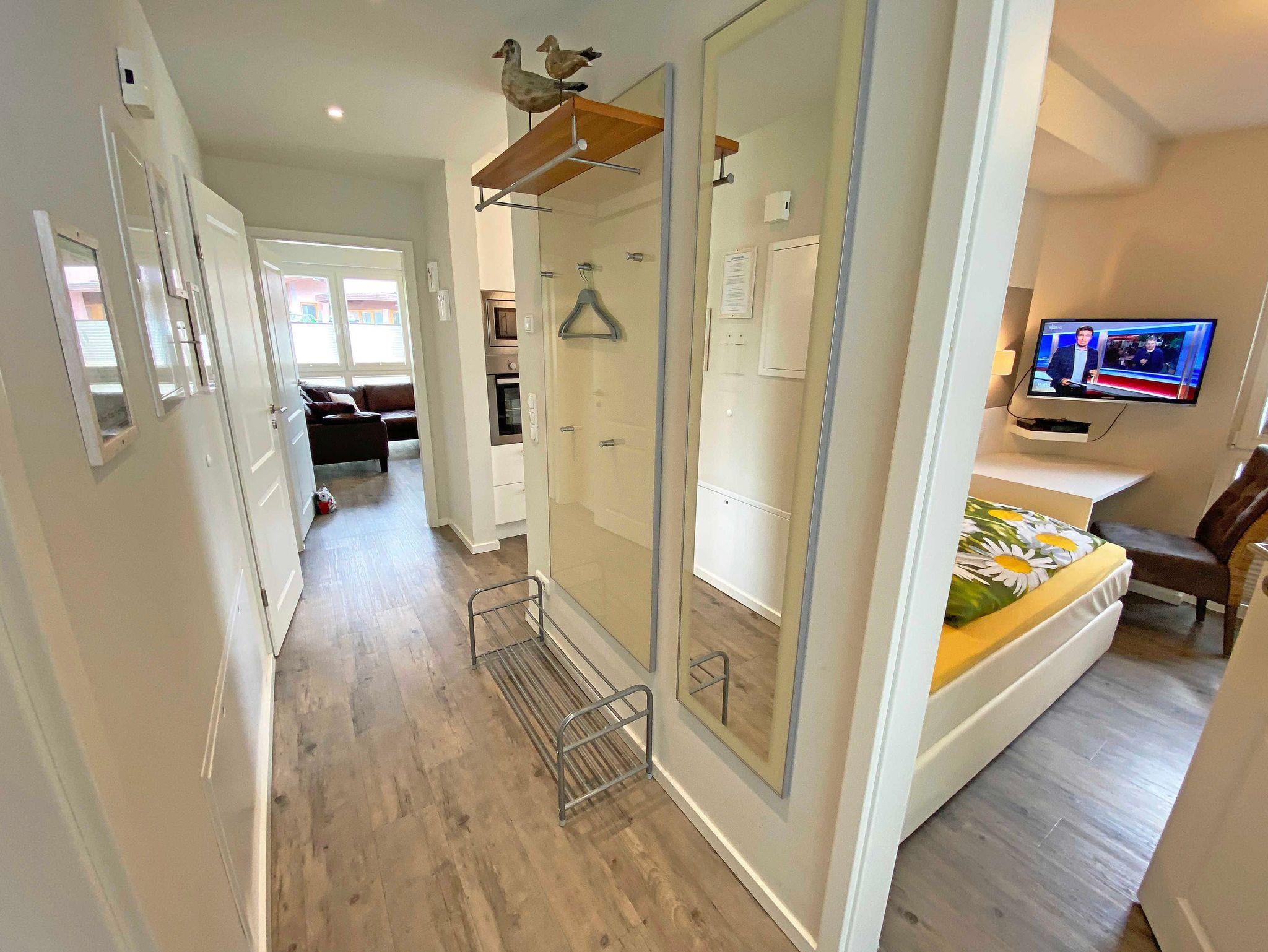 Die stilvoll und komfortabel eingerichtete Nichtraucherferienwohnung ?Strandgang? befindet sich im Erdgeschoss des Hauses. Es erwartet Sie eine 3 - Raumwohnung mit einer Wohnfläche von ca. 70 qm. Die Wohnung ist mit viel Liebe zum Detail ausgestattet und für maximal 4 Erwachsene + 1 Kleinkind bis 3 Jahre im Kinderreisebett. Der offene lichtdurchflutete Wohnbereich mit Kamin ist mit modernen maritimen Möbeln ausgestattet. Eine große, bequeme Ledercouch, Couchtisch mit Hocker, Sideboard und Vitrine sorgen für Gemütlichkeit vor dem Kamin. Für die Unterhaltung steht Ihnen ein Smart-TV mit Blu-Ray-Player zur Verfügung ebenso wie eine kleine Auswahl an Urlaubslektüre und CD`s. Auch auf einen kostenlosen Internetanschluss (WLAN) müssen Sie nicht verzichten. Auf der nach Süd-Osten zum Meer hin ausgerichteten und teilweise überdachten Terrasse, die Sie direkt vom Wohnbereich aus betreten können, stehen Ihnen eine Sitzgarnitur mit Sonnenschirm für ein gemütliches Frühstück in der Morgensonne oder ein Glas Wein am Abend zur Verfügung. Dabei genießen Sie einen wundervollen Blick auf die Strandpromenade und Gartenanlage. Die hochwertig eingerichtete Einbauküche besitzt ein Cerankochfeld, Backofen, Kühlschrank mit Gefrierkombination, Mikrowelle, Toaster, Wasserkocher, Kaffeemaschine, SENSEO Pad Kaffeemaschine mit Thermoskanne, Eierkocher und verschiedenen Küchenutensilien. Der Essbereich schließt sich an und besteht aus einem großen Esstisch und gepolsterten Stühlen. Für einen erholsamen Schlaf steht Ihnen ein Boxspringbett (1,80m x 2,00m) zur Verfügung, mit durchgehendem Topper in Komforthöhe. Nachttischablagen mit Wandleuchten, ein großzügiger Kleiderschrank, Kommode und ein Herrendiener ergänzen die Ausstattung im Schlafzimmer. Ein weiteres Schlafzimmer ist mit 2 Boxspringbetten (0,90m x 2,00m), Kleiderschrank, Schreibtisch mit Stuhl und einem zusätzlichen TV ausgestattet. In allen Räumen gibt es einen Sichtschutz mit Faltjalousien, Verdunkelung in den Schlafzimmern, sowie Insektenschutzgitter. Das große Bad mit Fenster, Waschtisch, Wandspiegel, ebenerdiger Regendusche, Wellnesswanne, WC, Haartrockner, Handtuchtrockner und Kosmetikspiegel ist Ihr Wellnessbereich! Mit der Sauna, Bio-Ofen und LED-Farblicht ist es ein Erlebnis im Sommer wie auch im Winter. Von der Sauna unter die Regendusche oder auch direkt in die Ostsee, danach in die Wellness-Wanne und dann zum Ausklang eine gute Tasse Tee oder ein Glas Rotwein vor dem Kamin. Das ist Urlaub! Ein zweites Bad im Innenbereich bietet Ihnen eine große Dusche, Waschtisch, Haartrockner und WC. Für die kleine Wäsche gibt es eine Waschmaschine / Trockner im Bad. Der Flurbereich ist mit einem Ganzkörperspiegel, Garderobe und Schuhablage ausgestattet. Alle Wohn- und Schlafräume haben einen angenehmen Vinyl Fußboden. Die Bäder sind gefliest. Eine Fußbodenheizung sorgt an kühleren Tagen für wohlige Wärme. Für unsere kleinen Gäste stehen ein Kinderreisebett sowie ein Hochstuhl inklusive zur Verfügung. Ihre eigenen oder gemieteten Fahrräder können Sie im Fahrradraum der Tiefgarage abstellen. In der Tiefgarage steht Ihnen ein PKW-Abstellplatz (Nr.04, Einfahrtshöhe 1,95m) zur Verfügung. Auf der Grünanlage des Villen Ensembles sind Grillplätze zur Gemeinschaftsnutzung vorhanden. 1 kleines Haustier ist mit seinem eigenen Schlafplatz gegen eine Gebühr ein gern gesehener Gast. Die Erstausstattung eines Wäschepaketes (komplette Bettwäsche, 1 Duschhandtuch, 2 kleine Handtücher) können Sie bis 14 Tage vor Anreise gegen einen Aufpreis dazu buchen oder durch eigene ergänzen. Ab 2 gebuchten Paketen erhalten Sie einmalig 1 Geschirrtuch und einen Duschvorleger dazu.