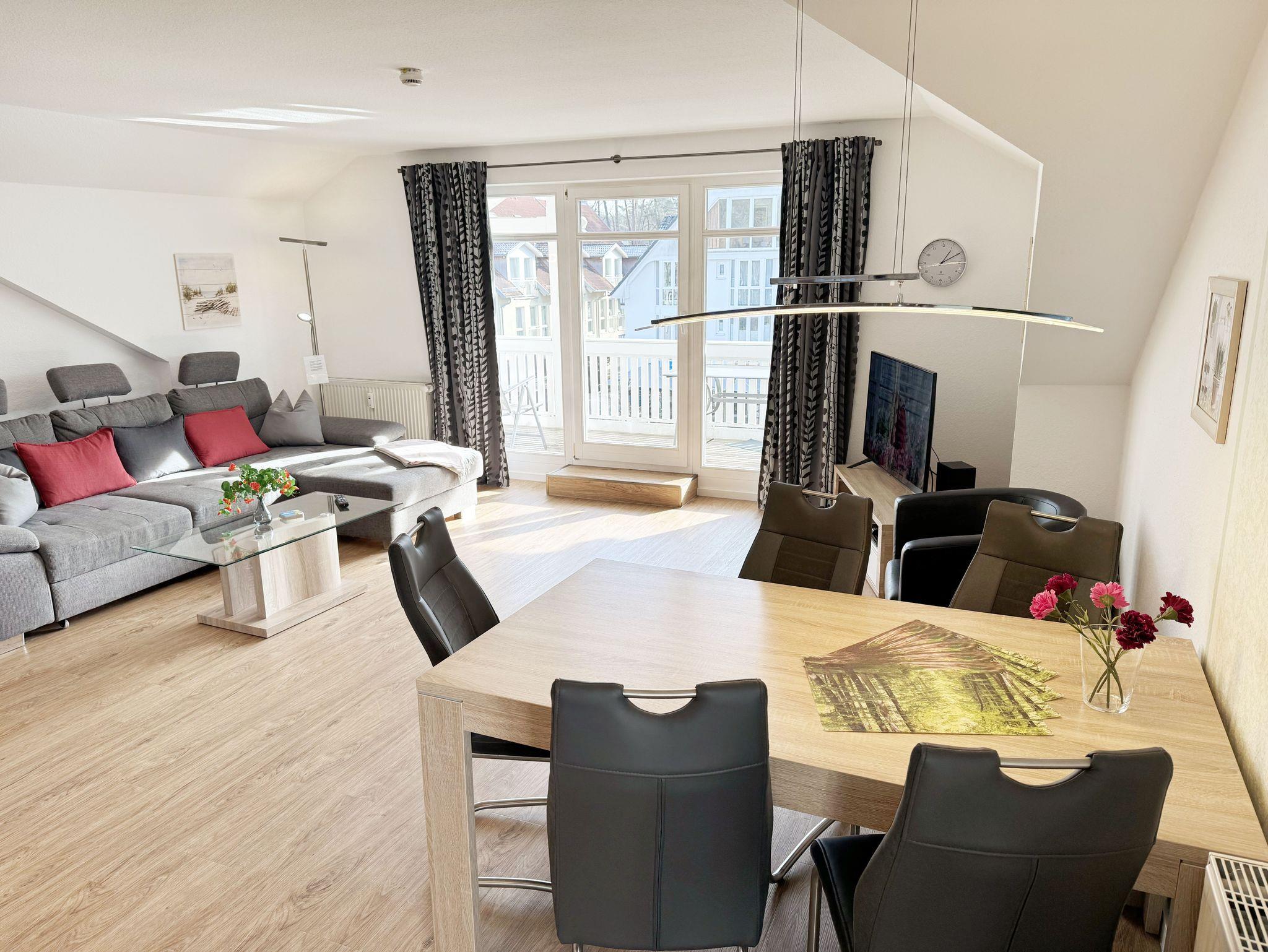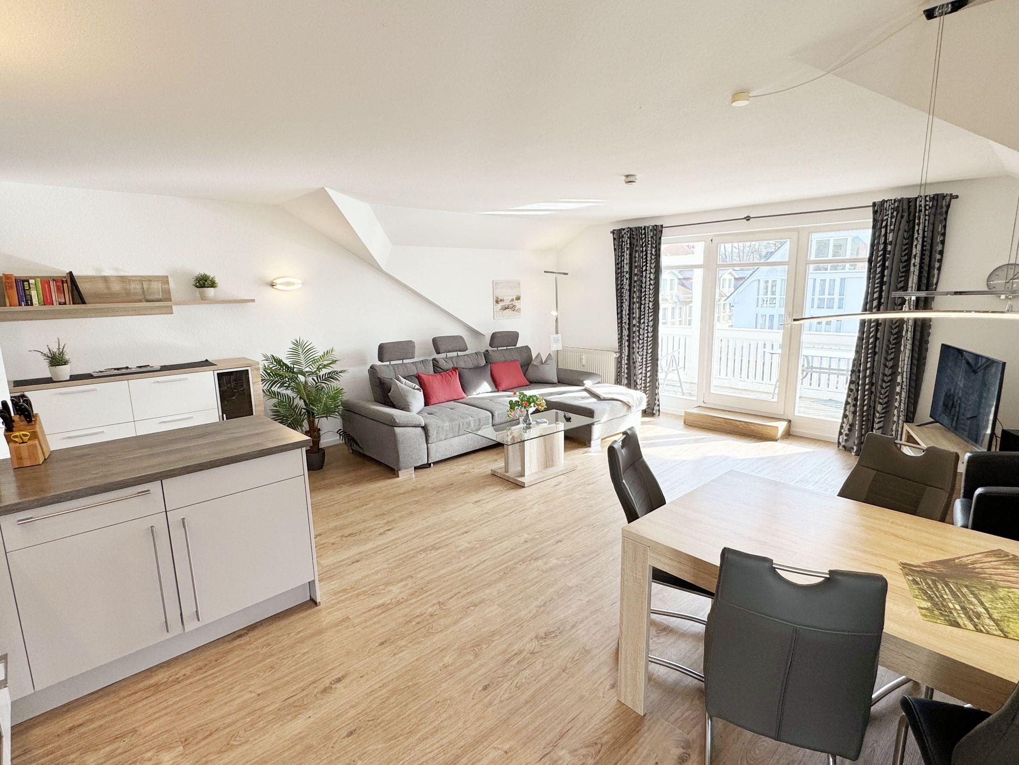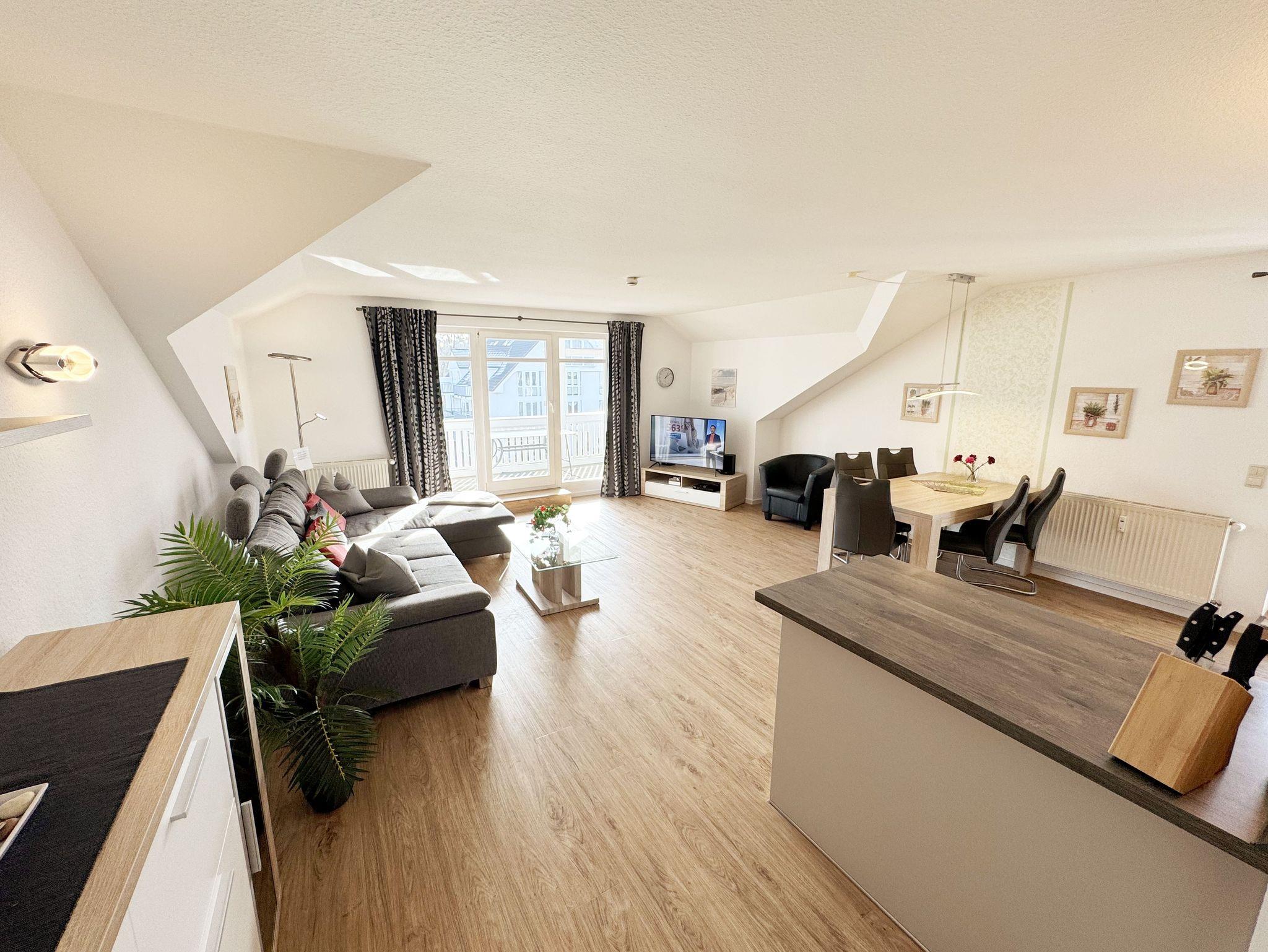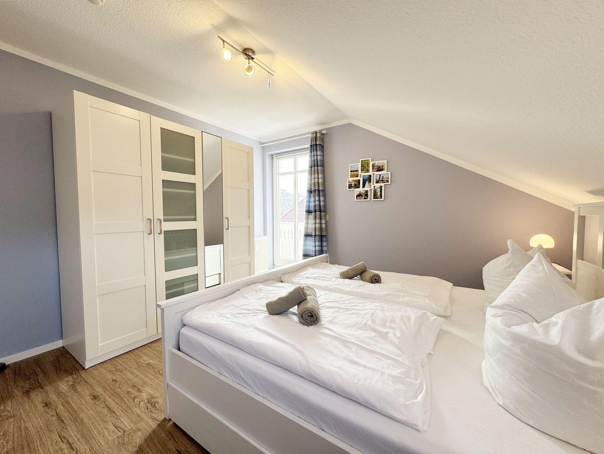 Willkommen in Ihrer perfekten Urlaubsunterkunft! Diese freundliche Nichtraucherwohnung im Dachgeschoss bietet Ihnen auf ca. 70 m² Platz für max. 2 bis 5 Personen und ist ideal für Familien oder Paare. Alle Räumlichkeiten erreichen Sie vom Flur, welcher mit einer Garderobe und einem Schuhschrank ausgestattet ist. Der großzügige Wohnbereich verfügt über eine Couchecke (Aufbettung für 5. Person, 1,50m x 2,25m), einen Couchtisch, eine Leselampe, ein TV-Board mit Smart-TV, ein Blu-Ray-Player, eine Mini-Stereo-Anlage, eine bestuhlte Essecke sowie die integrierte Küchenzeile. Die vollausgestattete Küchenzeile bietet Ihnen alles, was Sie für die Selbstverpflegung brauchen: ein Geschirrspüler, eine Mikrowelle, eine Spüle, ein Kühlschrank mit Eisfach, ein 4-Zonen-Ceranfeld, ein Backofen, ein Wasserkocher, eine Kaffeemaschine, einen Toaster sowie viele kleine Küchenhelfer. Vom Wohnbereich gelangen Sie auf den großzügigen, überdachten und bestuhlten Balkon (Süd/West) von wo Sie einen weiten Blick auf die Flaniermeile von Baabe haben. Das große Schlafzimmer ist mit einem Doppelbett (getrennten Matratzen je 0,90m x 2,00m), Nachttischablagen mit Beleuchtung, einem großen Kleiderschrank sowie Ablageflächen versehen. Zudem haben Sie auch hier einen Zugang auf den seitlichen Westbalkon. Das kleine Schlafzimmer ist mit einem Tandem Bett (2x 0,80m x 2,00m), einer Ablagefläche mit Beleuchtung und einer Kommode mit Flachbild-TV ausgestattet. Beide Schlafzimmer können abgedunkelt werden. Das geflieste Tageslicht-Bad verfügt über eine Dusche mit flachem Einstieg, ein WC, einen Fön, einen Waschtisch, Ablageflächen sowie eine Waschmaschine mit Trocknerfunktion. Im gesamten Wohnbereich wurde Vinylboden in Dielenoptik verlegt. Auch in Ihrem Urlaub brauchen Sie auf einen Internetzugang (WLAN) nicht verzichten, dieser ist für Sie inklusive. Ein PKW-Stellplatz Nr. 05 steht hinter dem Haus zur Verfügung. Haustiere sind in der Wohnung nicht erlaubt. Die Erstausstattung eines Wäschepaketes (komplette Bettwäsche, 1 Duschhandtuch, 1 kleines Handtuch) können Sie bis 14 Tage vor Anreise gegen einen Aufpreis dazu buchen oder durch eigenes Ergänzen. Ab 2 gebuchten Paketen erhalten Sie einmalig 1 Geschirrhandtuch und 1 Duschvorleger hinzu. Buchen Sie jetzt Ihre Auszeit in unserer Ferienwohnung und erleben Sie unvergessliche Tage an der Ostsee! Wir freuen uns auf Ihren Besuch!