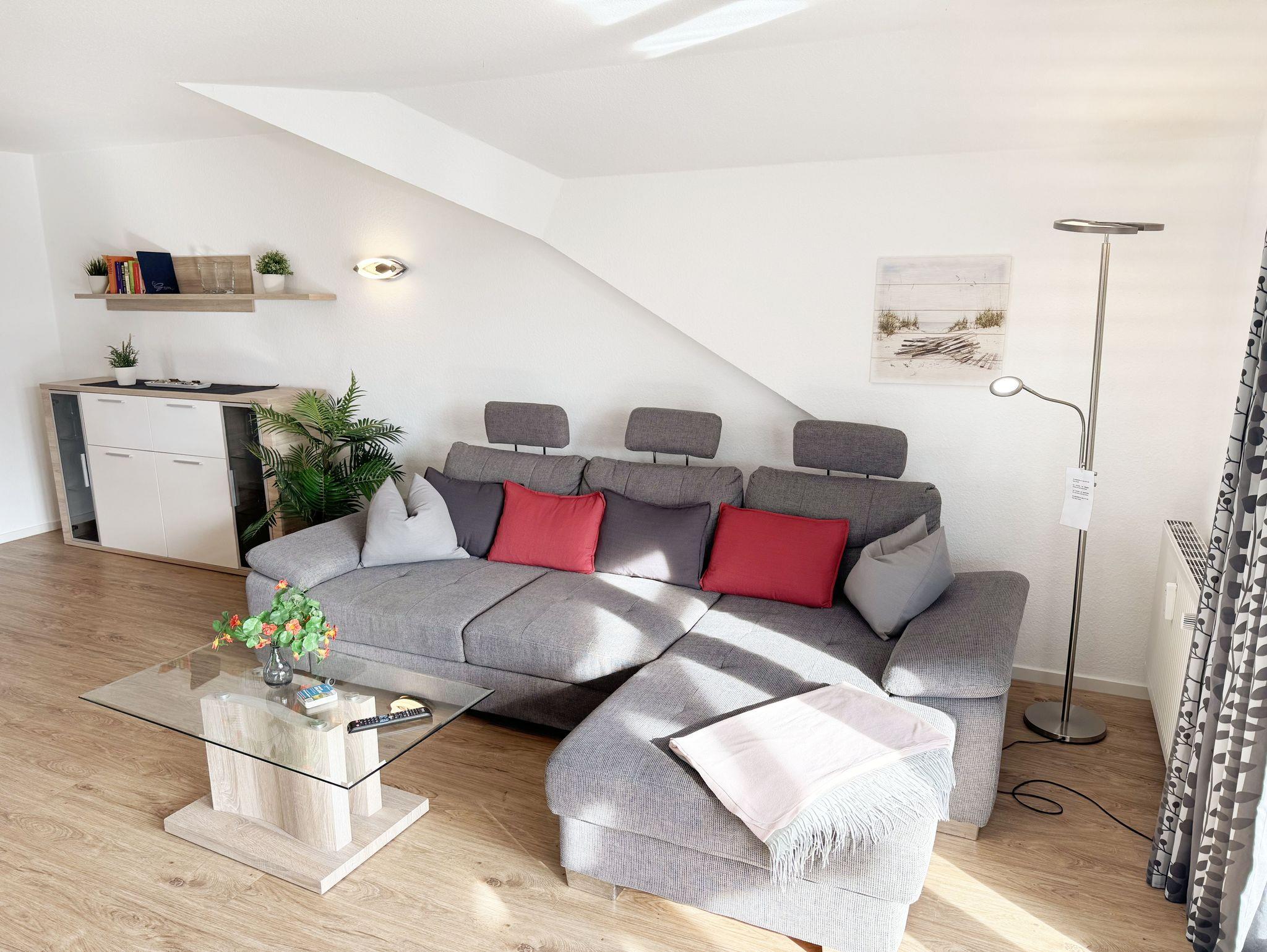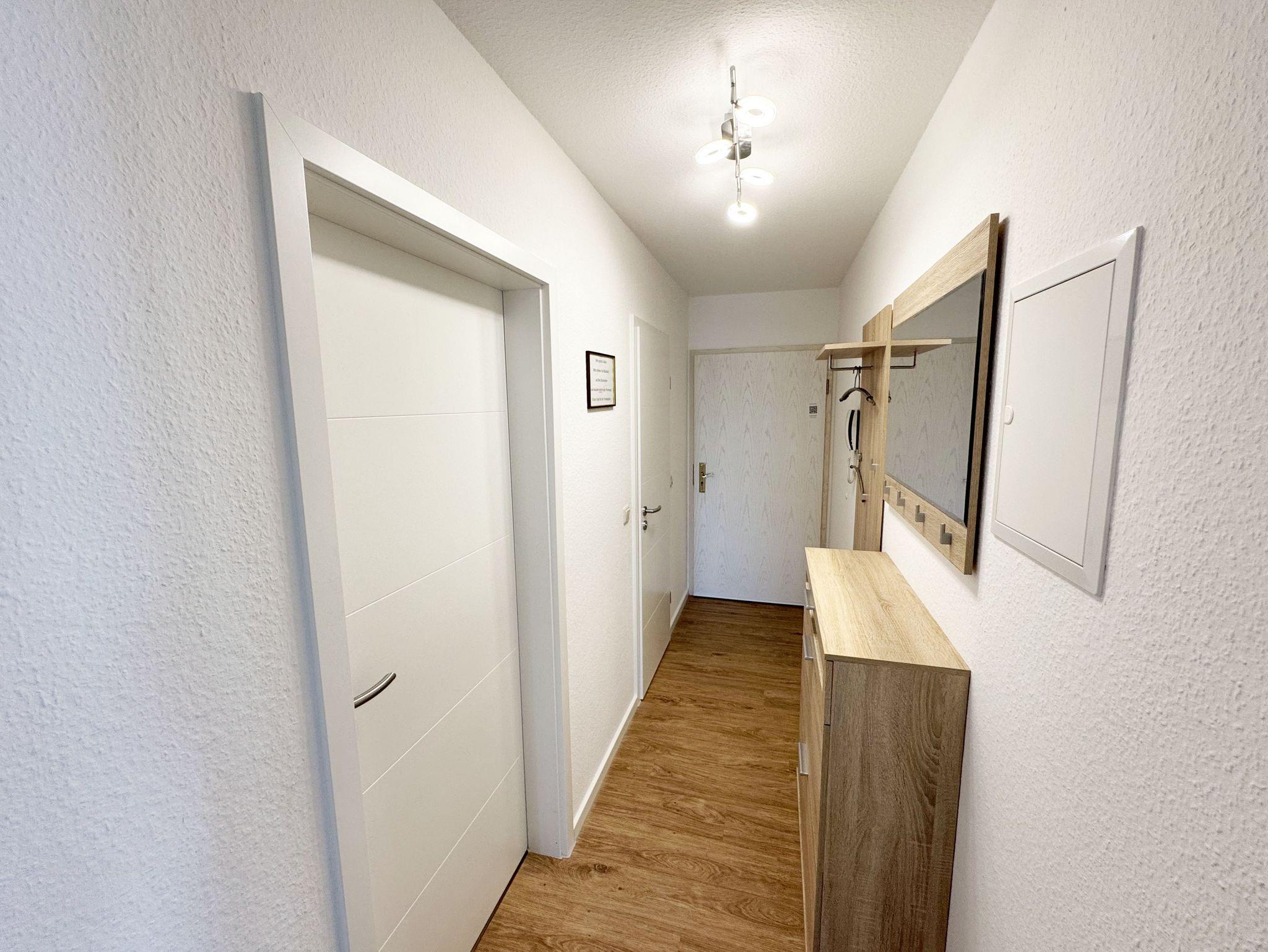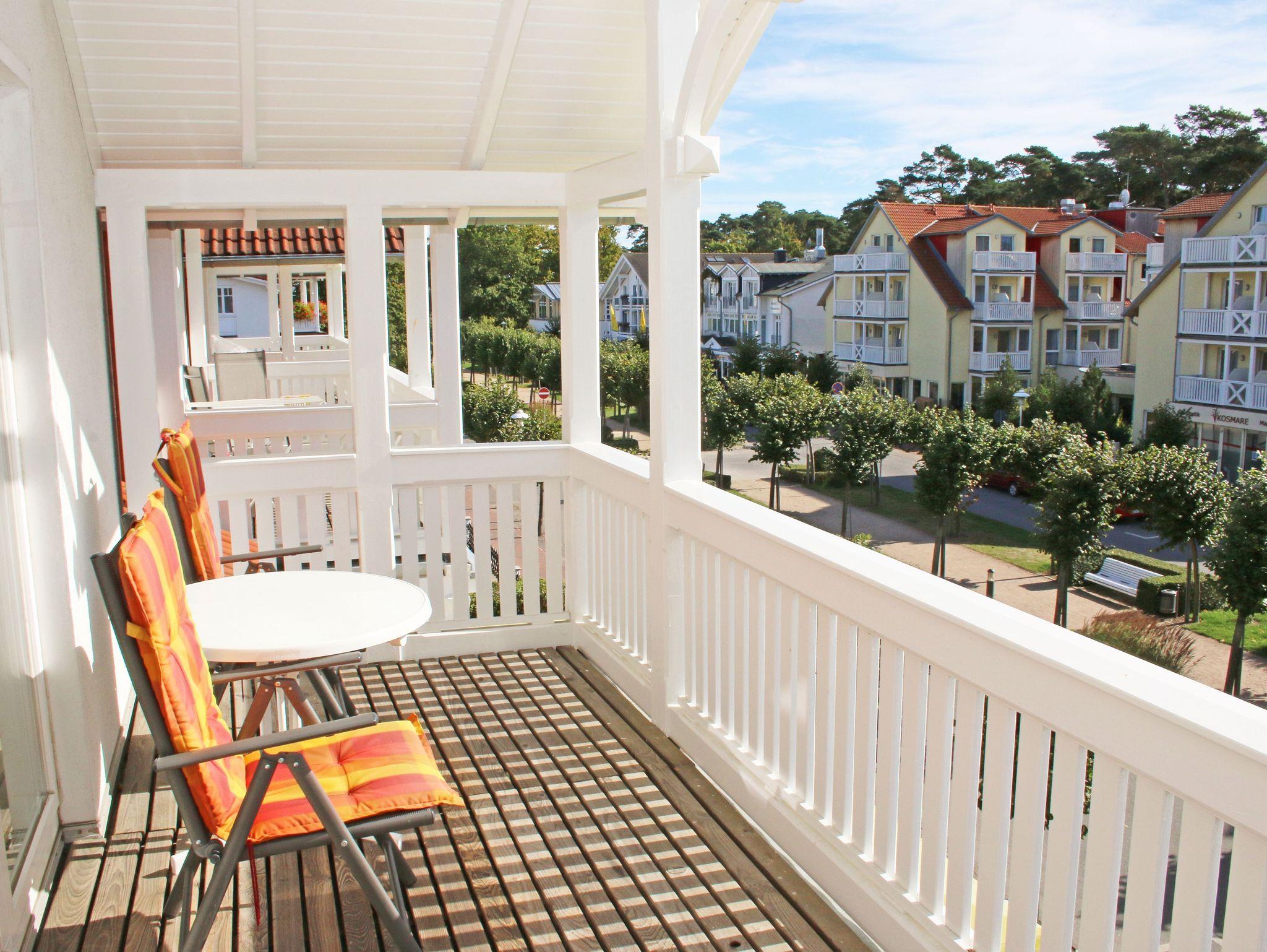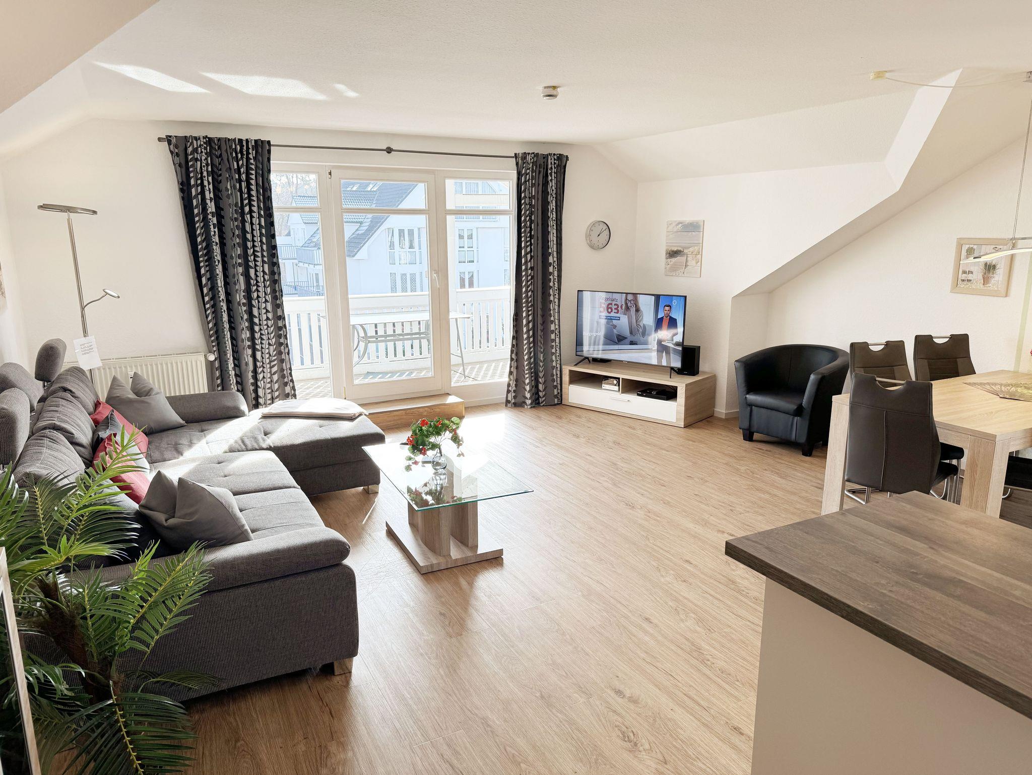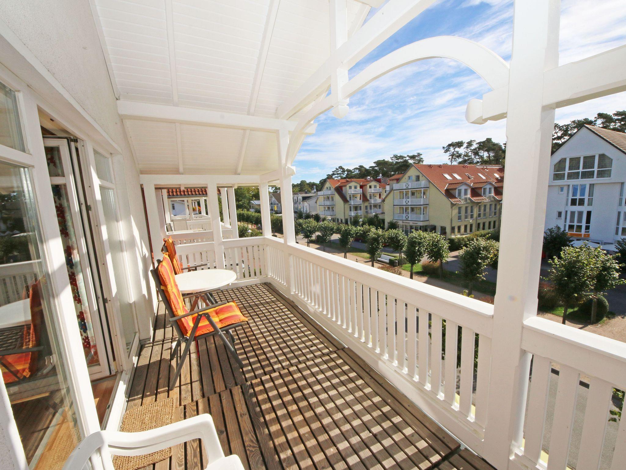 Willkommen in Ihrer perfekten Urlaubsunterkunft! Diese freundliche Nichtraucherwohnung im Dachgeschoss bietet Ihnen auf ca. 70 m² Platz für max. 2 bis 5 Personen und ist ideal für Familien oder Paare. Alle Räumlichkeiten erreichen Sie vom Flur, welcher mit einer Garderobe und einem Schuhschrank ausgestattet ist. Der großzügige Wohnbereich verfügt über eine Couchecke (Aufbettung für 5. Person, 1,50m x 2,25m), einen Couchtisch, eine Leselampe, ein TV-Board mit Smart-TV, ein Blu-Ray-Player, eine Mini-Stereo-Anlage, eine bestuhlte Essecke sowie die integrierte Küchenzeile. Die vollausgestattete Küchenzeile bietet Ihnen alles, was Sie für die Selbstverpflegung brauchen: ein Geschirrspüler, eine Mikrowelle, eine Spüle, ein Kühlschrank mit Eisfach, ein 4-Zonen-Ceranfeld, ein Backofen, ein Wasserkocher, eine Kaffeemaschine, einen Toaster sowie viele kleine Küchenhelfer. Vom Wohnbereich gelangen Sie auf den großzügigen, überdachten und bestuhlten Balkon (Süd/West) von wo Sie einen weiten Blick auf die Flaniermeile von Baabe haben. Das große Schlafzimmer ist mit einem Doppelbett (getrennten Matratzen je 0,90m x 2,00m), Nachttischablagen mit Beleuchtung, einem großen Kleiderschrank sowie Ablageflächen versehen. Zudem haben Sie auch hier einen Zugang auf den seitlichen Westbalkon. Das kleine Schlafzimmer ist mit einem Tandem Bett (2x 0,80m x 2,00m), einer Ablagefläche mit Beleuchtung und einer Kommode mit Flachbild-TV ausgestattet. Beide Schlafzimmer können abgedunkelt werden. Das geflieste Tageslicht-Bad verfügt über eine Dusche mit flachem Einstieg, ein WC, einen Fön, einen Waschtisch, Ablageflächen sowie eine Waschmaschine mit Trocknerfunktion. Im gesamten Wohnbereich wurde Vinylboden in Dielenoptik verlegt. Auch in Ihrem Urlaub brauchen Sie auf einen Internetzugang (WLAN) nicht verzichten, dieser ist für Sie inklusive. Ein PKW-Stellplatz Nr. 05 steht hinter dem Haus zur Verfügung. Haustiere sind in der Wohnung nicht erlaubt. Die Erstausstattung eines Wäschepaketes (komplette Bettwäsche, 1 Duschhandtuch, 1 kleines Handtuch) können Sie bis 14 Tage vor Anreise gegen einen Aufpreis dazu buchen oder durch eigenes Ergänzen. Ab 2 gebuchten Paketen erhalten Sie einmalig 1 Geschirrhandtuch und 1 Duschvorleger hinzu. Buchen Sie jetzt Ihre Auszeit in unserer Ferienwohnung und erleben Sie unvergessliche Tage an der Ostsee! Wir freuen uns auf Ihren Besuch!