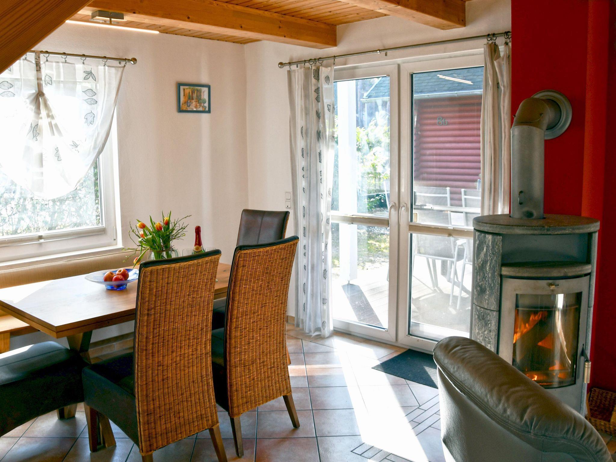Im Erdgeschoss dominiert das geräumige Wohn- und Esszimmer mit integrierter Küchenzeile, Kaminofen und vorgelagerter Terrasse. Für mediale Unterhaltung sorgen ein großformatiger Flatscreen-TV und kostenfreies W-LAN, auch eine kleine Buch- und Spieleauswahl ist vorhanden.