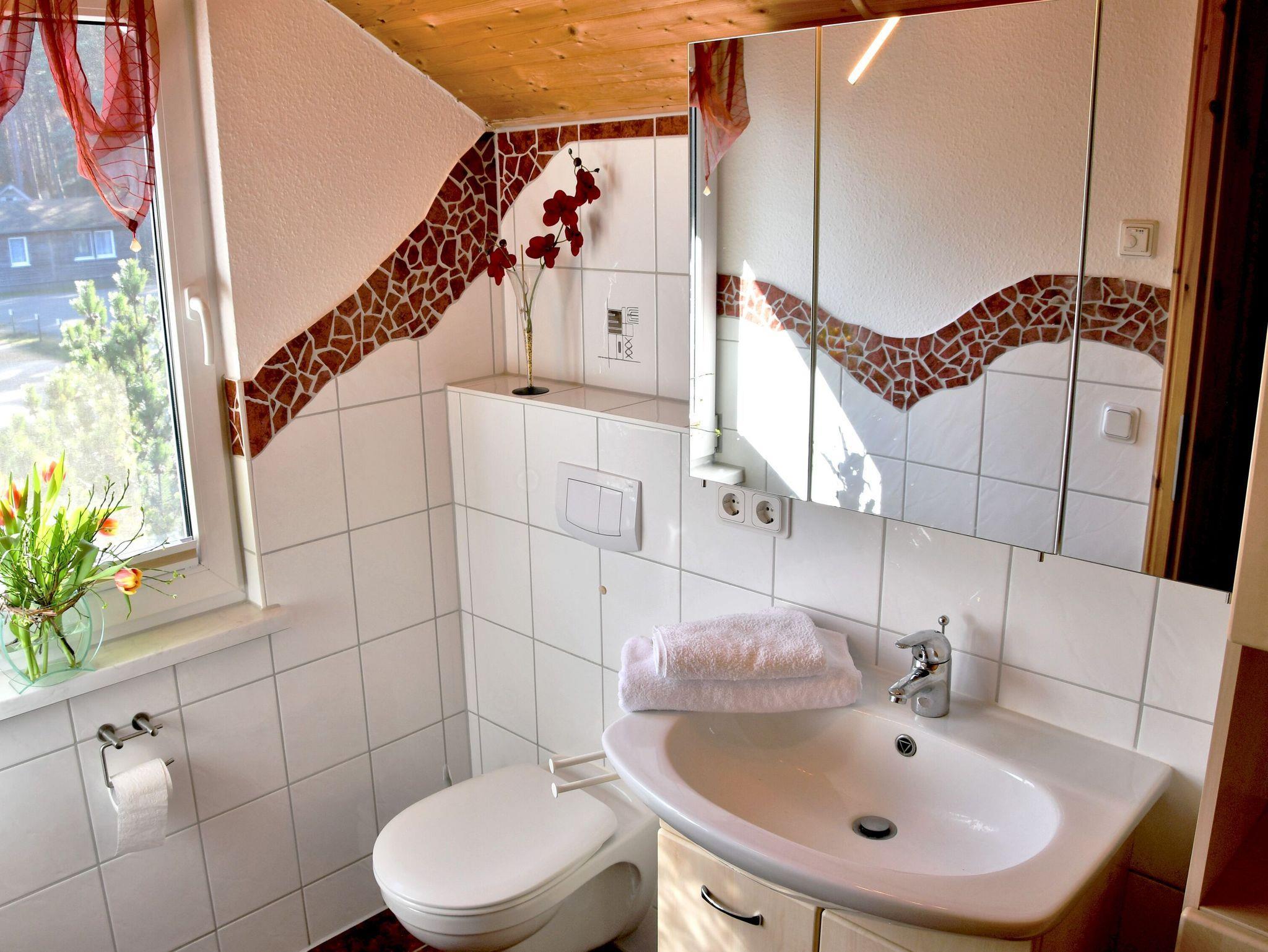 Damit es auch bei voller Hütte immer ganz entspannt zugeht, gibt es im Ober- und im Untergeschoss jeweils ein Bad mit Dusche/WC und Waschtisch.