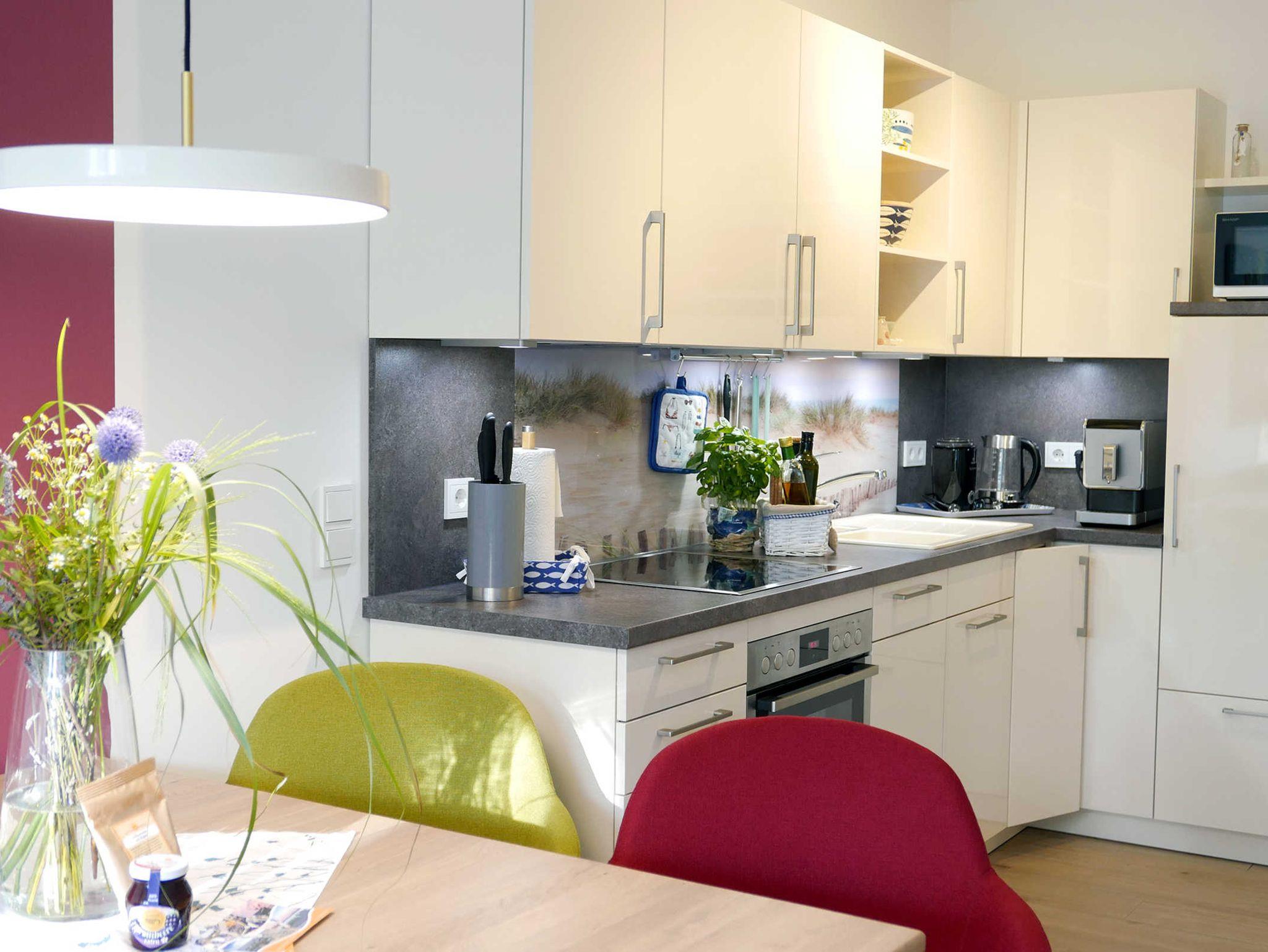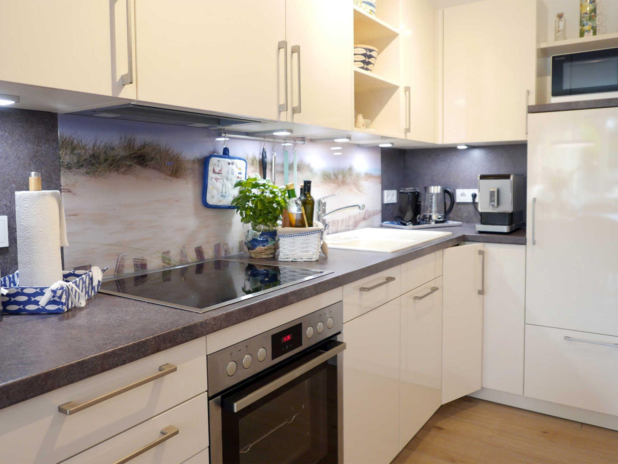 Die hochwertig eingerichtete Küchenzeile verfügt selbstverständlich über Standardgeräte, wie zum Beispiel einen Herd, einen Kühlschrank mit Gefrierfach, einen Geschirrspüler, einen Backofen, aber auch über einen Kaffeevollautomat sowie einen elektrischen Milchaufschäumer.